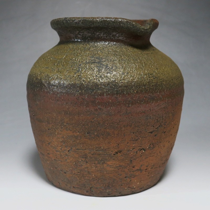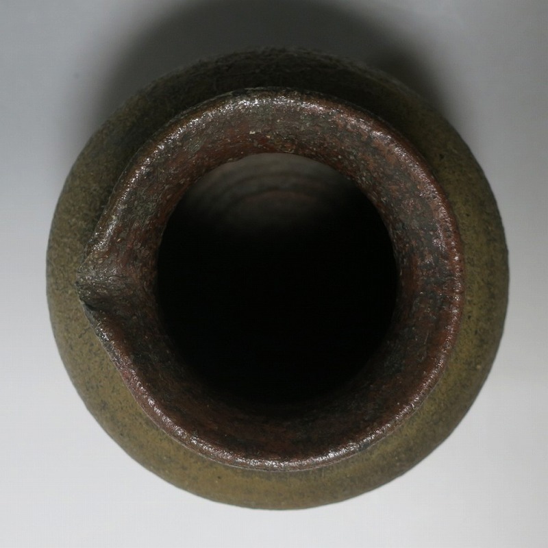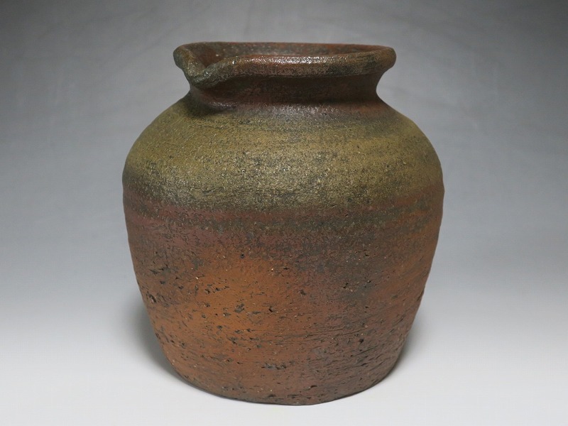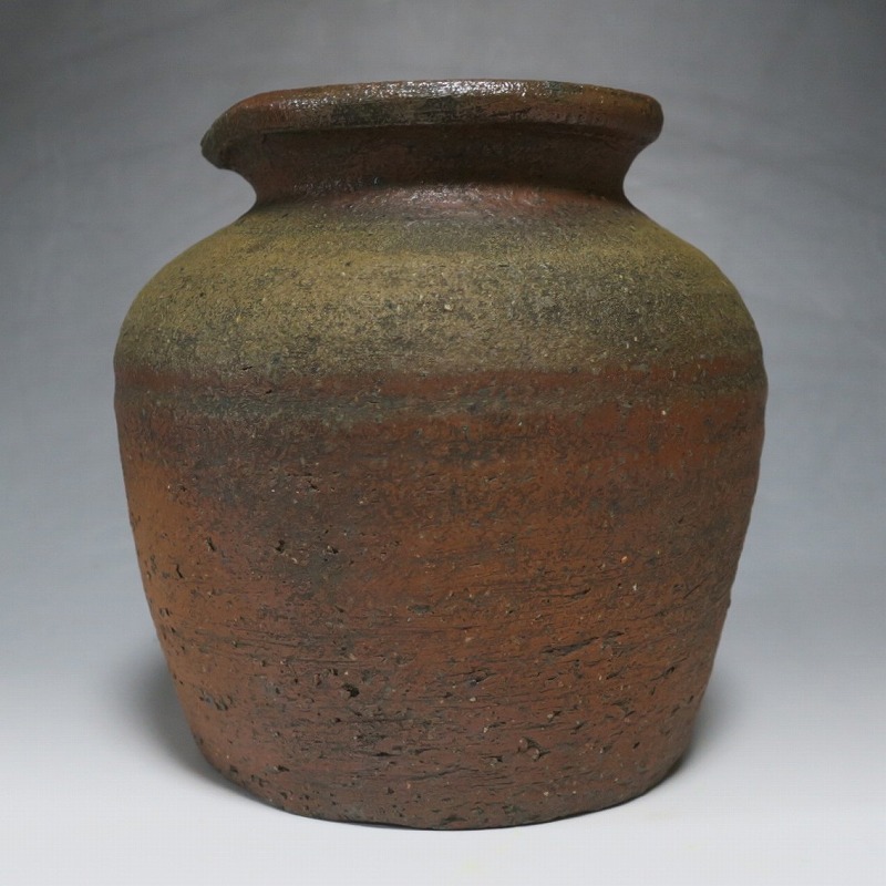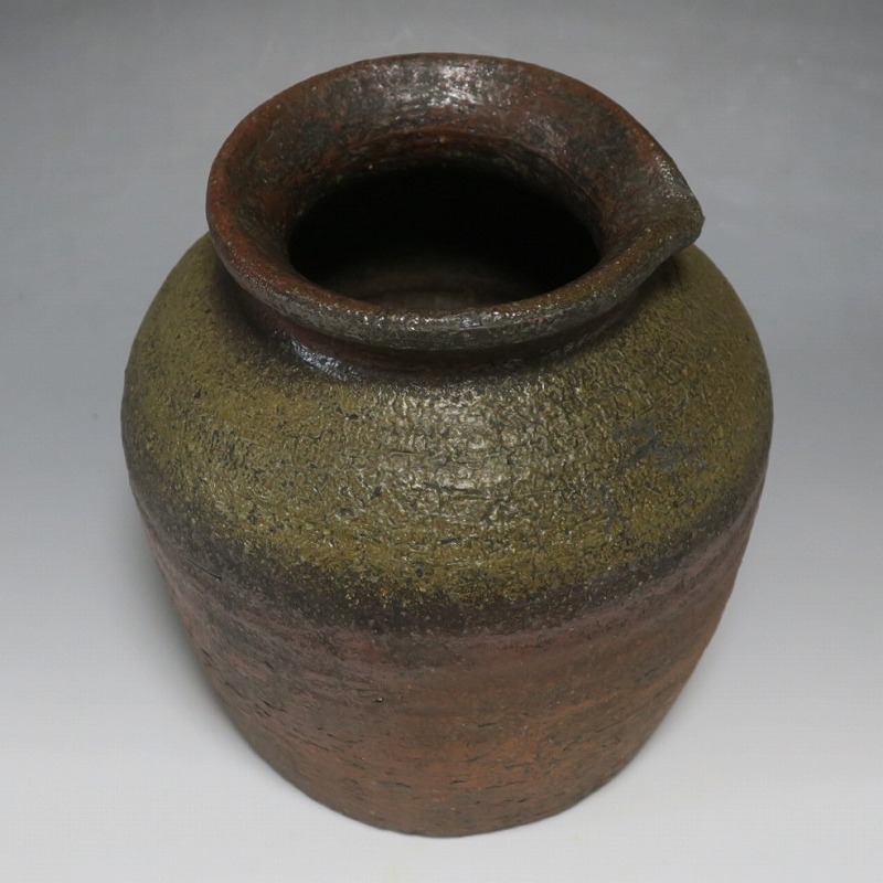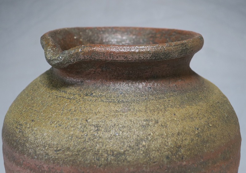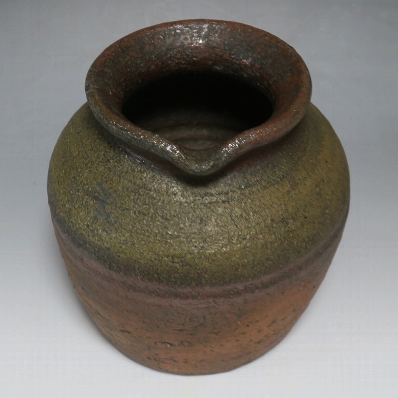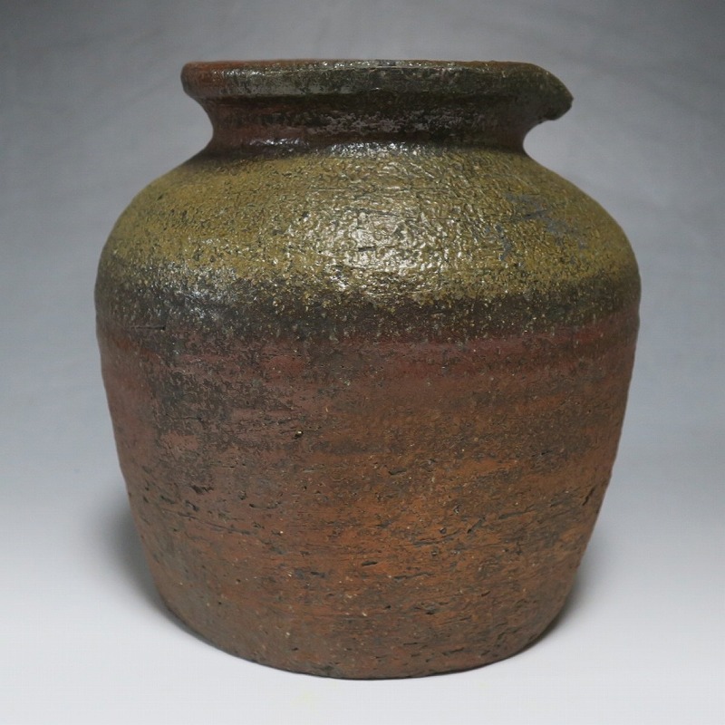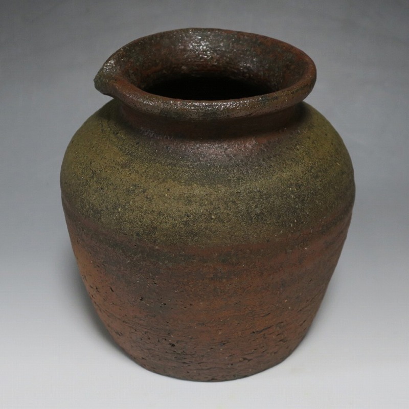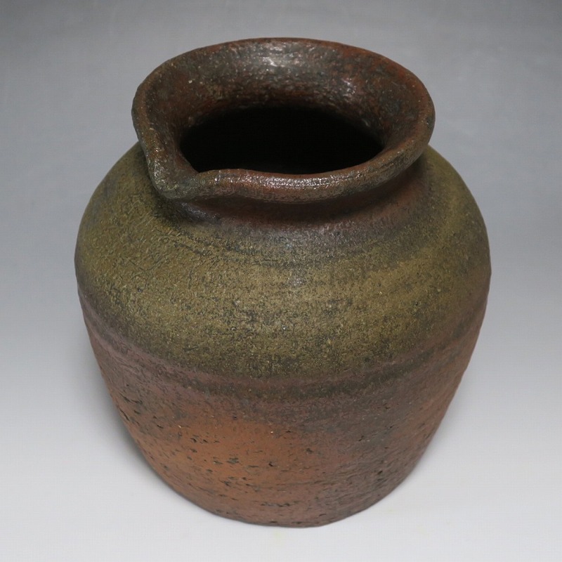 高さ 約17.9cm/胴径 約17.5cm 窯傷はありますが、総じて良い状態です。状態は写真でご確認ください。 備前焼は、古代から吉備で作られていた須恵器の流れを汲んだb器です。中世時代は六古窯の一つ、桃山時代は茶陶を作る窯として栄え、現在に至っています。本品は江戸時代後期に作られた鳶口のついた壺。日本酒などを保存する容器だったと考えられます。備前焼は献上品、茶道具、細工物などの工芸品が多く、本品のような民芸調の作品はあまり作られていません。肩部に美しい胡麻釉が掛かった上品な感じの片口壺です。花器の他、柄杓を使用すると焼酎、日本酒器として使用できます。 | ||