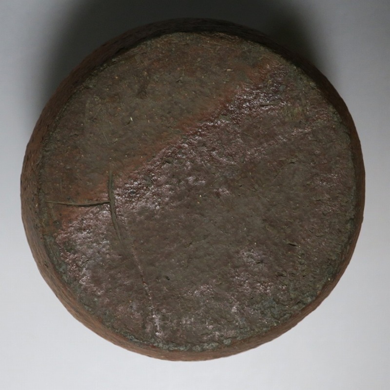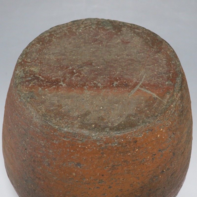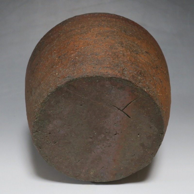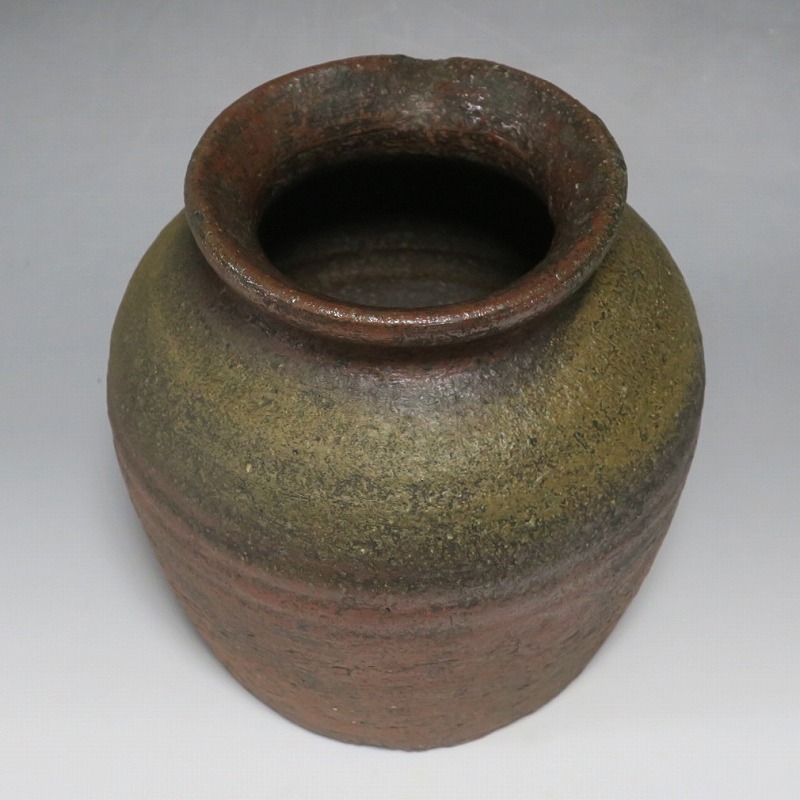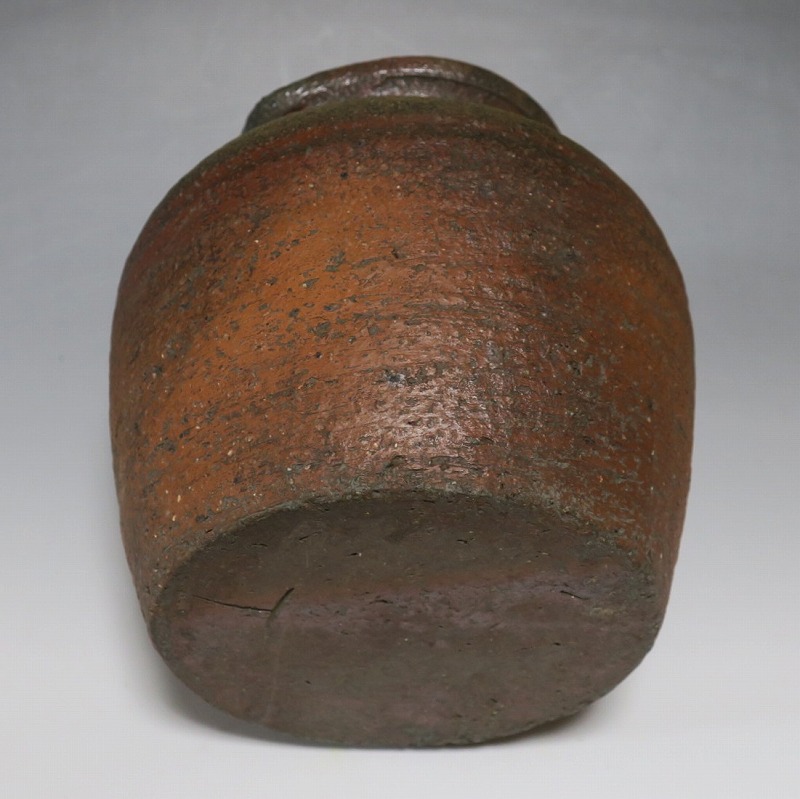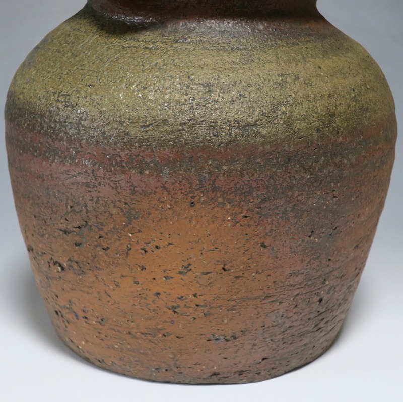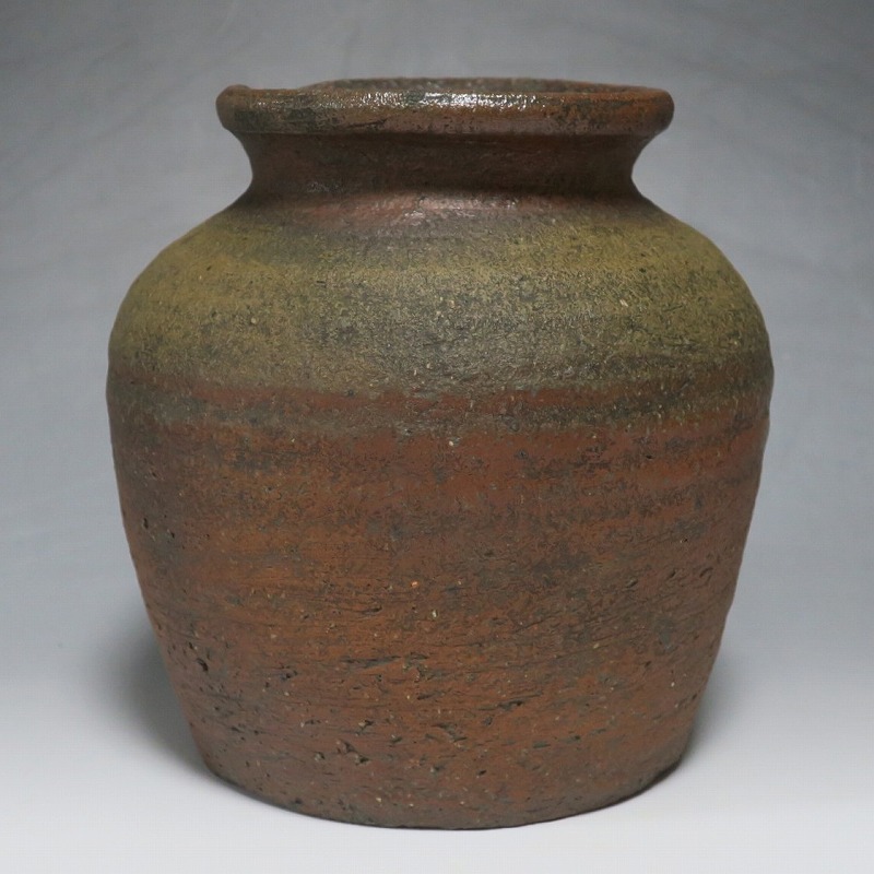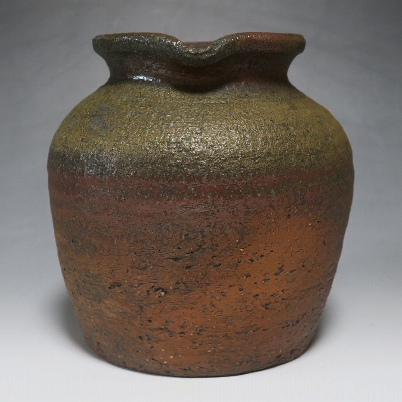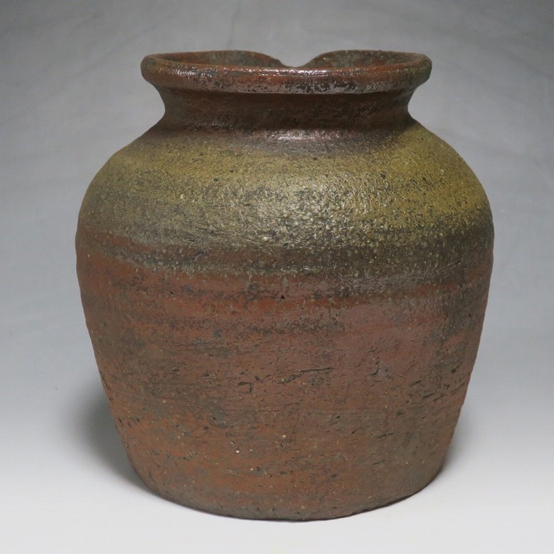 高さ 約17.9cm/胴径 約17.5cm 窯傷はありますが、総じて良い状態です。状態は写真でご確認ください。 備前焼は、古代から吉備で作られていた須恵器の流れを汲んだb器です。中世時代は六古窯の一つ、桃山時代は茶陶を作る窯として栄え、現在に至っています。本品は江戸時代後期に作られた鳶口のついた壺。日本酒などを保存する容器だったと考えられます。備前焼は献上品、茶道具、細工物などの工芸品が多く、本品のような民芸調の作品はあまり作られていません。肩部に美しい胡麻釉が掛かった上品な感じの片口壺です。花器の他、柄杓を使用すると焼酎、日本酒器として使用できます。 | ||