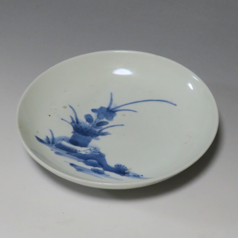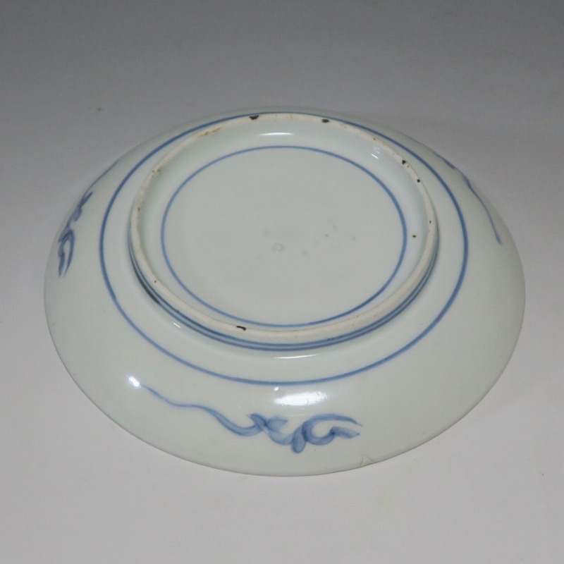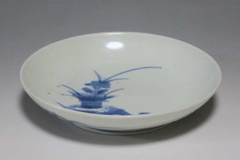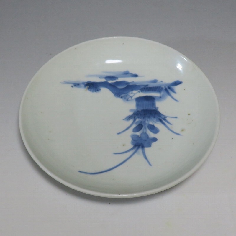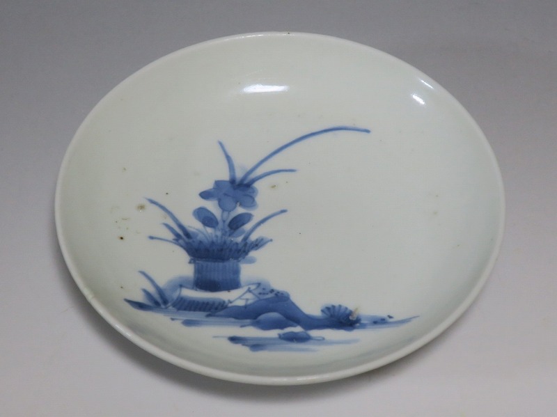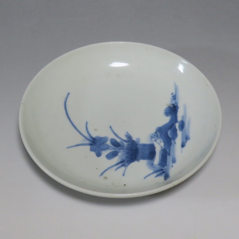 (江戸時代前期 17世紀後半) 商品番号 3991 口径 約12.5cm/高さ 約2.5cm/高台径 約7.5cm 口辺から約3cmのニュウ、4mmの直し、若干のフリモノや使用による擦り傷があります。状態は写真でご確認ください。 藍九谷焼は、初期伊万里時代を経た1650年代に有田周辺で製作された伊万里焼の総称です。初期伊万里は中国磁器の写しですが、藍九谷時代には和風柄が主流となりました。本品は柿右衛門窯で製作された藍九谷の植物文の小皿。余白を活かした洒落た作品です。直しがありますが食器として使用できます。料理を盛ると映えそうな可愛い小皿。インテリア、食器としてお楽しみください。 | ||