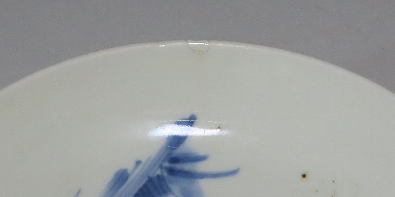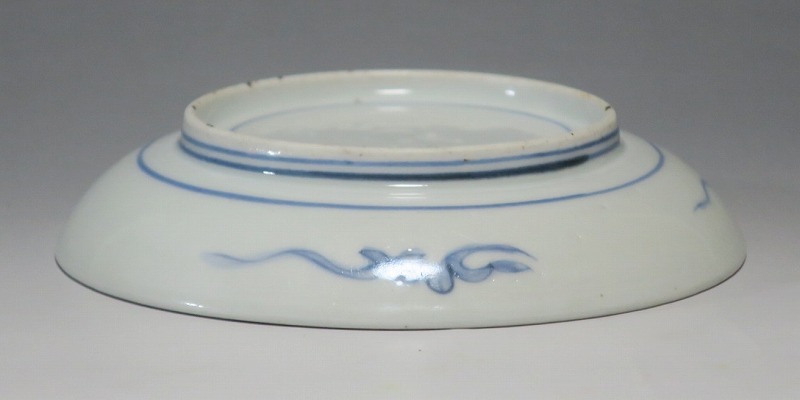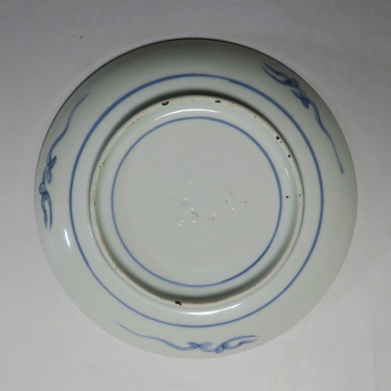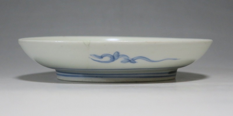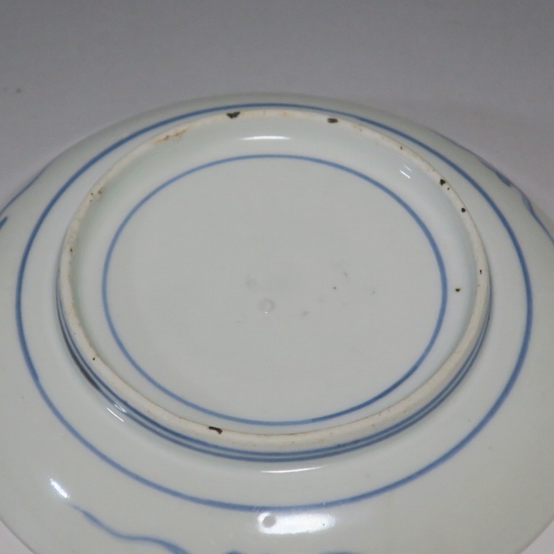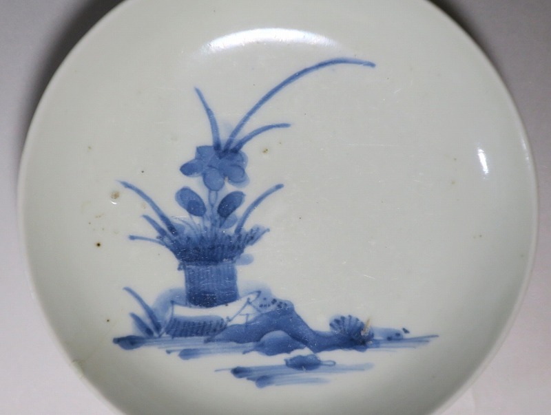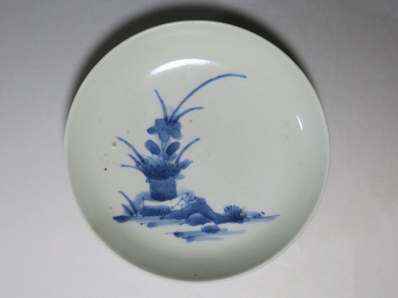 (江戸時代前期 17世紀後半) 商品番号 3991 口径 約12.5cm/高さ 約2.5cm/高台径 約7.5cm 口辺から約3cmのニュウ、4mmの直し、若干のフリモノや使用による擦り傷があります。状態は写真でご確認ください。 藍九谷焼は、初期伊万里時代を経た1650年代に有田周辺で製作された伊万里焼の総称です。初期伊万里は中国磁器の写しですが、藍九谷時代には和風柄が主流となりました。本品は柿右衛門窯で製作された藍九谷の植物文の小皿。余白を活かした洒落た作品です。直しがありますが食器として使用できます。料理を盛ると映えそうな可愛い小皿。インテリア、食器としてお楽しみください。 | ||