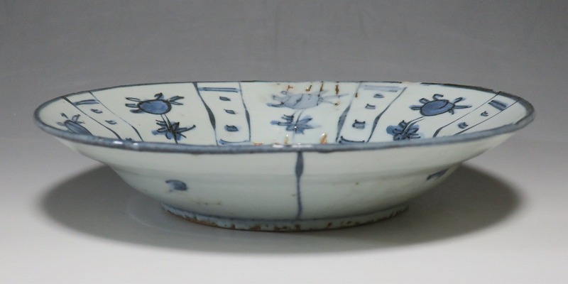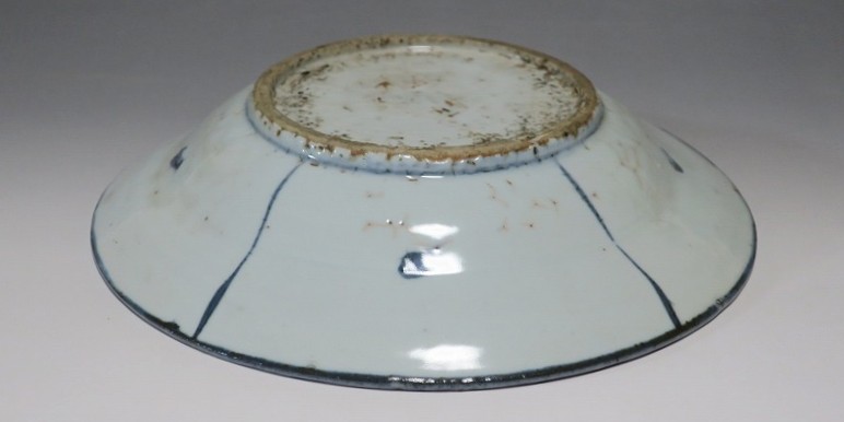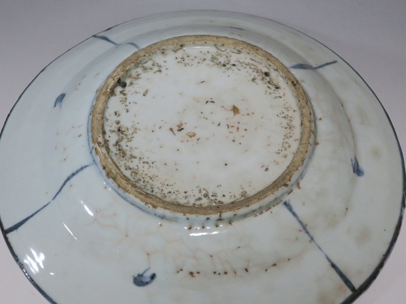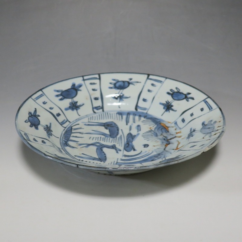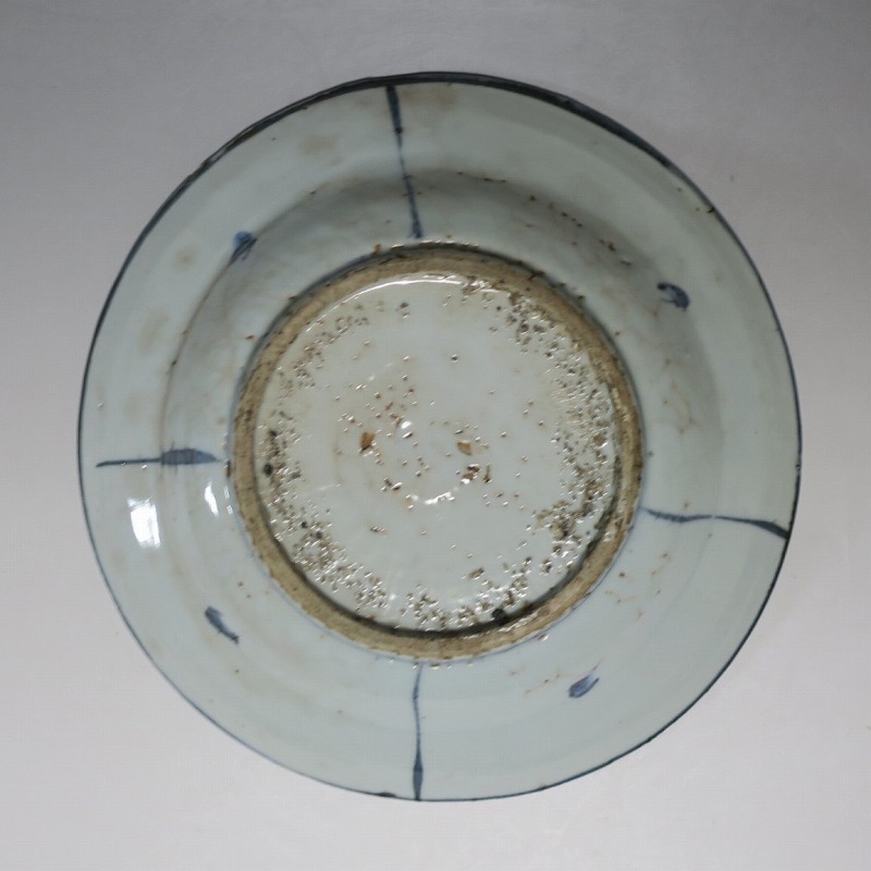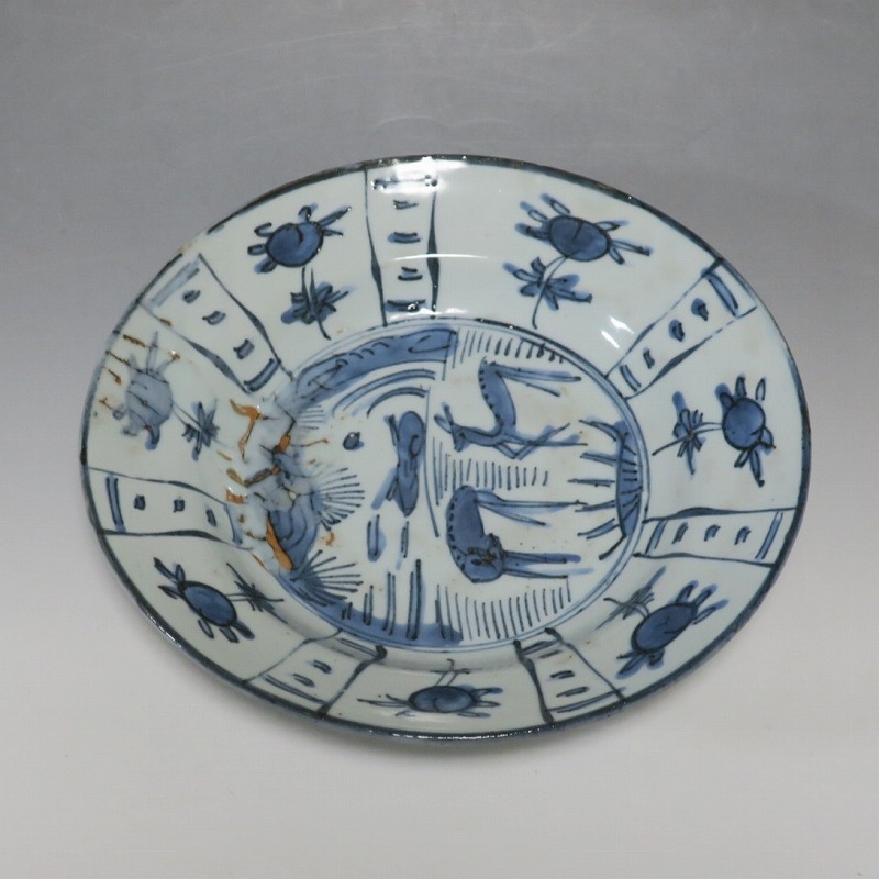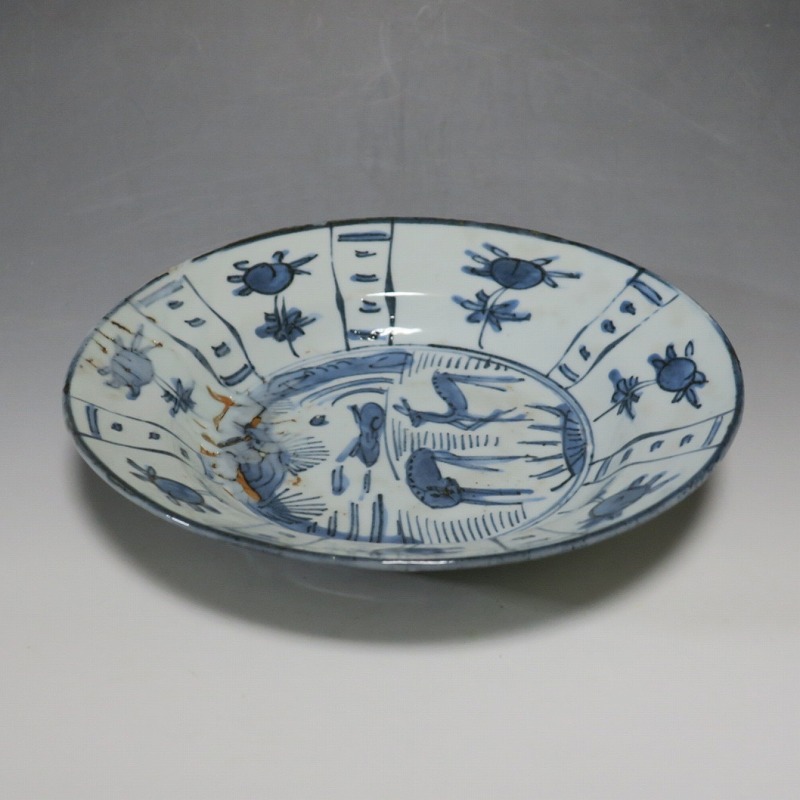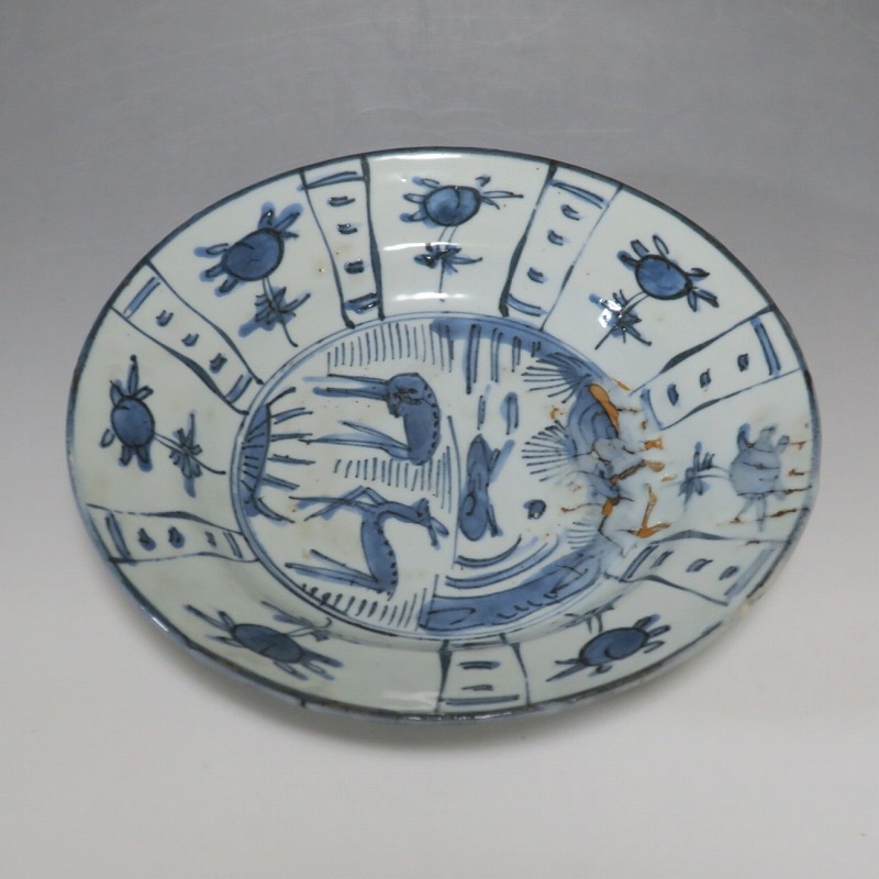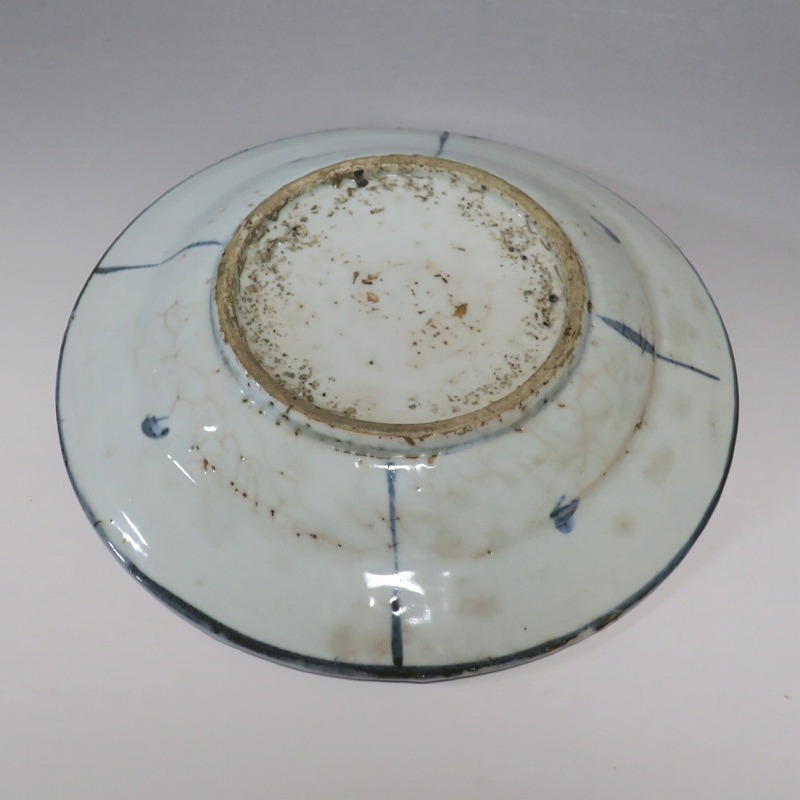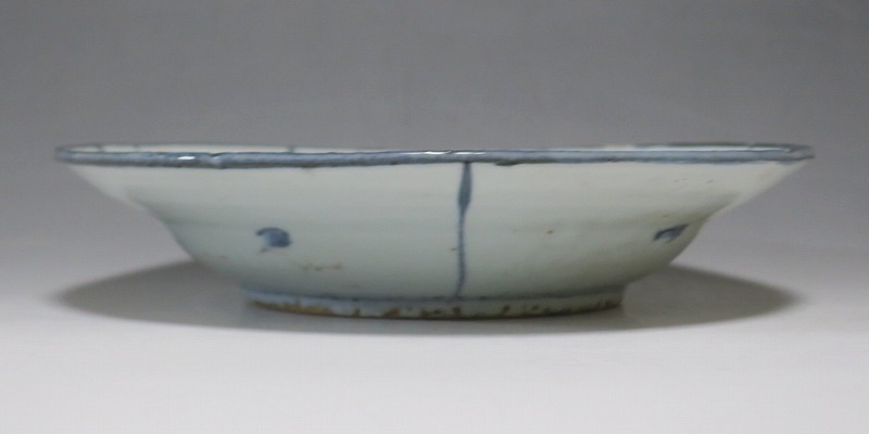 (明時代末期 17世紀中頃) 商品番号 3993 口径 約21.3cm/高さ 約4.4cm/高台径 約10.8cm 表の一部に釉ハゲがありますが、総じて良い状態です。状態は写真でご確認ください。 古染付は明時代末期、日本の茶道家たちの好みを反映して景徳鎮で作られた磁器です。 以前、中国人の古美術品収集家は「虫食い」が理解できず、古染付を敬遠していましたが、最近はその良さを認識したようで人気が高まっています。本品は芙蓉手に可愛らしい鹿文が描かれた七寸皿。伸びやかな筆使いで絵付けがされています。見込みにある釉ハゲも景色になるのが、古染付の良さでしょう。古染付の皿に料理を盛ると映えます。インテリア、食器としてお楽しみください。 | ||