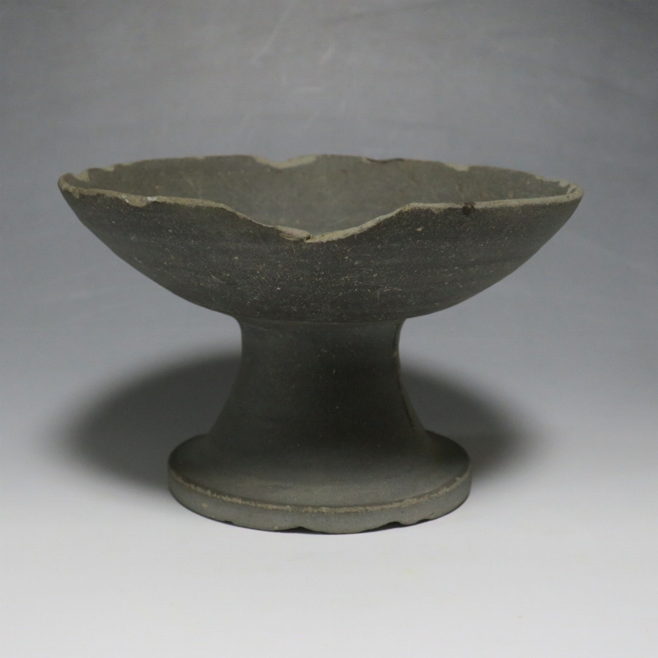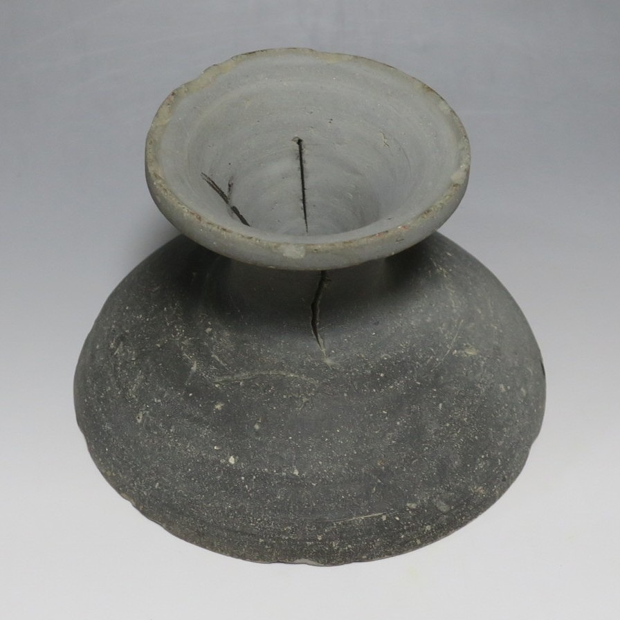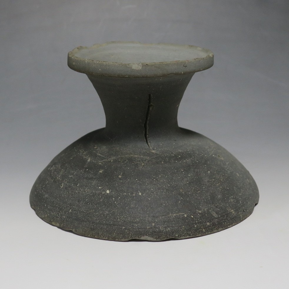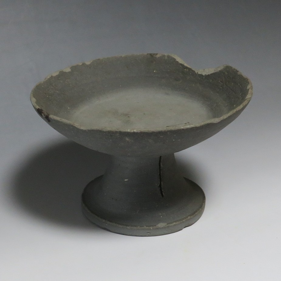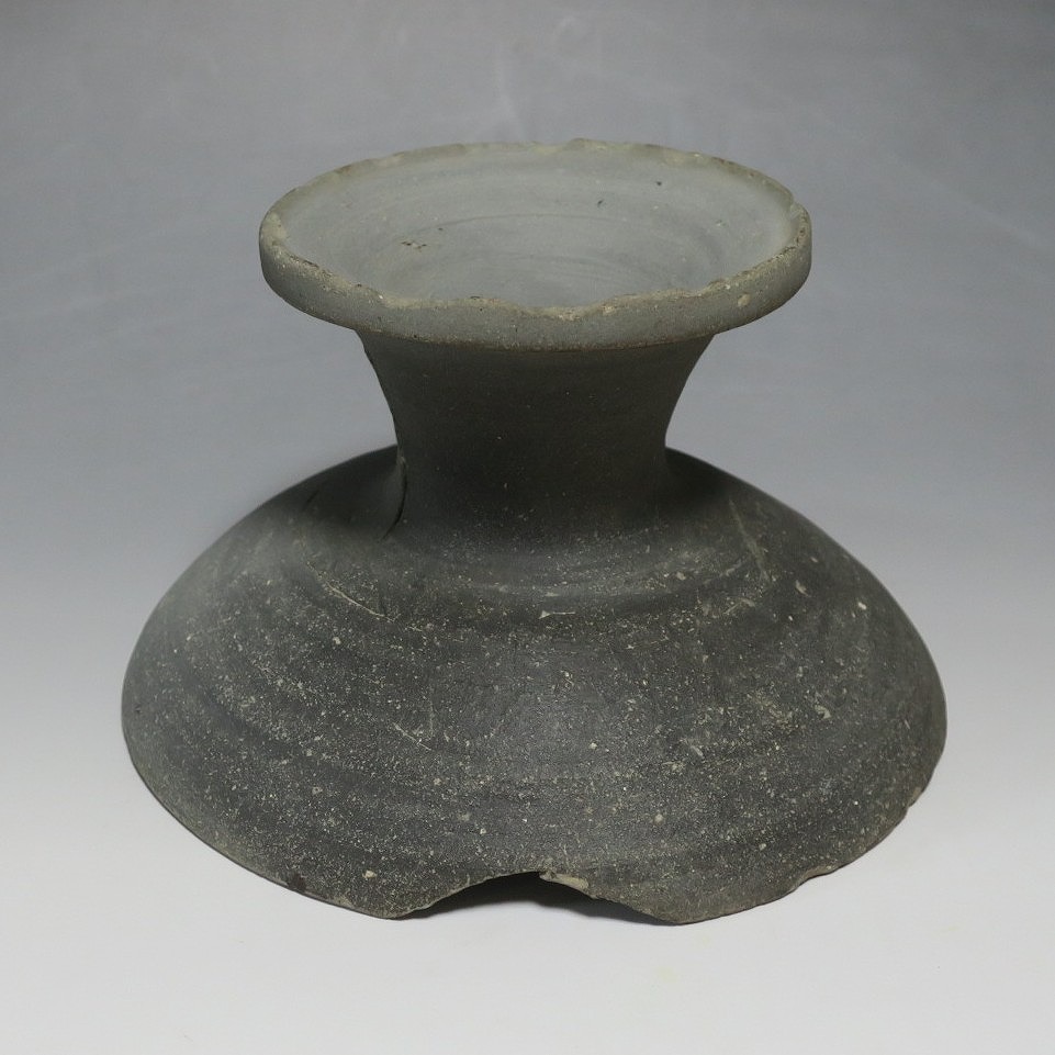 (飛鳥時代 7世紀) 商品番号 4000 高さ 約10.4cm/口径 約16.7cm/高台径 約10cm 口辺や高台に欠けがあります。状態は写真でご確認ください。 須恵器は4世紀頃、朝鮮半島で焼き始められた硬質陶器(b器)で4世紀後半に日本へ伝来しました。その多くは朝鮮半島南部の伽耶から輸入され、5世紀中頃には日本でも生産が始まります。本品は6世紀に作られた高坏。無蓋の作品です。土質を見ると日本で製作された須恵器だと考えられます。飾ると飛鳥時代の豪族の生活を感じることができます。栗や木の実を乗せると季節感が出るでしょう。インテリアとしてお楽しみください。 | ||