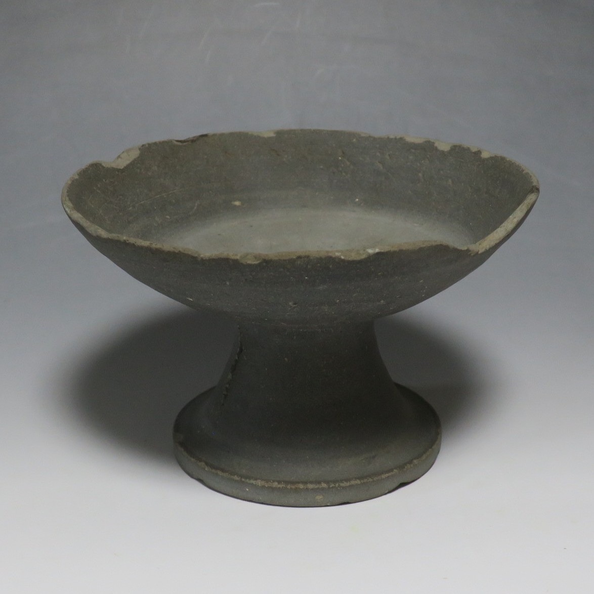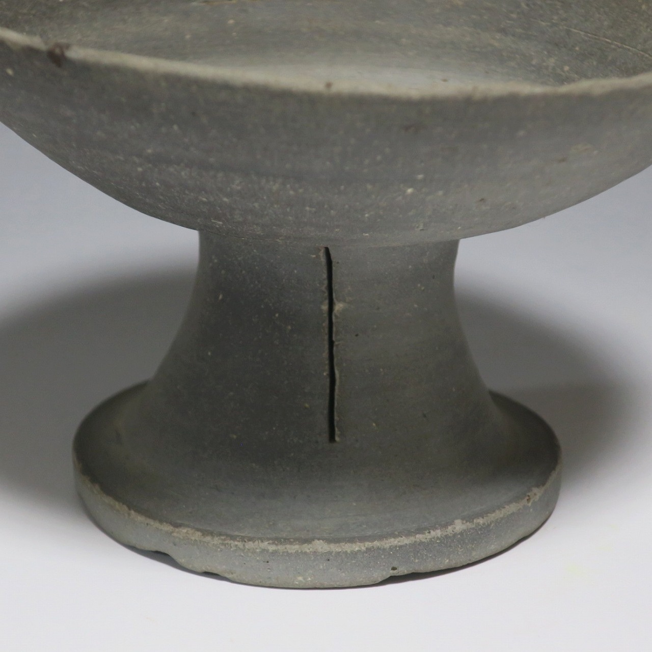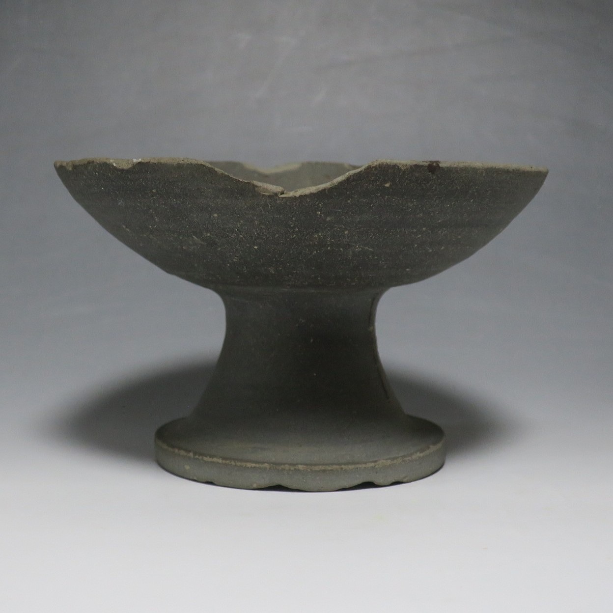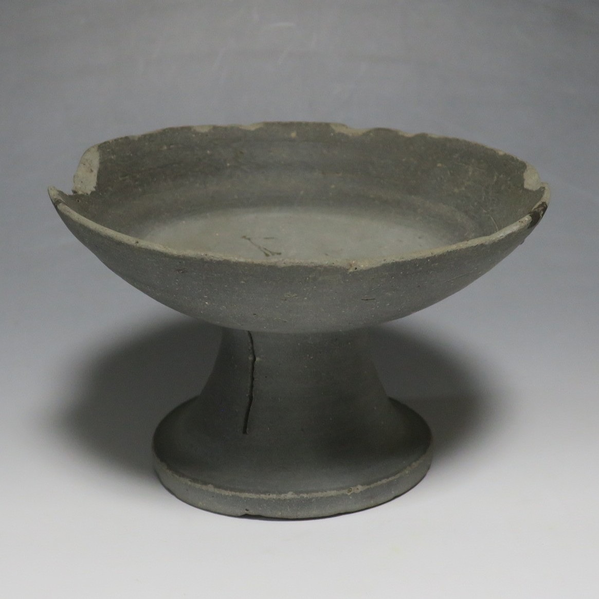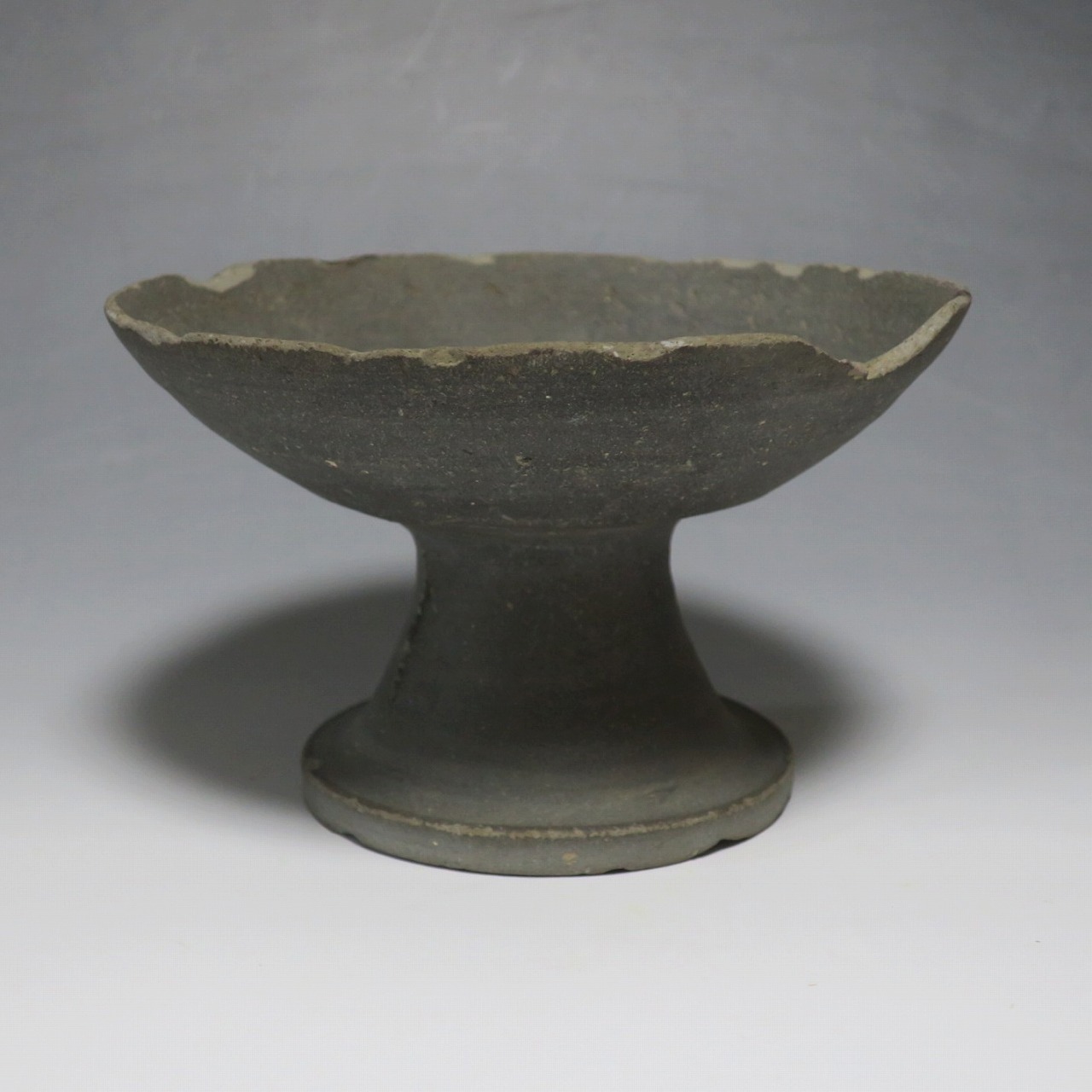 (飛鳥時代 7世紀) 商品番号 4000 高さ 約10.4cm/口径 約16.7cm/高台径 約10cm 口辺や高台に欠けがあります。状態は写真でご確認ください。 須恵器は4世紀頃、朝鮮半島で焼き始められた硬質陶器(b器)で4世紀後半に日本へ伝来しました。その多くは朝鮮半島南部の伽耶から輸入され、5世紀中頃には日本でも生産が始まります。本品は6世紀に作られた高坏。無蓋の作品です。土質を見ると日本で製作された須恵器だと考えられます。飾ると飛鳥時代の豪族の生活を感じることができます。栗や木の実を乗せると季節感が出るでしょう。インテリアとしてお楽しみください。 | ||