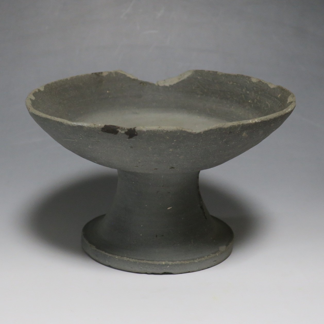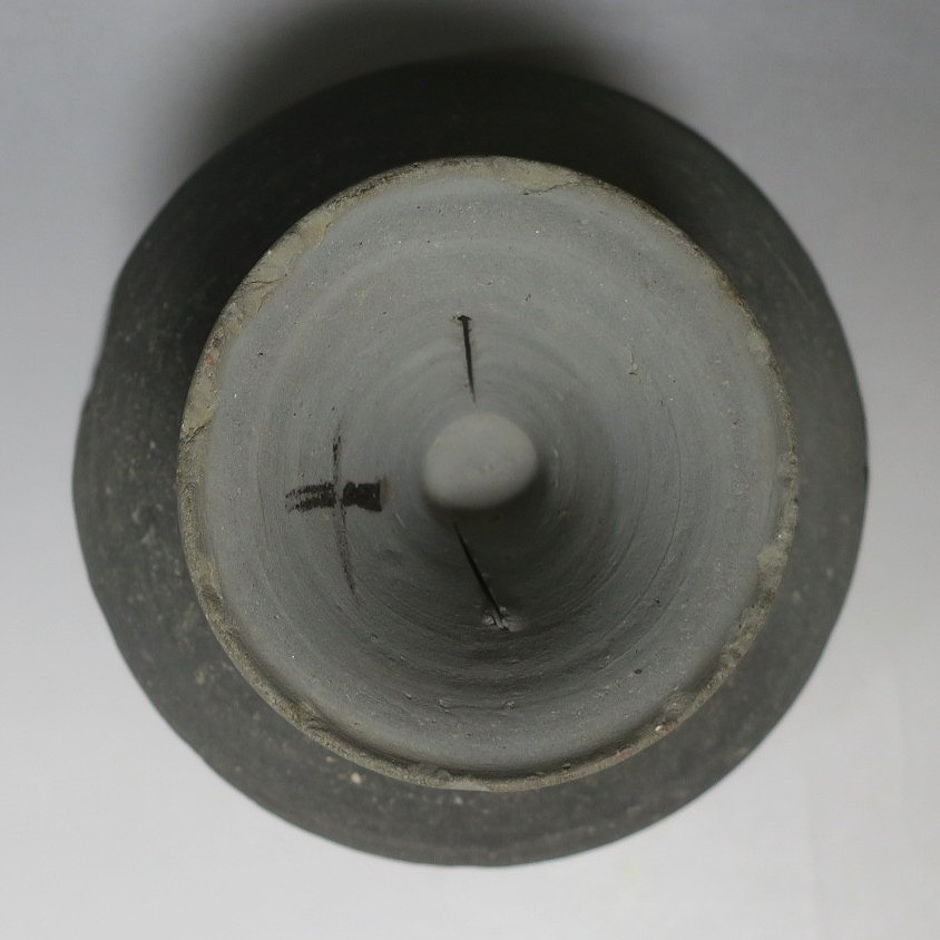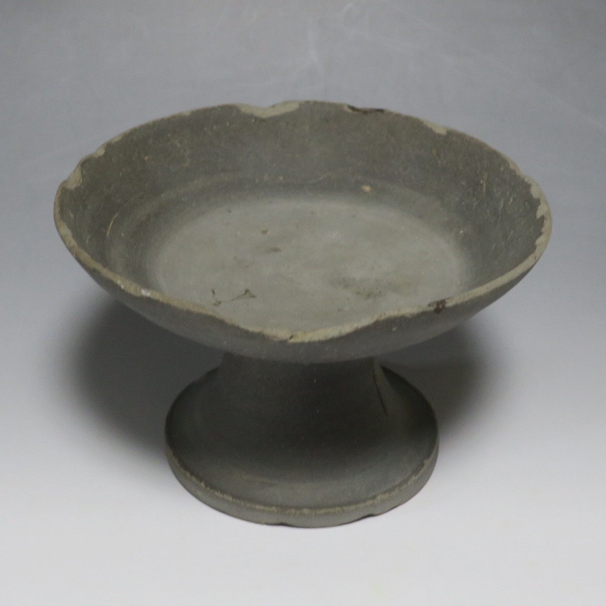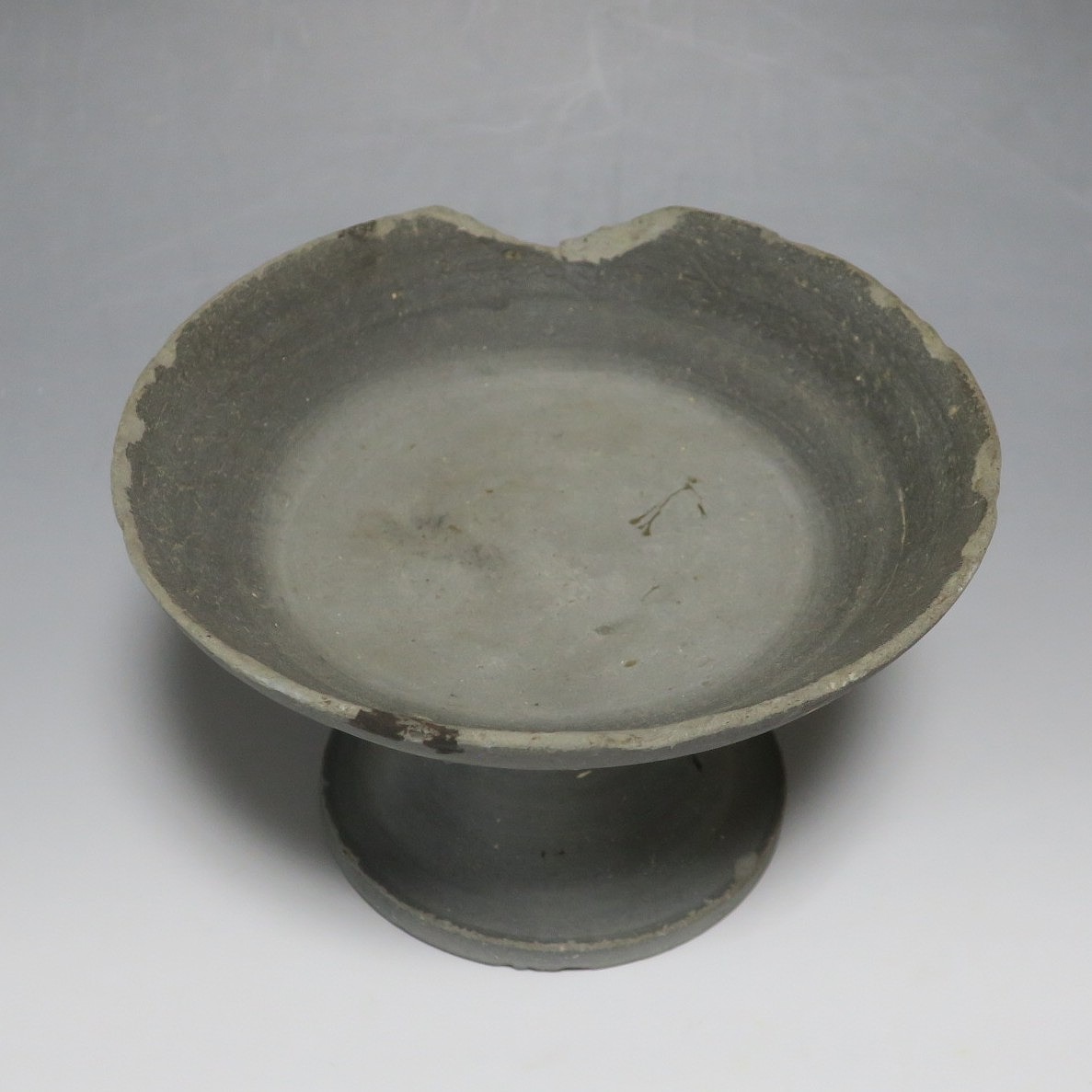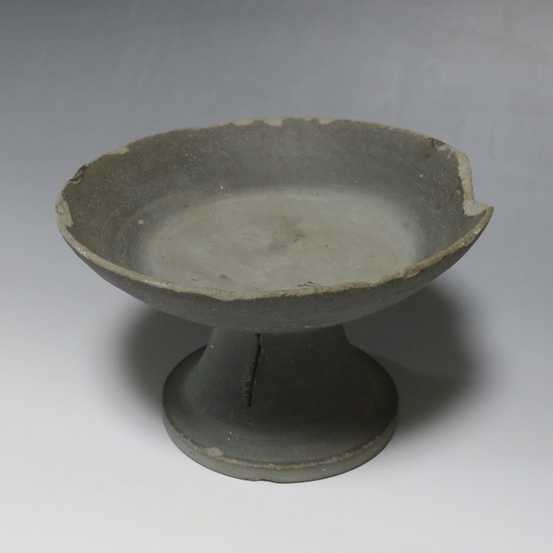 (飛鳥時代 7世紀) 商品番号 4000 高さ 約10.4cm/口径 約16.7cm/高台径 約10cm 口辺や高台に欠けがあります。状態は写真でご確認ください。 須恵器は4世紀頃、朝鮮半島で焼き始められた硬質陶器(b器)で4世紀後半に日本へ伝来しました。その多くは朝鮮半島南部の伽耶から輸入され、5世紀中頃には日本でも生産が始まります。本品は6世紀に作られた高坏。無蓋の作品です。土質を見ると日本で製作された須恵器だと考えられます。飾ると飛鳥時代の豪族の生活を感じることができます。栗や木の実を乗せると季節感が出るでしょう。インテリアとしてお楽しみください。 | ||