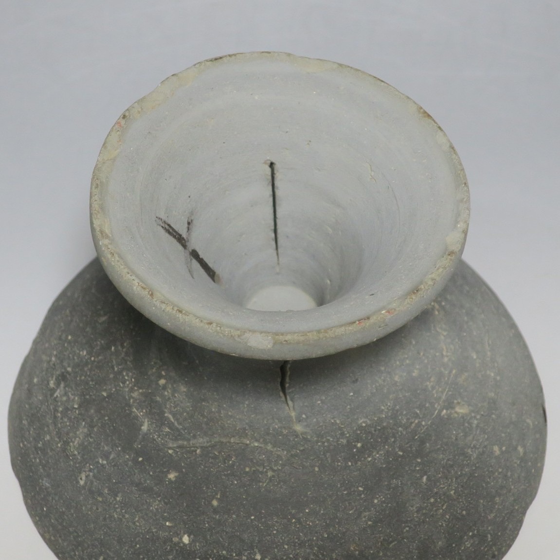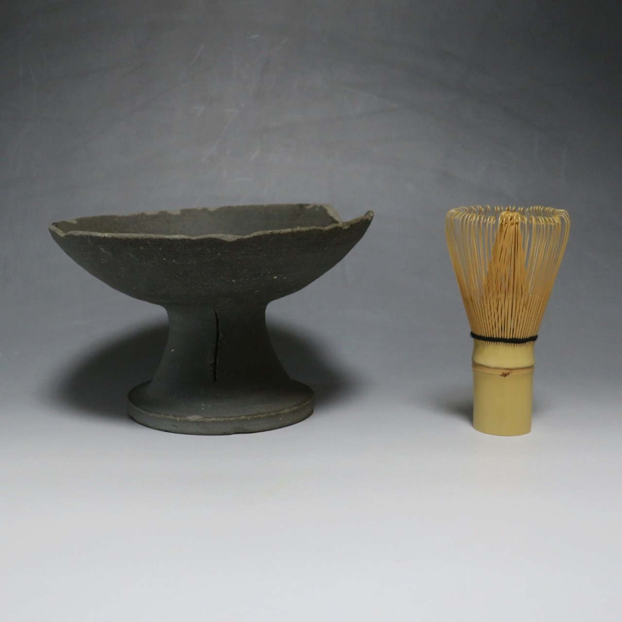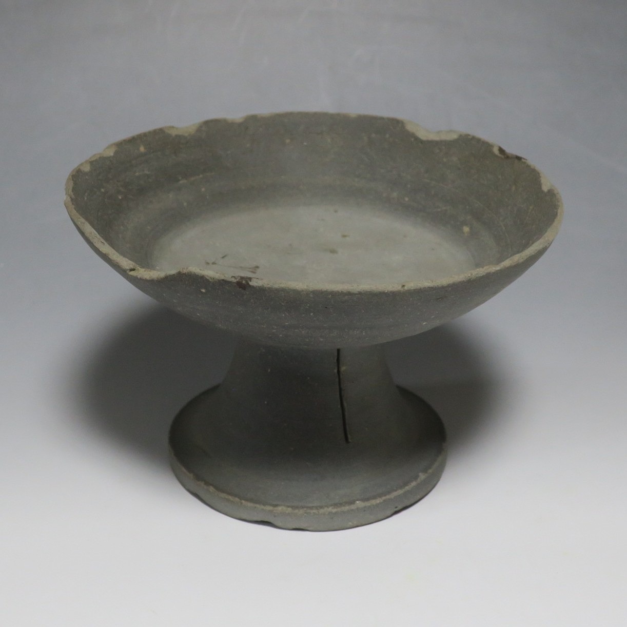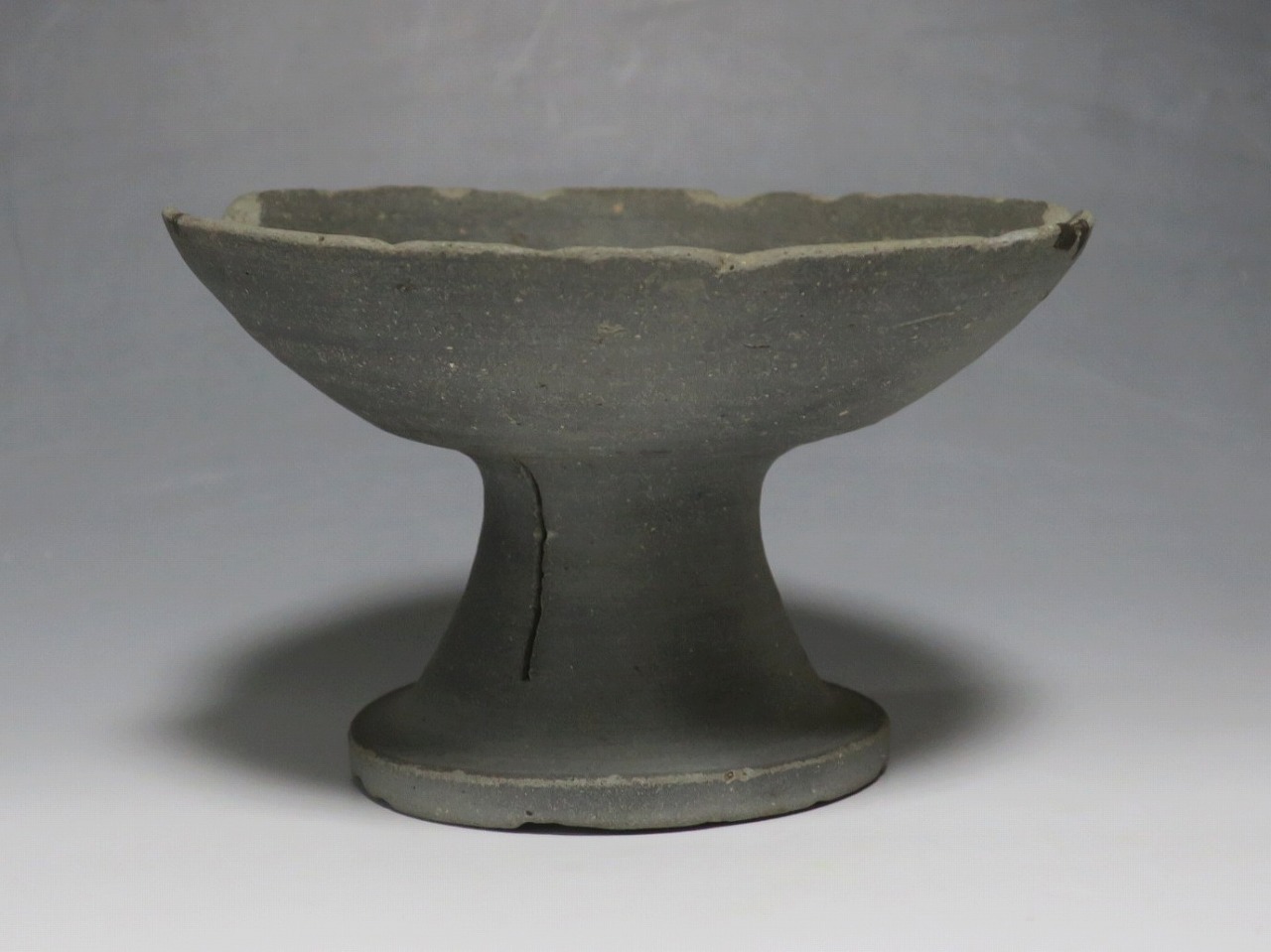 (飛鳥時代 7世紀) 商品番号 4000 高さ 約10.4cm/口径 約16.7cm/高台径 約10cm 口辺や高台に欠けがあります。状態は写真でご確認ください。 須恵器は4世紀頃、朝鮮半島で焼き始められた硬質陶器(b器)で4世紀後半に日本へ伝来しました。その多くは朝鮮半島南部の伽耶から輸入され、5世紀中頃には日本でも生産が始まります。本品は6世紀に作られた高坏。無蓋の作品です。土質を見ると日本で製作された須恵器だと考えられます。飾ると飛鳥時代の豪族の生活を感じることができます。栗や木の実を乗せると季節感が出るでしょう。インテリアとしてお楽しみください。 | ||