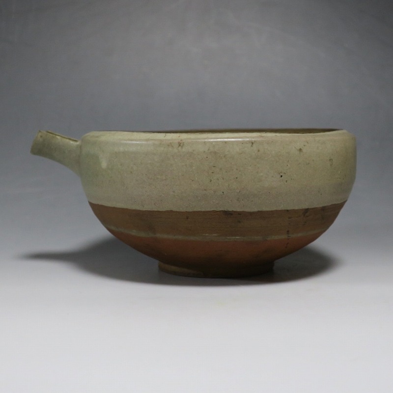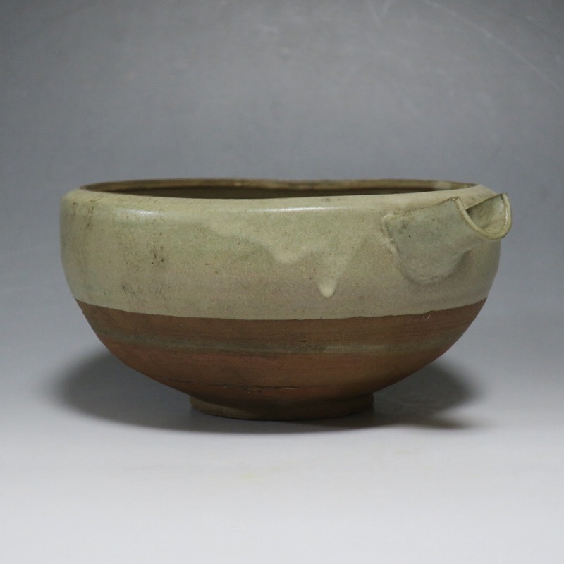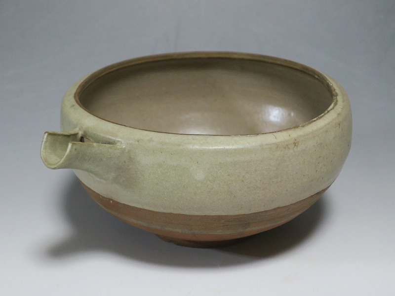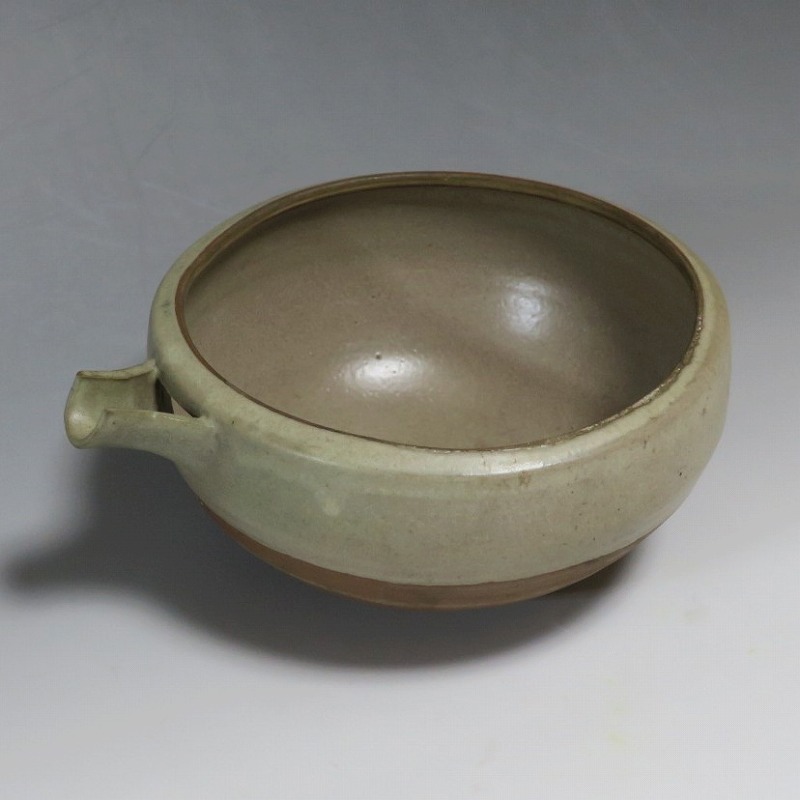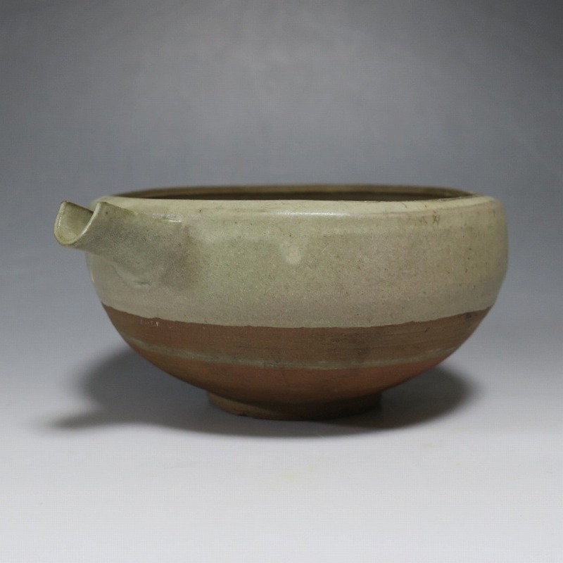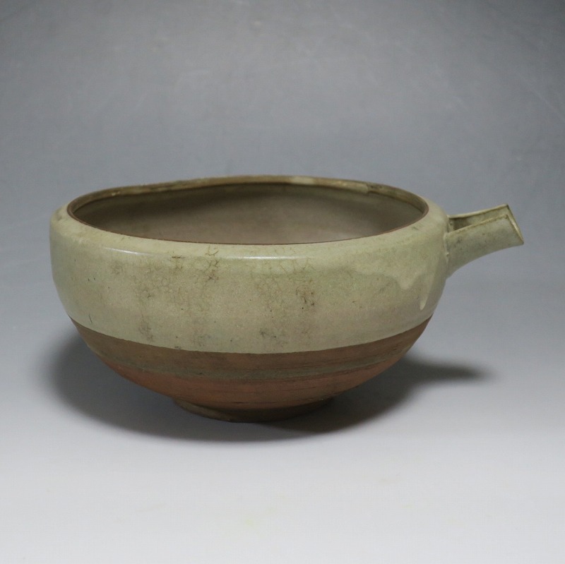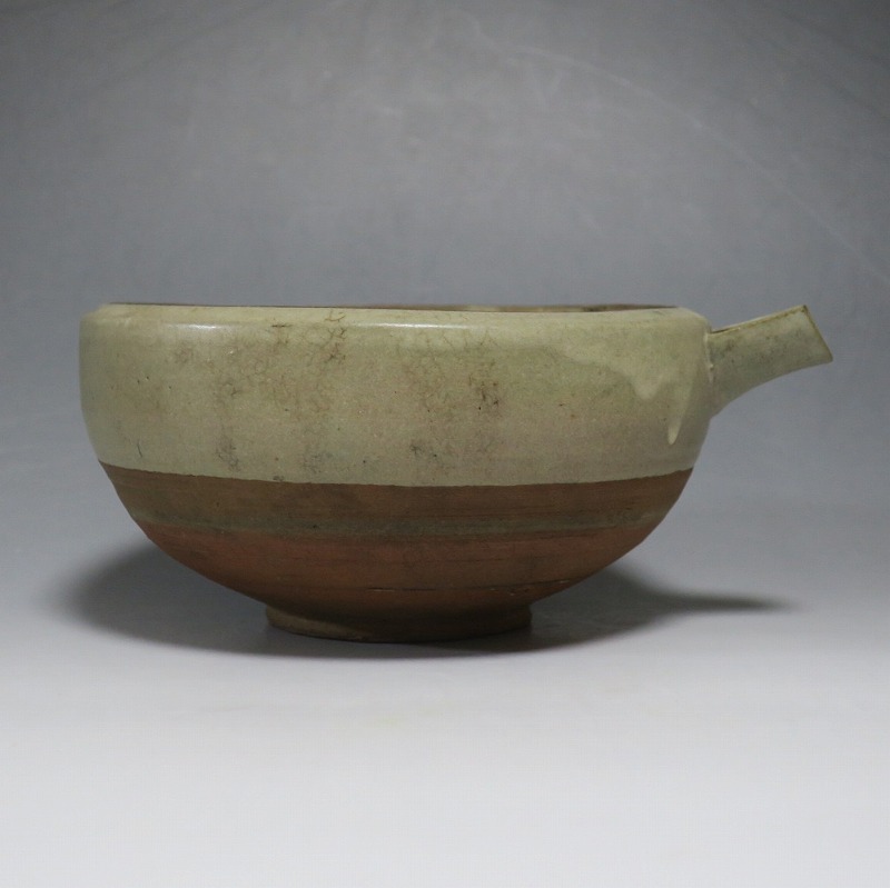 口径 約13.5cm/胴径 約15.3cm/横幅 約18cm 窯傷はありますが完品です。状態は写真でご確認ください。 丹波焼は、兵庫県今田町周辺で生産される焼物で鎌倉時代初期から現在まで窯が続いています。 江戸時代後期に窯が立杭へ移ると丹波焼の陶技も多彩になり、様々な意匠の作品が製作されるようになります。本品は幕末期前後に作られた灰釉の片口。酒屋などで量り売りをする時に使用された道具です。現在、片口は焼酎容器や料理鉢として使われています。本品を使って郷土料理などを食べると楽しいでしょう。 | ||