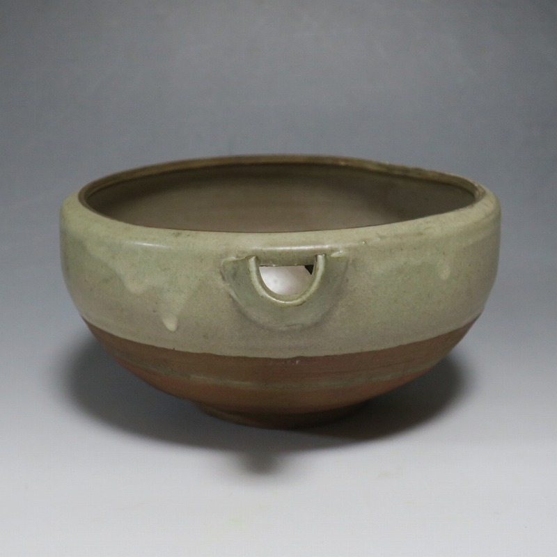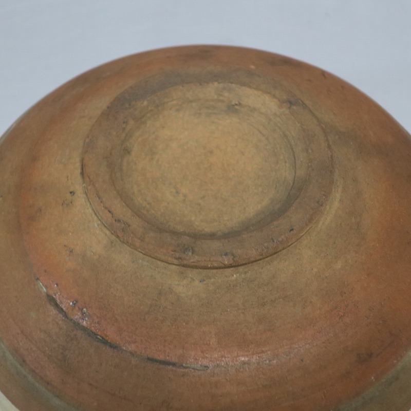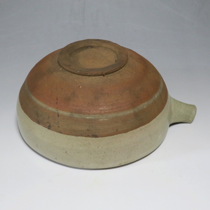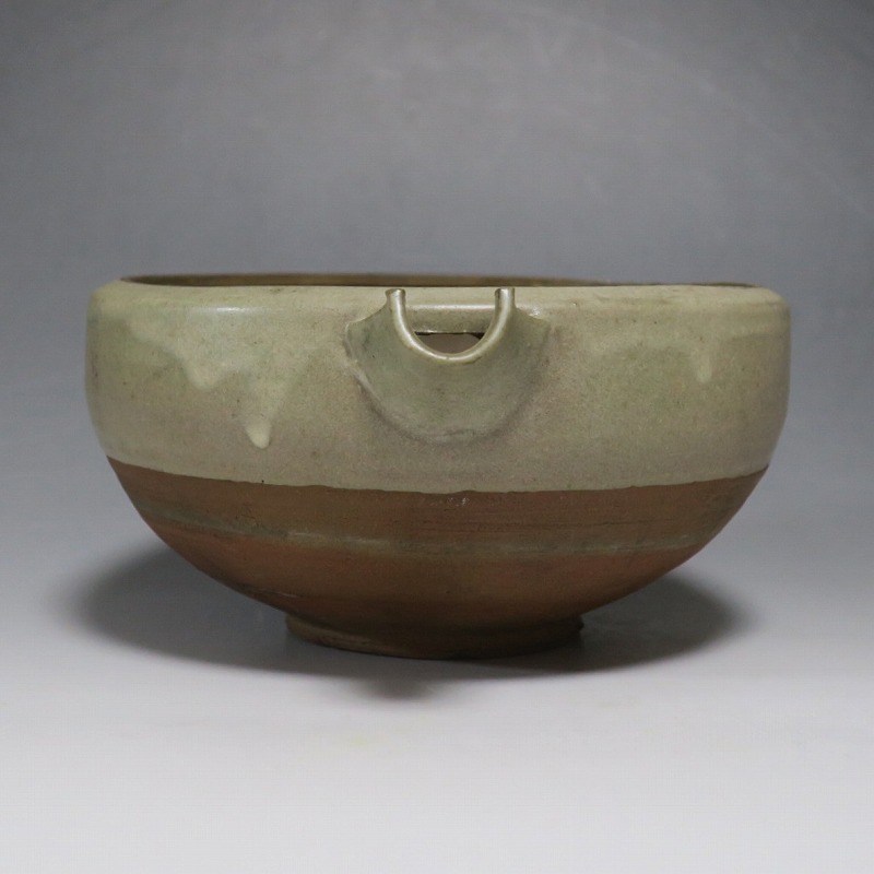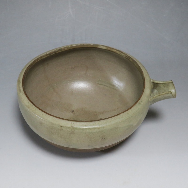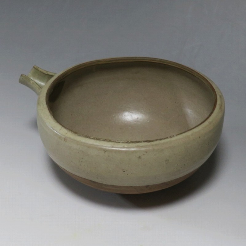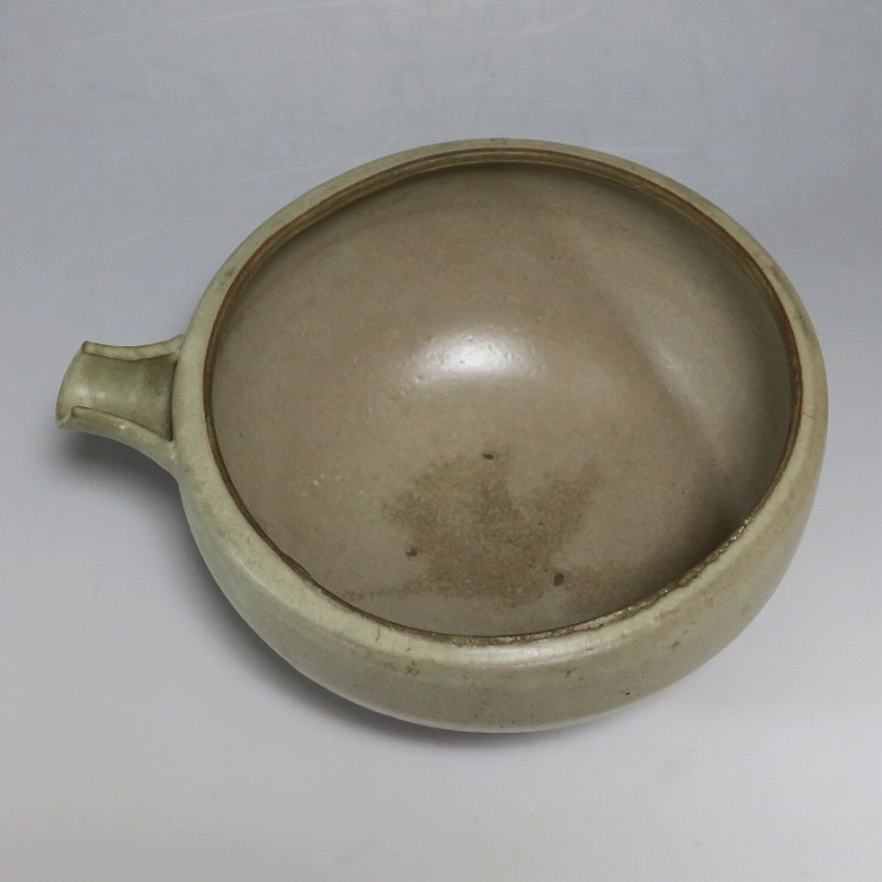 口径 約13.5cm/胴径 約15.3cm/横幅 約18cm 窯傷はありますが完品です。状態は写真でご確認ください。 丹波焼は、兵庫県今田町周辺で生産される焼物で鎌倉時代初期から現在まで窯が続いています。 江戸時代後期に窯が立杭へ移ると丹波焼の陶技も多彩になり、様々な意匠の作品が製作されるようになります。本品は幕末期前後に作られた灰釉の片口。酒屋などで量り売りをする時に使用された道具です。現在、片口は焼酎容器や料理鉢として使われています。本品を使って郷土料理などを食べると楽しいでしょう。 | ||