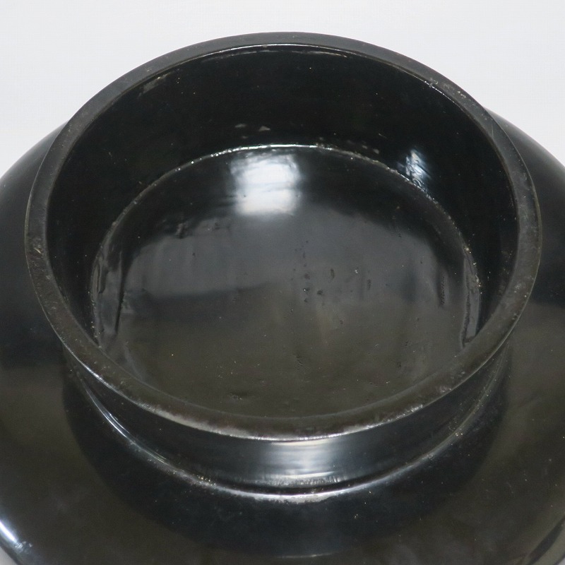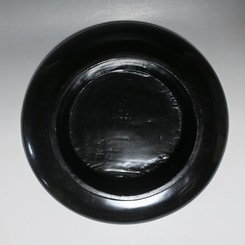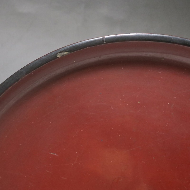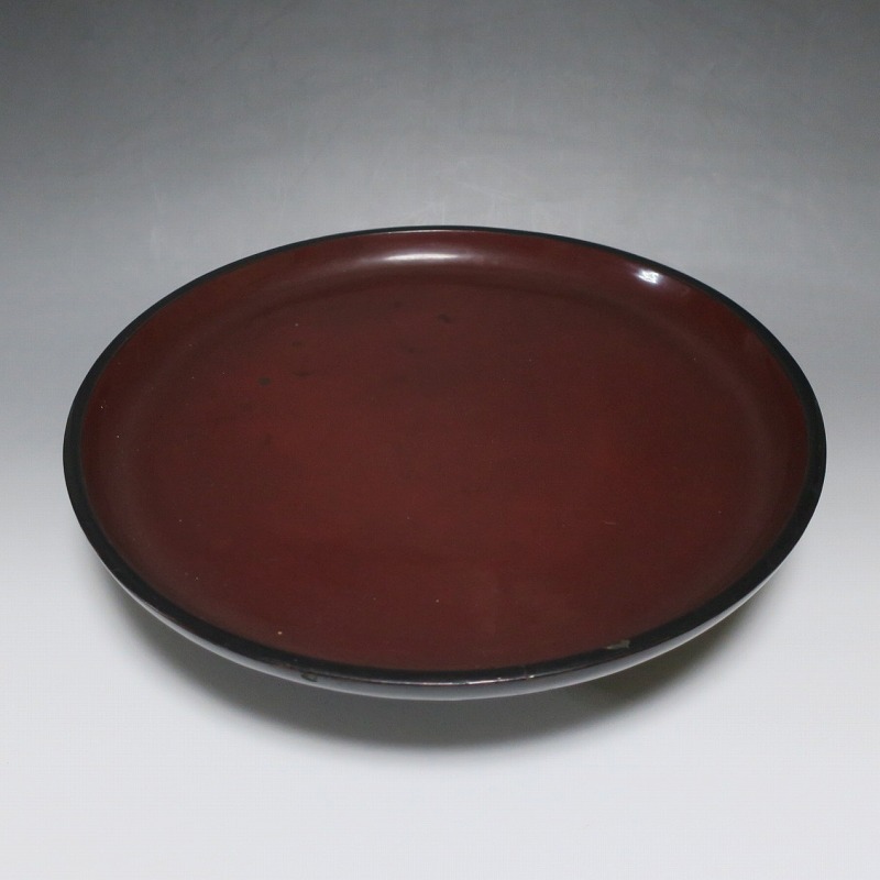 (明治時代 19世紀後半) 商品番号 4008 口径 約33cm/高さ 約8.5cm/高台径 約21cm 経年の擦れや傷みがありますが、総じて良い状態です。状態は写真でご確認ください。 丸盆は昔から食事の時に使用される食器を乗せる盆です。江戸時代は銘々で食事をしたので、このような盆が使用されました。本品は高台が付いた丸盆。朱漆と黒漆が塗り分けられた作品です。産地は不明ですが、近畿か北陸地方で作られた漆器でしょう。酒器や食器を乗せる盆の他、季節の果物や花瓶を置く飾り台などに使用できます。インテリア、食器を乗せる盆としてお楽しみください。 | ||