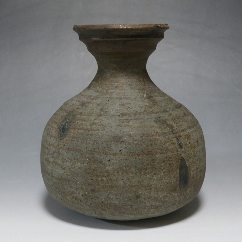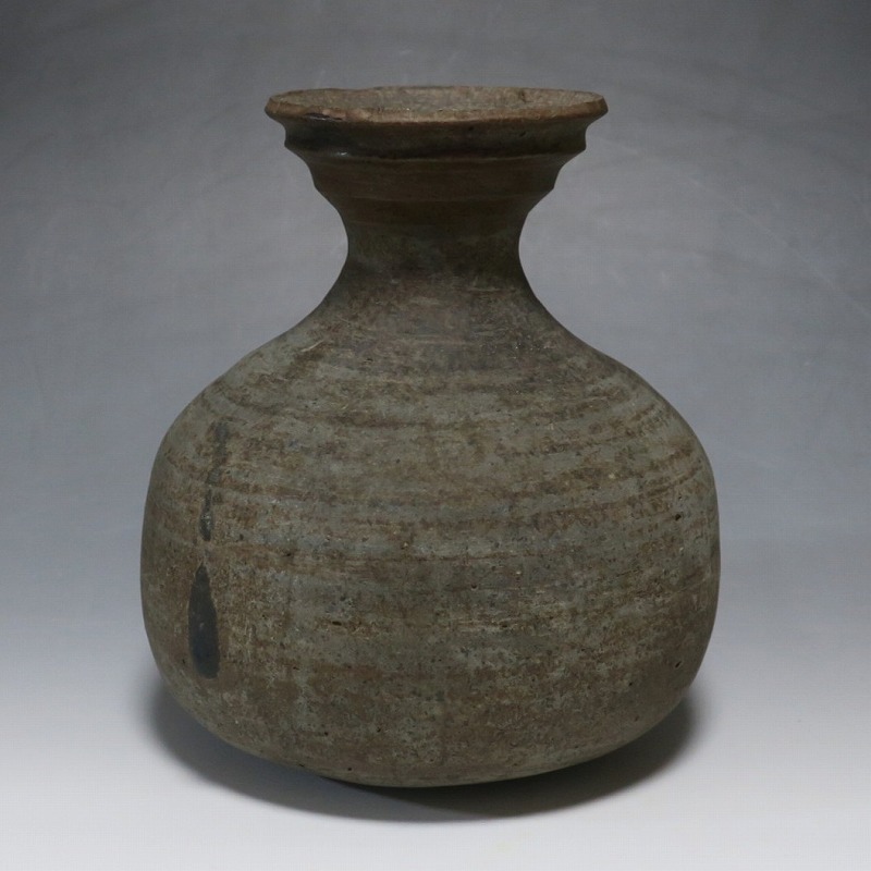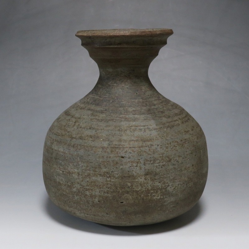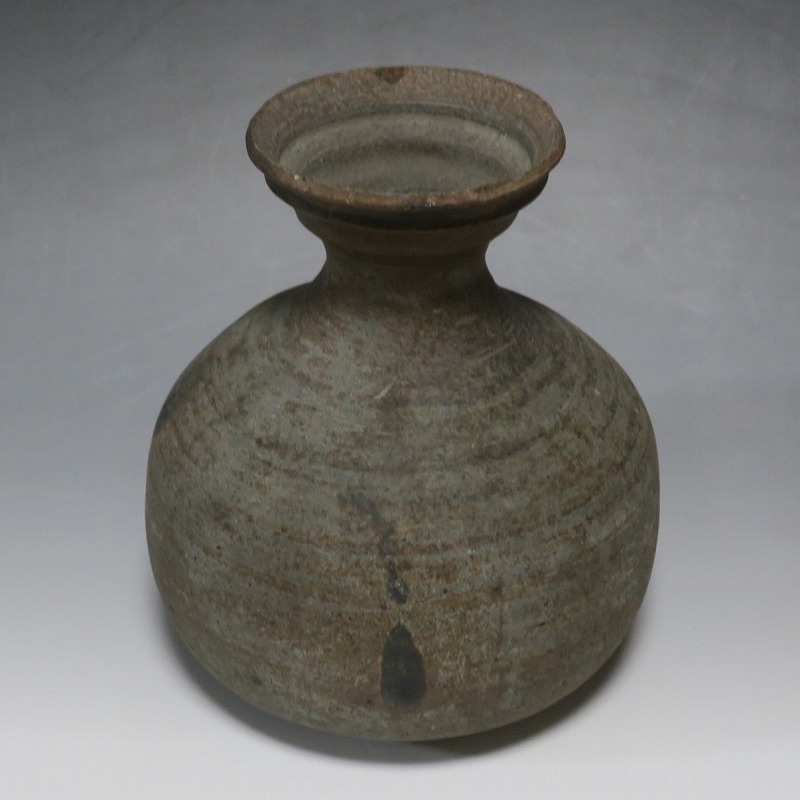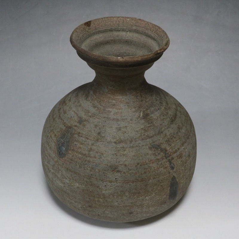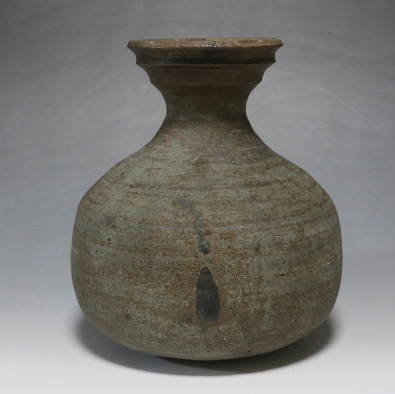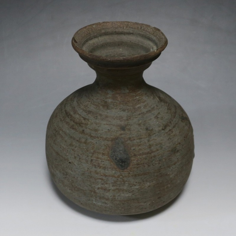 (カンボジア 14世紀) 商品番号 4028 高さ 約20.3cm/胴径 約18.4cm/口径 約10cm 口辺に若干の欠けがありますが、総じて良い状態です。状態は写真でご確認ください。 クメール王朝は9世紀から15世紀まで続いたクメール人(カンボジア)の王国です。11世紀から12世紀になると褐釉を掛けたクメール陶器が盛んに作られるようになりました。本品は14世紀前後に焼き締めで製作された壺。銅器の壺などを写した陶器作品です。胴部に数カ所、釉薬の溜まりがありアクセントになっています。日本の中世陶に似た雰囲気があります。インテリア、花器としてお楽しみください。 | ||