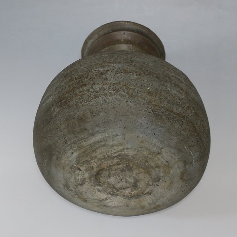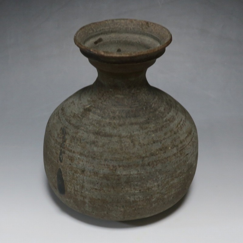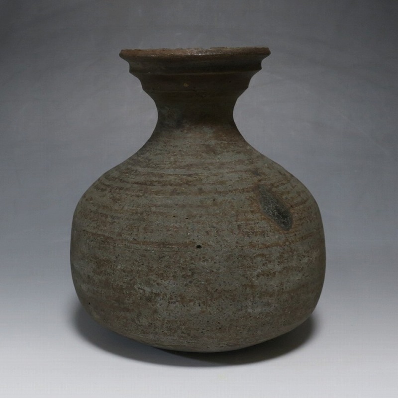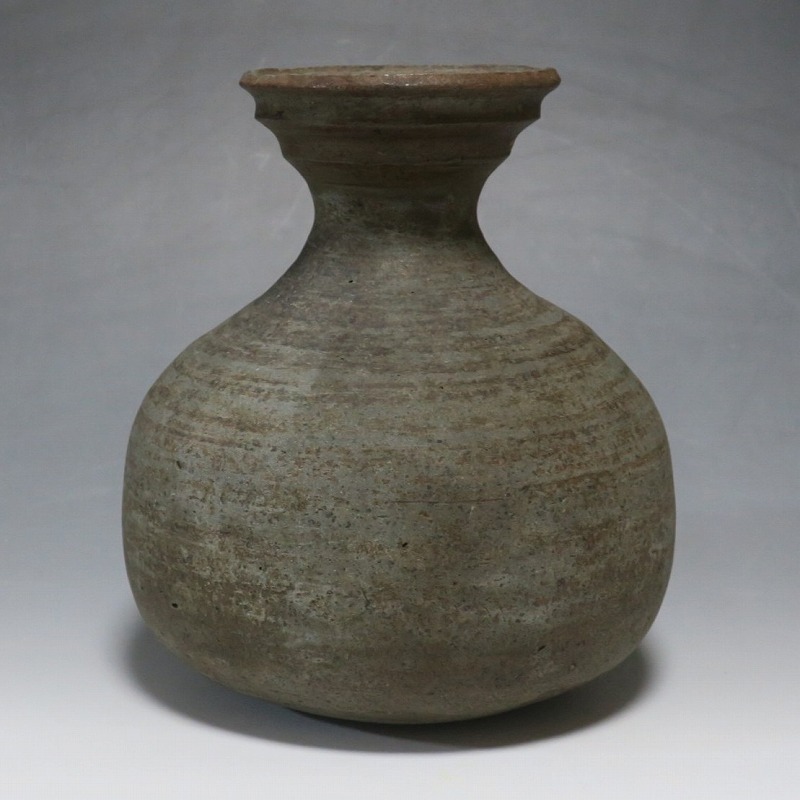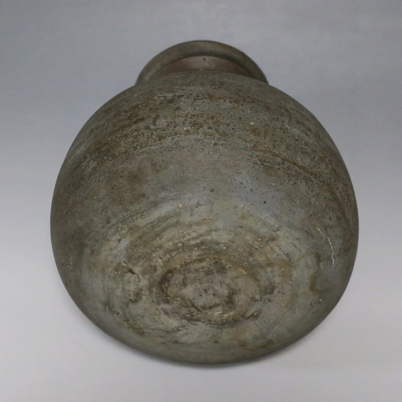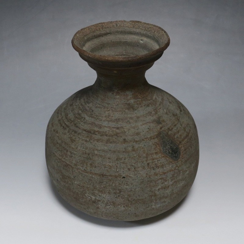 (カンボジア 14世紀) 商品番号 4028 高さ 約20.3cm/胴径 約18.4cm/口径 約10cm 口辺に若干の欠けがありますが、総じて良い状態です。状態は写真でご確認ください。 クメール王朝は9世紀から15世紀まで続いたクメール人(カンボジア)の王国です。11世紀から12世紀になると褐釉を掛けたクメール陶器が盛んに作られるようになりました。本品は14世紀前後に焼き締めで製作された壺。銅器の壺などを写した陶器作品です。胴部に数カ所、釉薬の溜まりがありアクセントになっています。日本の中世陶に似た雰囲気があります。インテリア、花器としてお楽しみください。 | ||