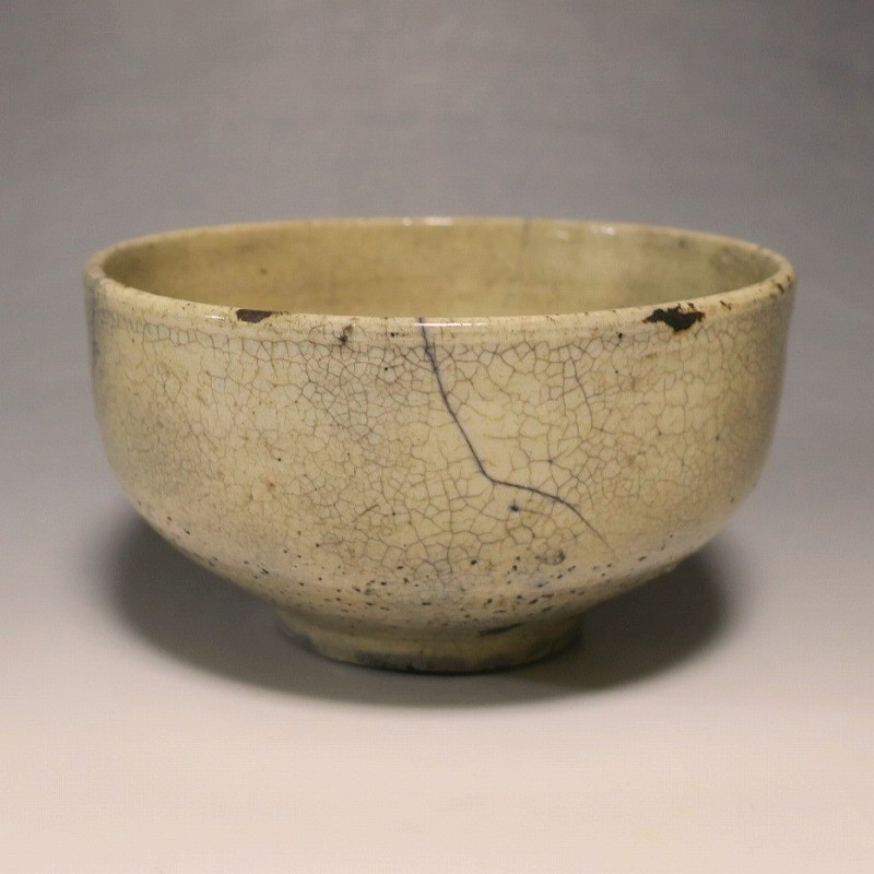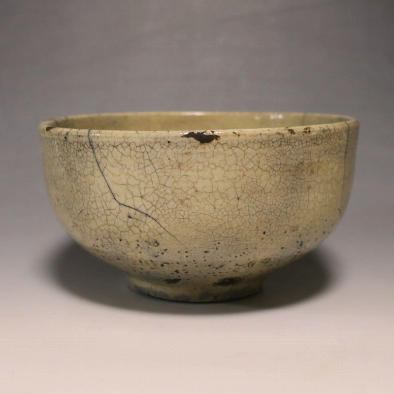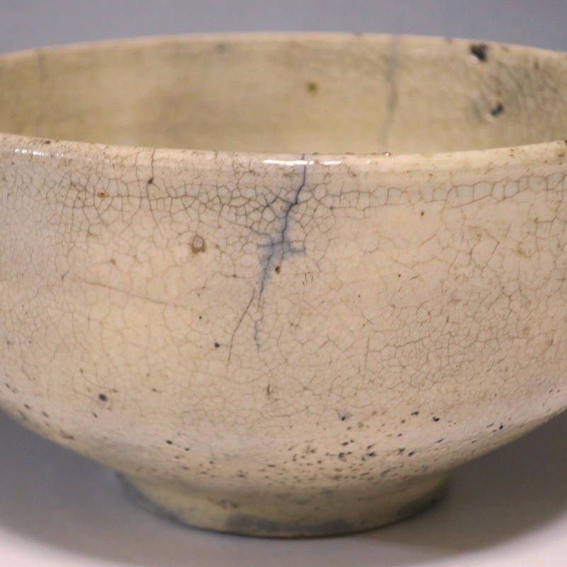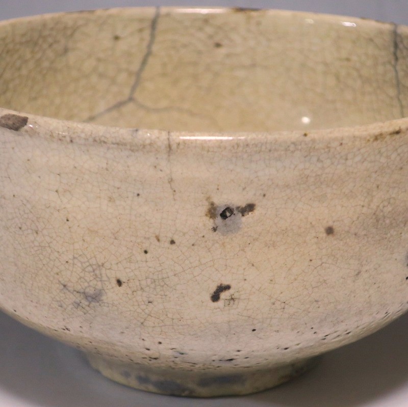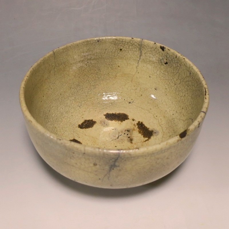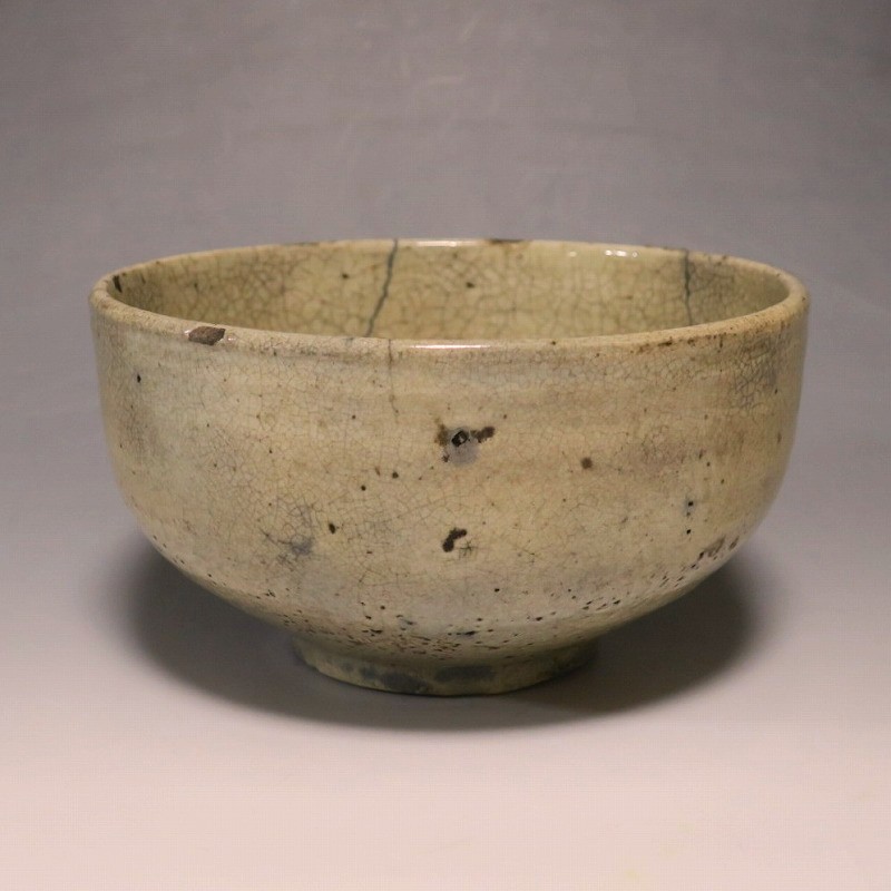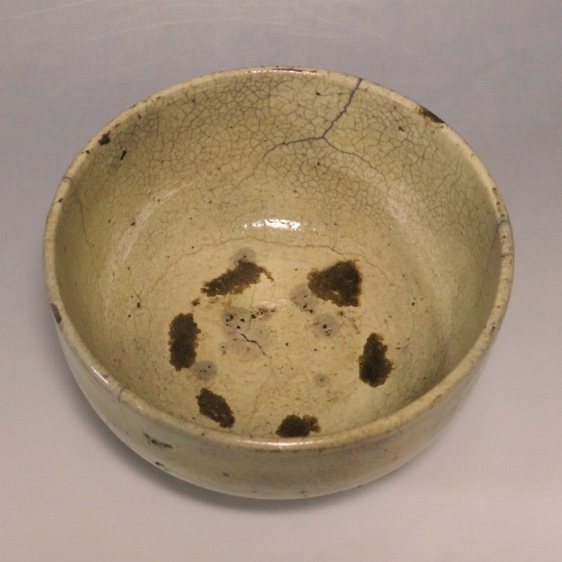 口径 約15.5cm/高さ 約8.4cm/高台径 約7cm 口辺に釉ハゲやニュウがあり、経年の染みがあります。状態は写真でご確認ください。 井戸脇茶碗は高麗茶碗の一種で、井戸茶碗に似ていることから命名されました。井戸茶碗とは異なり、色白で梅花皮が少ないですが、趣のある雰囲気を持っています。本品は18世紀に作られた井戸脇茶碗。箱には「井戸」とありますが、造形を見ると井戸脇茶碗に分類できます。染みやニュウがありますが、景色の良い味わい深い茶碗に育っています。大ぶりですので濃茶に向いています。本作で抹茶をお楽しみください。 | ||