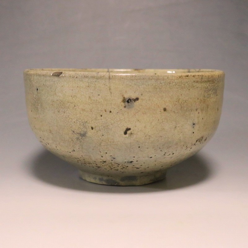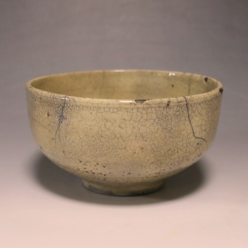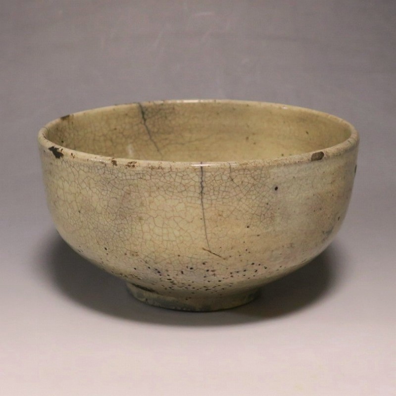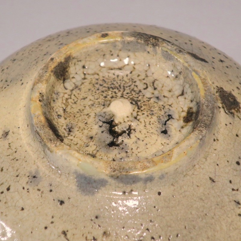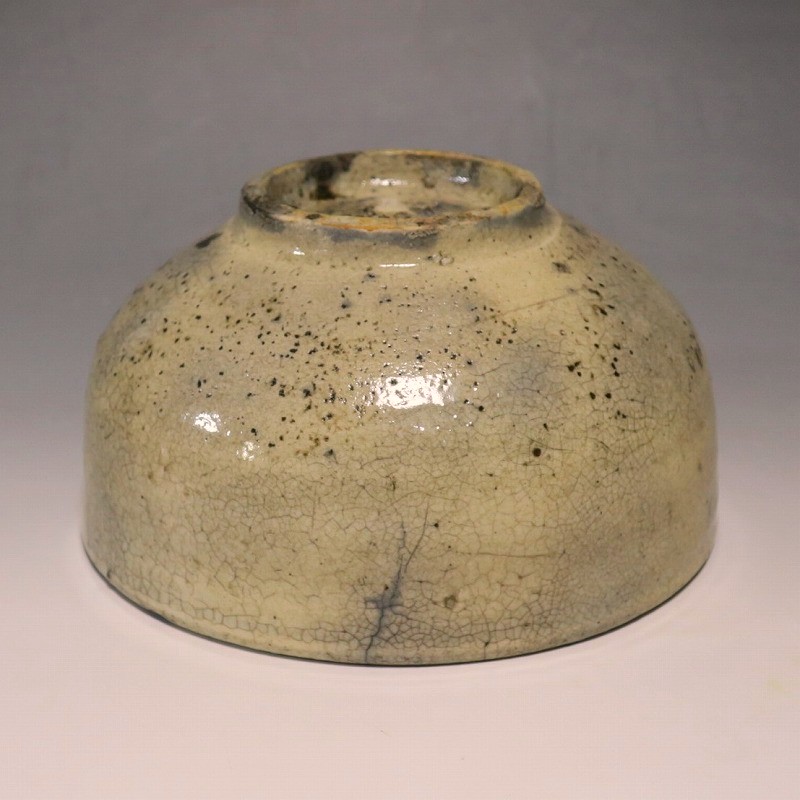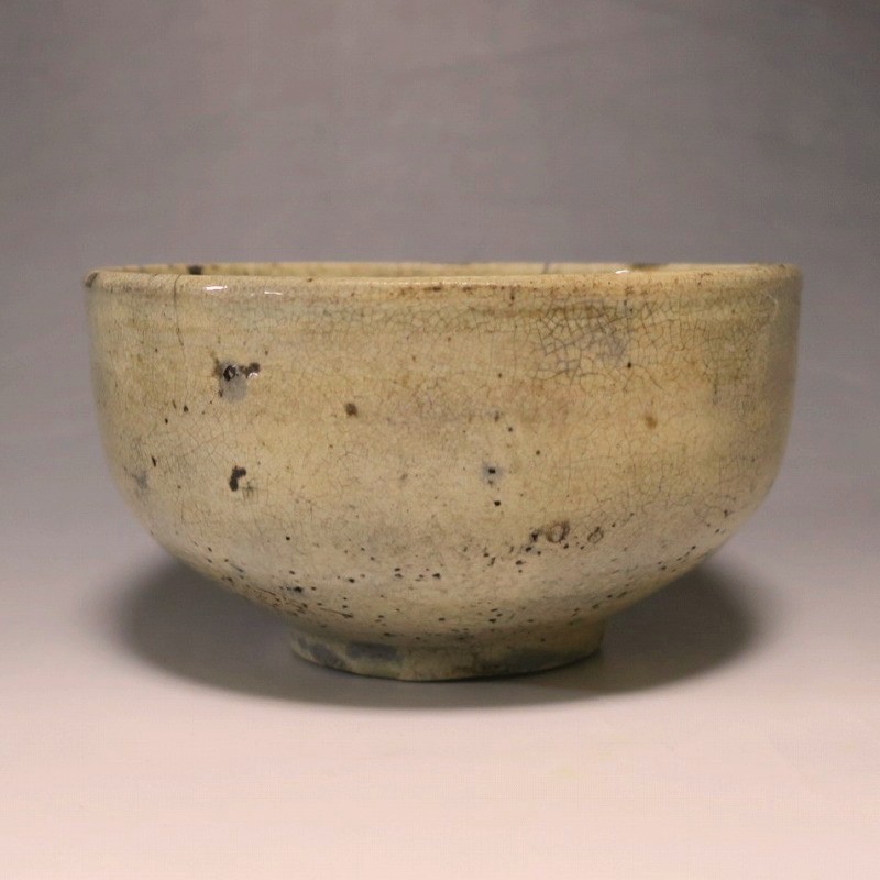 口径 約15.5cm/高さ 約8.4cm/高台径 約7cm 口辺に釉ハゲやニュウがあり、経年の染みがあります。状態は写真でご確認ください。 井戸脇茶碗は高麗茶碗の一種で、井戸茶碗に似ていることから命名されました。井戸茶碗とは異なり、色白で梅花皮が少ないですが、趣のある雰囲気を持っています。本品は18世紀に作られた井戸脇茶碗。箱には「井戸」とありますが、造形を見ると井戸脇茶碗に分類できます。染みやニュウがありますが、景色の良い味わい深い茶碗に育っています。大ぶりですので濃茶に向いています。本作で抹茶をお楽しみください。 | ||