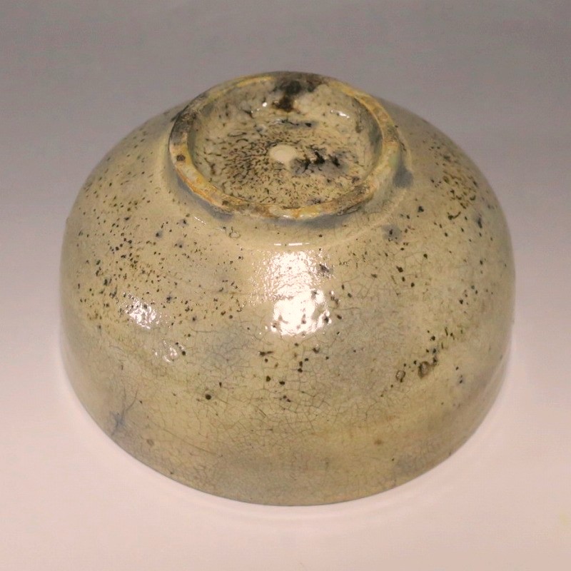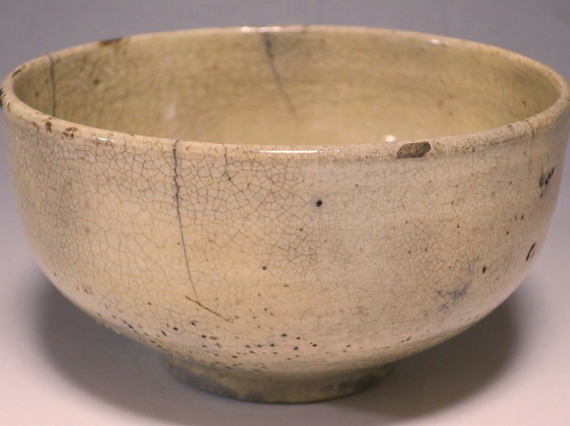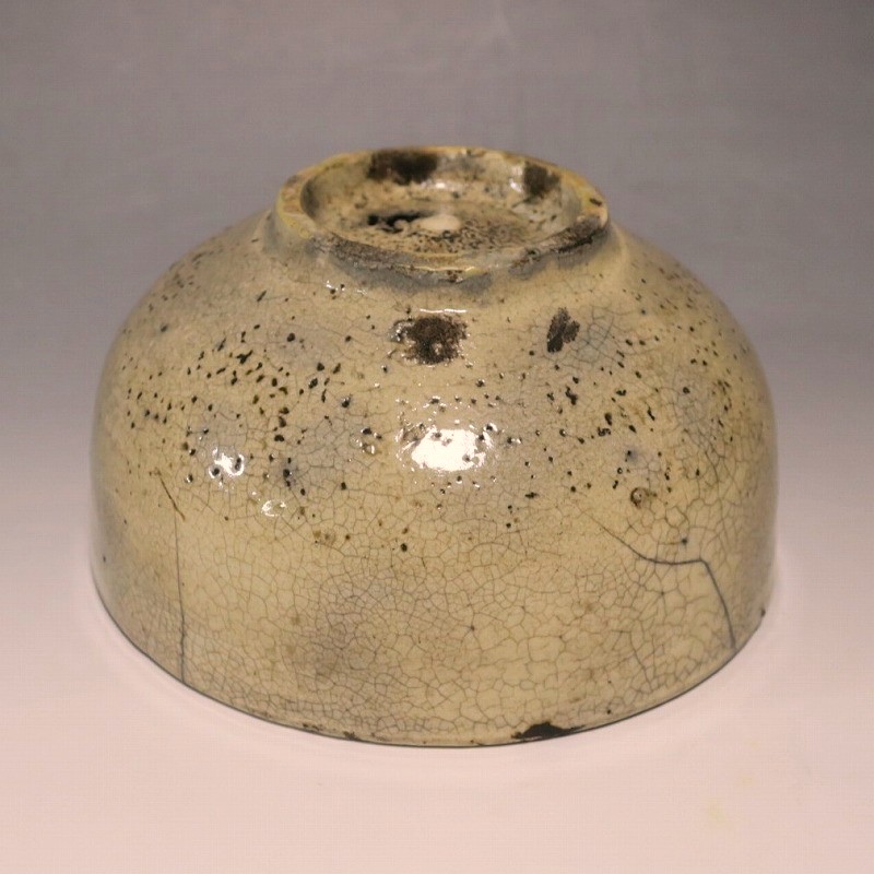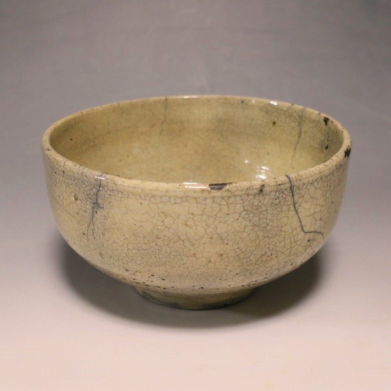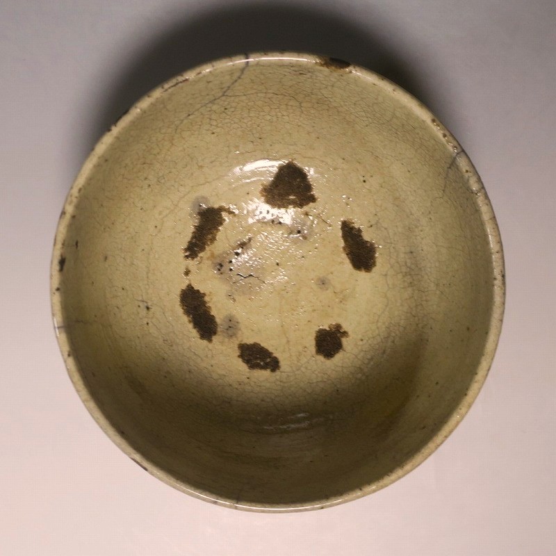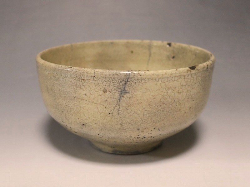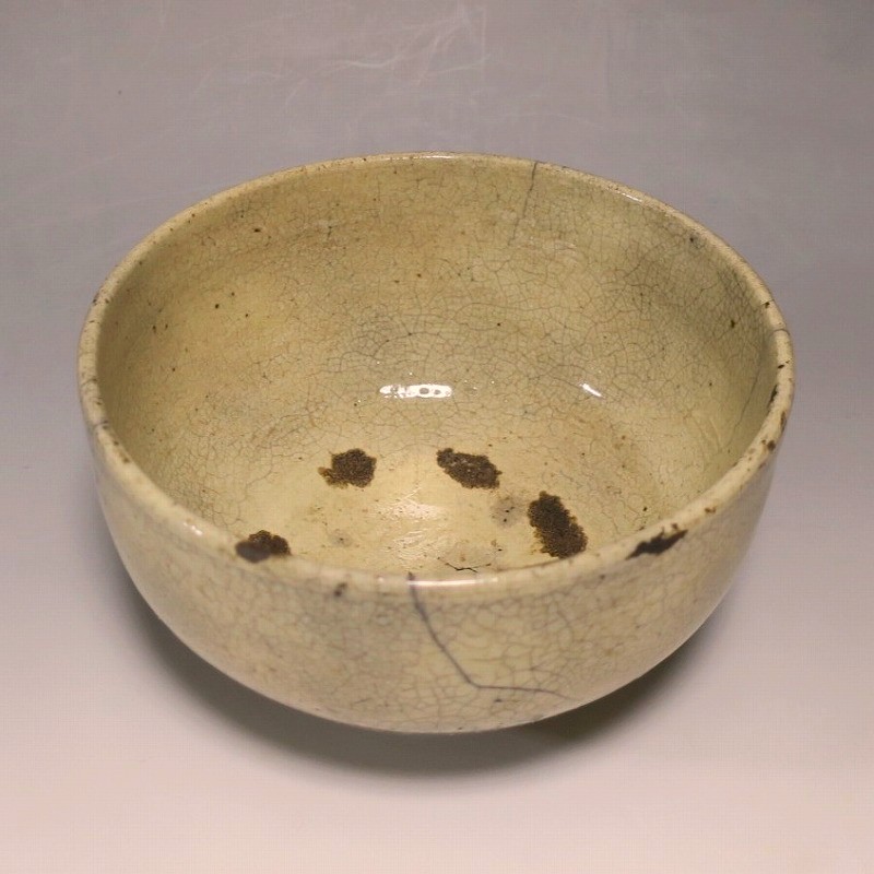 口径 約15.5cm/高さ 約8.4cm/高台径 約7cm 口辺に釉ハゲやニュウがあり、経年の染みがあります。状態は写真でご確認ください。 井戸脇茶碗は高麗茶碗の一種で、井戸茶碗に似ていることから命名されました。井戸茶碗とは異なり、色白で梅花皮が少ないですが、趣のある雰囲気を持っています。本品は18世紀に作られた井戸脇茶碗。箱には「井戸」とありますが、造形を見ると井戸脇茶碗に分類できます。染みやニュウがありますが、景色の良い味わい深い茶碗に育っています。大ぶりですので濃茶に向いています。本作で抹茶をお楽しみください。 | ||