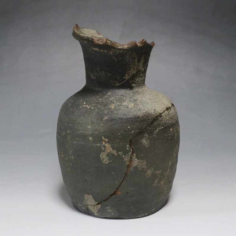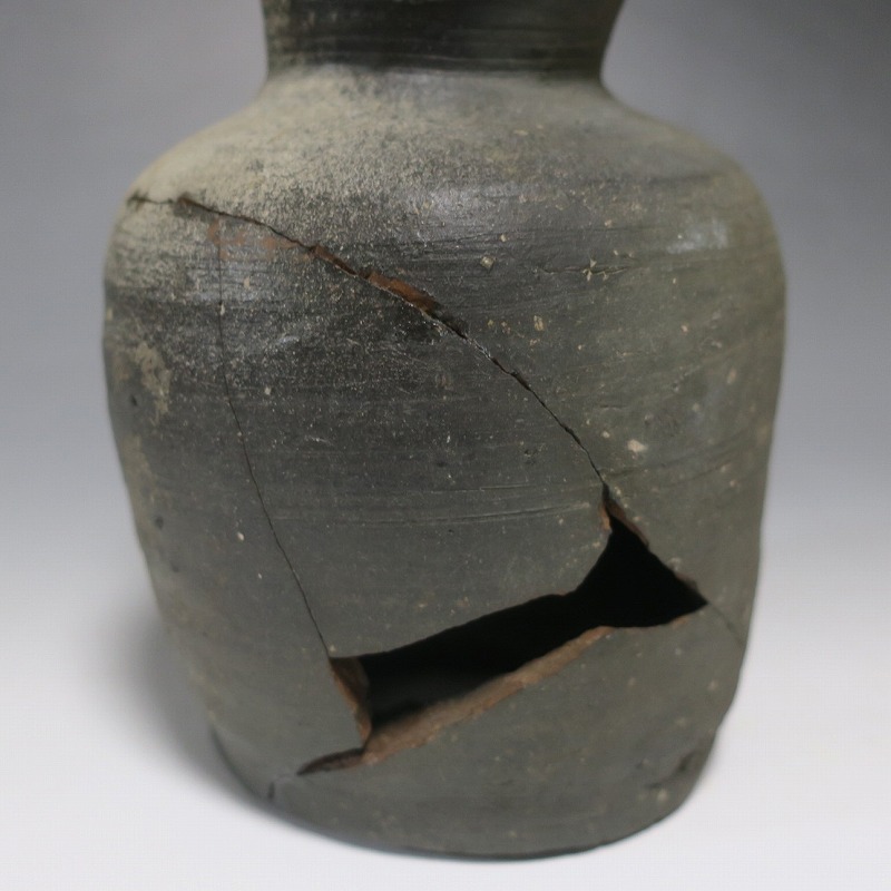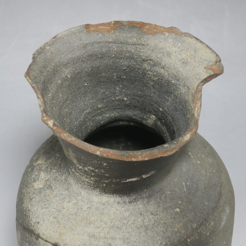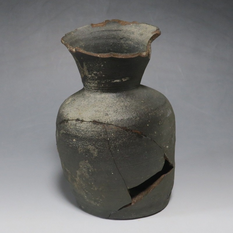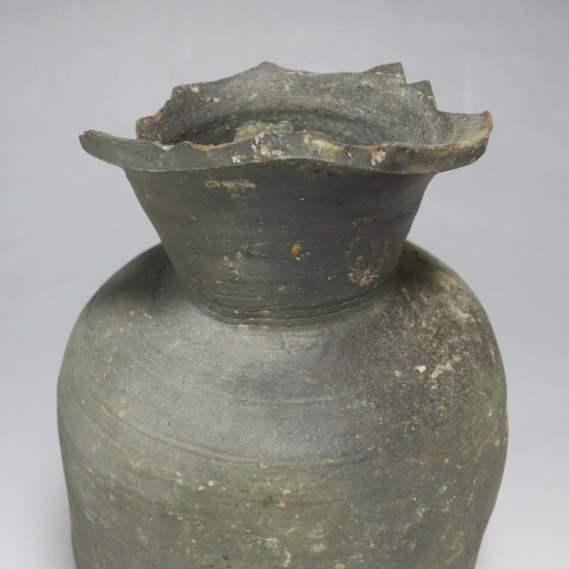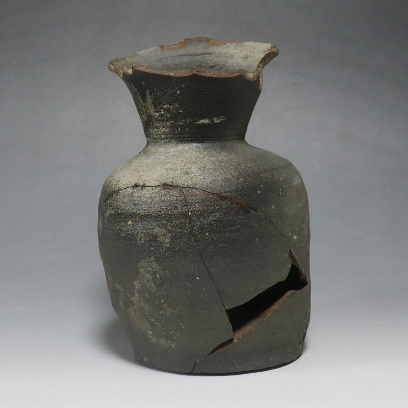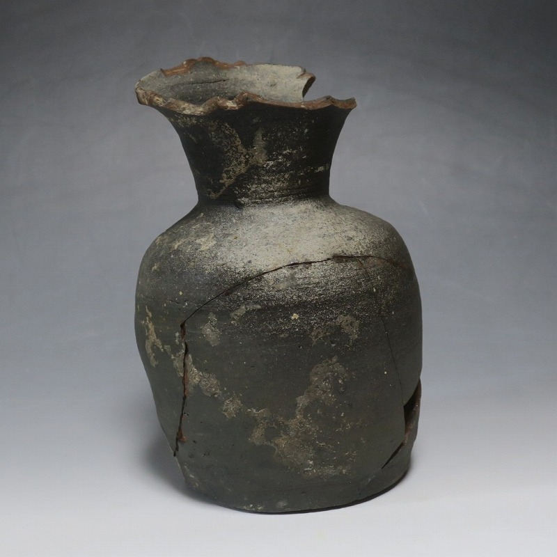 (平安時代 11世紀) 商品番号 4050 高さ 約19.5cm/胴径 約13.5cm/高台径 約10.3cm 全体的に大きく割れ、欠損している部分があります。状態は写真でご確認ください。 須恵器は4世紀頃、朝鮮半島で焼き始められた硬質陶器(b器)です。耐水性に優れた焼物なので祭祀用などの祭器として使用されました。日本には4世紀後半に伝来、5世紀中頃には生産が始まります。本品は11世紀に作られた須恵器の残欠。貴族文化の華が開いた藤原時代の作品です。雰囲気のある残欠なので落としを使って野草などを活けると映えるでしょう。侘びた感じが出ると思います。 | ||