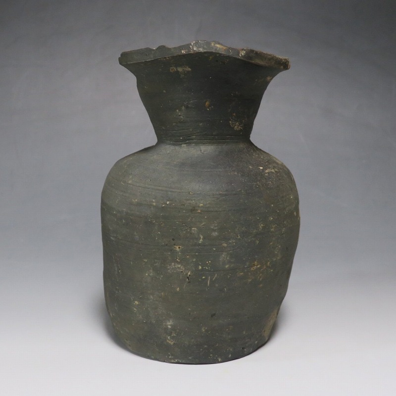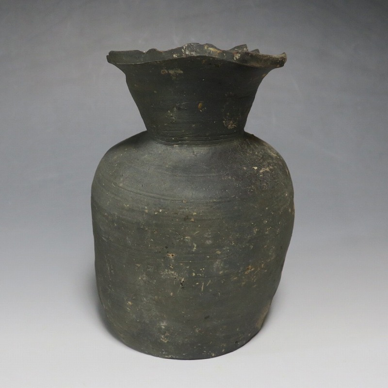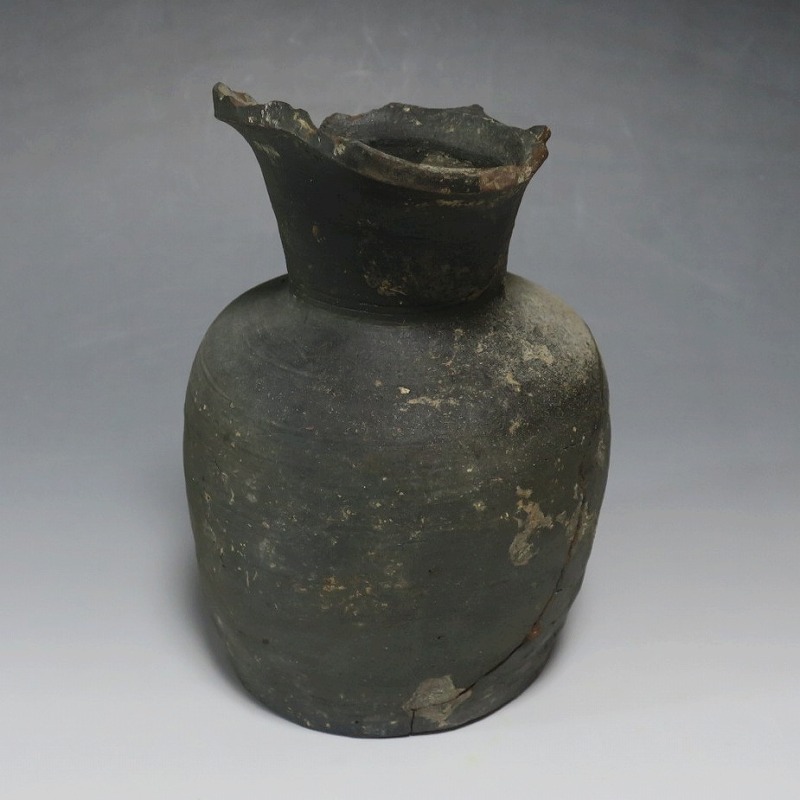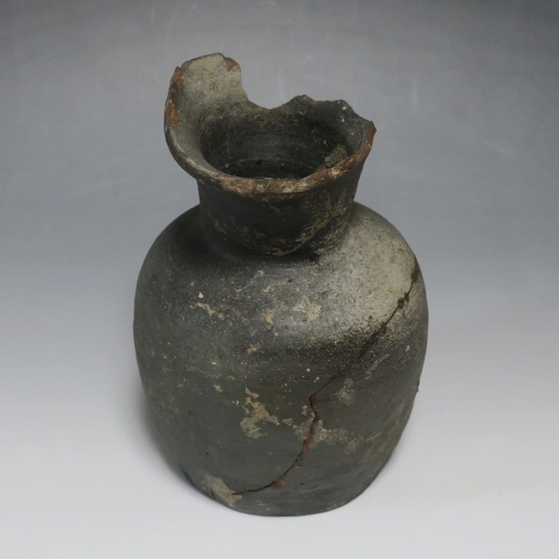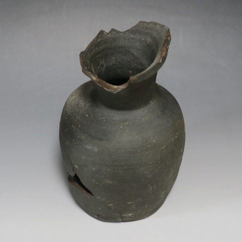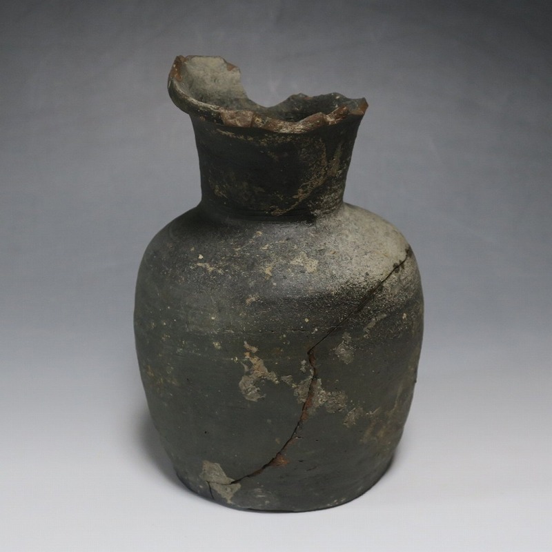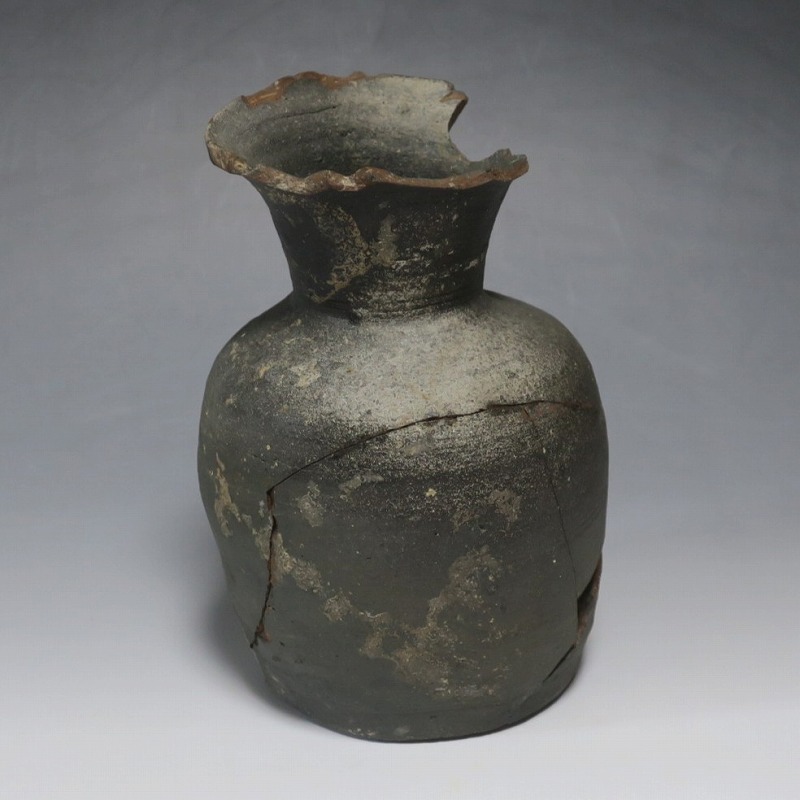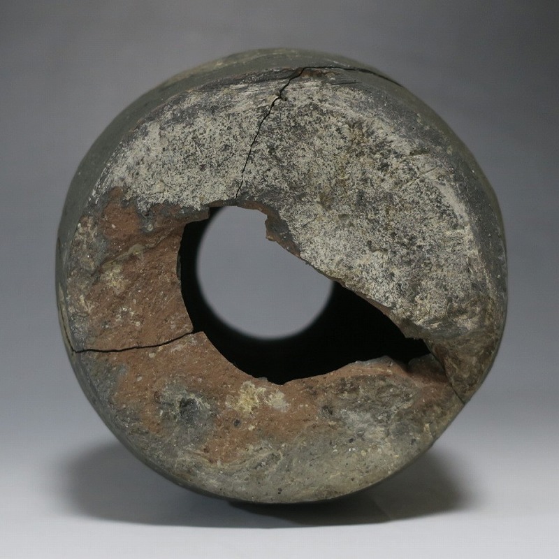 (平安時代 11世紀) 商品番号 4050 高さ 約19.5cm/胴径 約13.5cm/高台径 約10.3cm 全体的に大きく割れ、欠損している部分があります。状態は写真でご確認ください。 須恵器は4世紀頃、朝鮮半島で焼き始められた硬質陶器(b器)です。耐水性に優れた焼物なので祭祀用などの祭器として使用されました。日本には4世紀後半に伝来、5世紀中頃には生産が始まります。本品は11世紀に作られた須恵器の残欠。貴族文化の華が開いた藤原時代の作品です。雰囲気のある残欠なので落としを使って野草などを活けると映えるでしょう。侘びた感じが出ると思います。 | ||