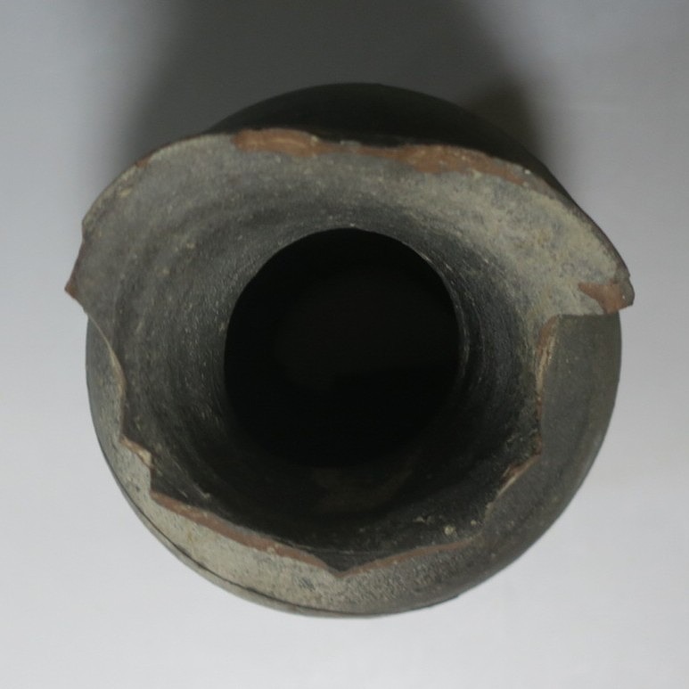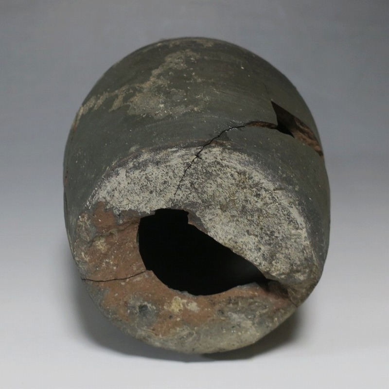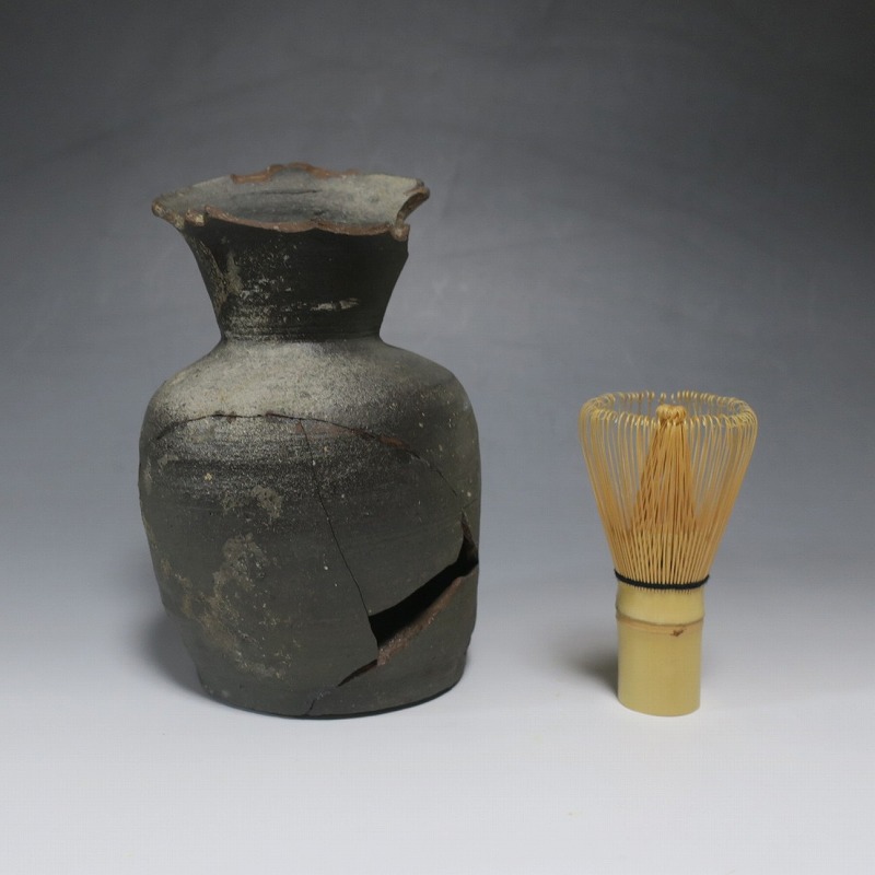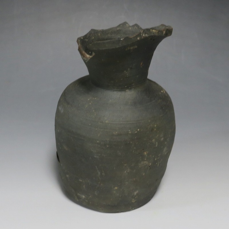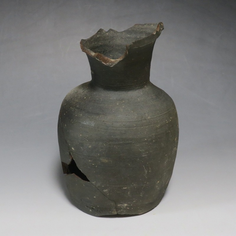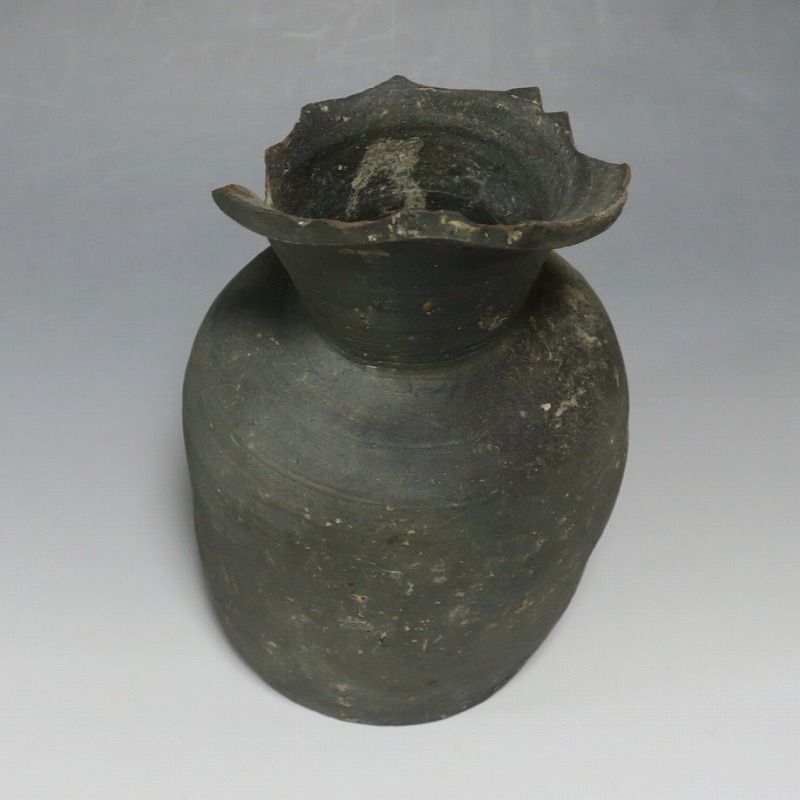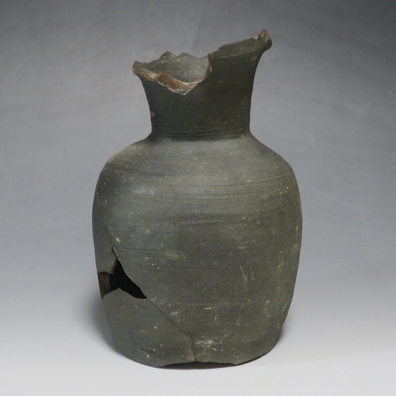 (平安時代 11世紀) 商品番号 4050 高さ 約19.5cm/胴径 約13.5cm/高台径 約10.3cm 全体的に大きく割れ、欠損している部分があります。状態は写真でご確認ください。 須恵器は4世紀頃、朝鮮半島で焼き始められた硬質陶器(b器)です。耐水性に優れた焼物なので祭祀用などの祭器として使用されました。日本には4世紀後半に伝来、5世紀中頃には生産が始まります。本品は11世紀に作られた須恵器の残欠。貴族文化の華が開いた藤原時代の作品です。雰囲気のある残欠なので落としを使って野草などを活けると映えるでしょう。侘びた感じが出ると思います。 | ||