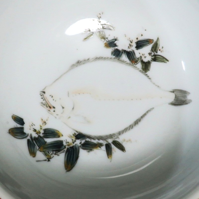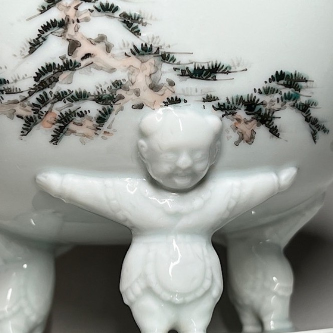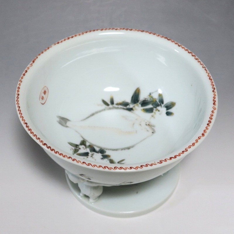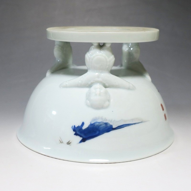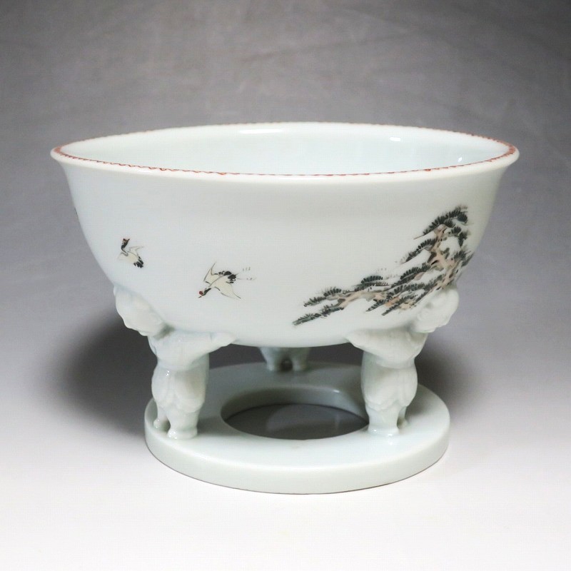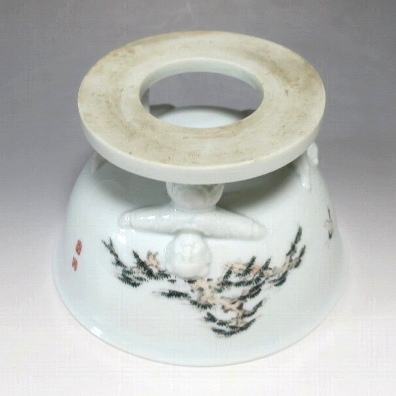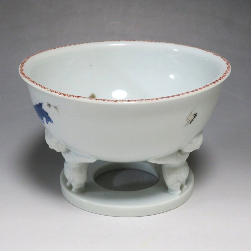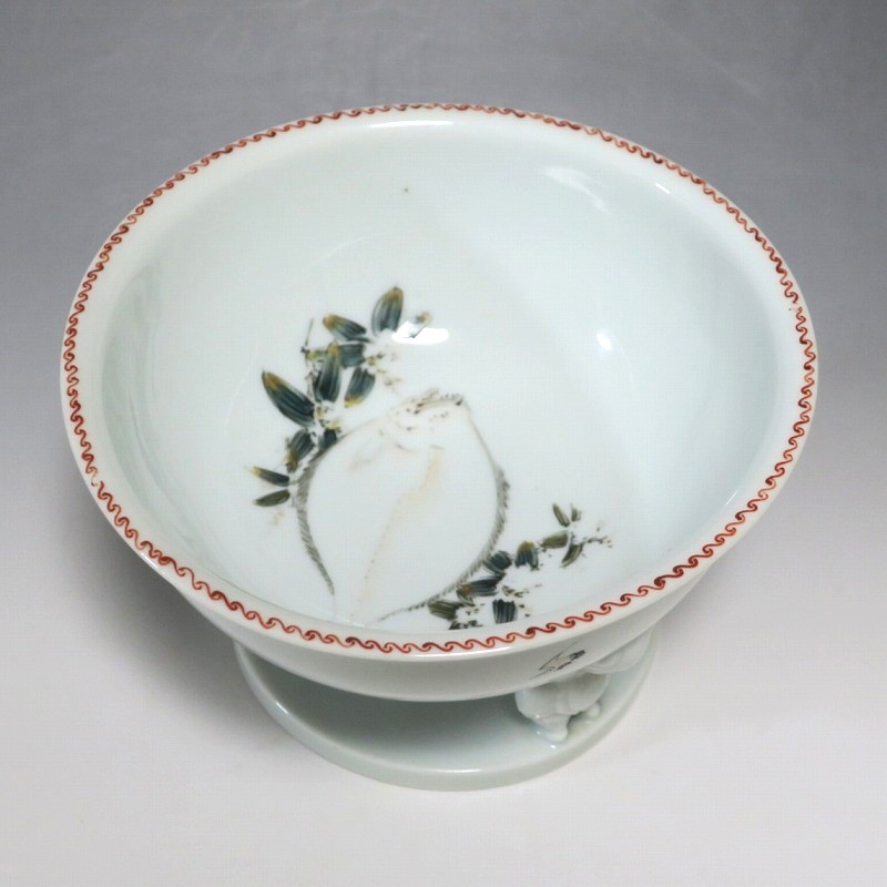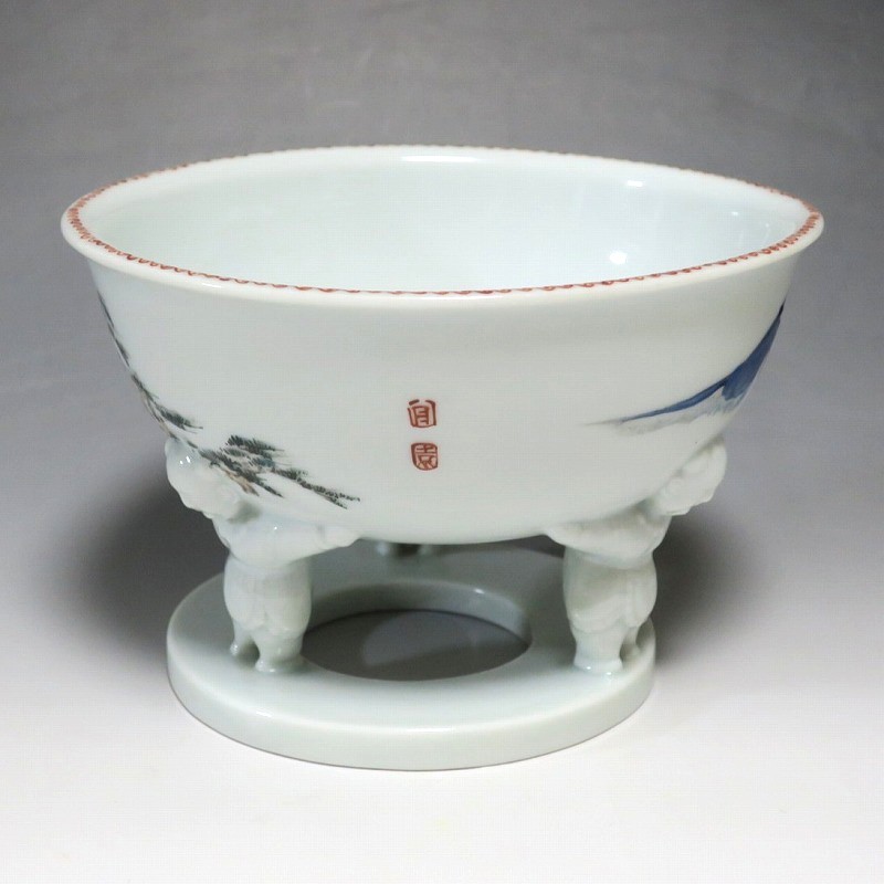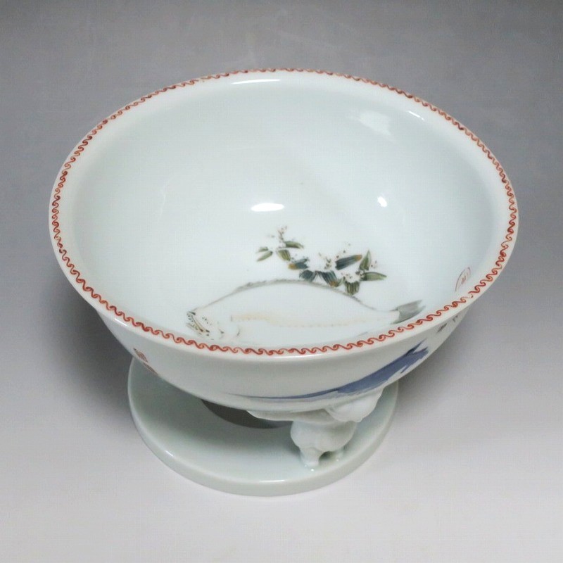 (明治時代 19世紀中頃) 商品番号 4058 高さ 約12cm/口径 約18.4cm/高台径 約12.5cm 使用による若干の擦り傷がありますが、完品です。状態は写真でご確認ください。 渋草焼は天保12年(1841年)、地域の磁器需要を満たすために岐阜県高山市に開かれた窯です。渋草陶石を使い、瀬戸や九谷から陶工を招いて良質な作品を生産しました。 本品は明治時代に作られた色絵の杯洗。見込みにヒラメ、側面には富士山の絵が描かれ、三脚が唐子の造形をした可愛らしい作品です。他の窯にはない独特の個性、伊万里焼とは雰囲気の異なる国焼磁器の魅力があります。食器や資料としてお楽しみください。 | ||