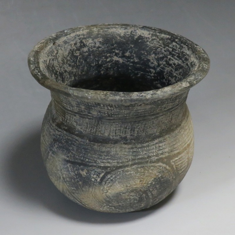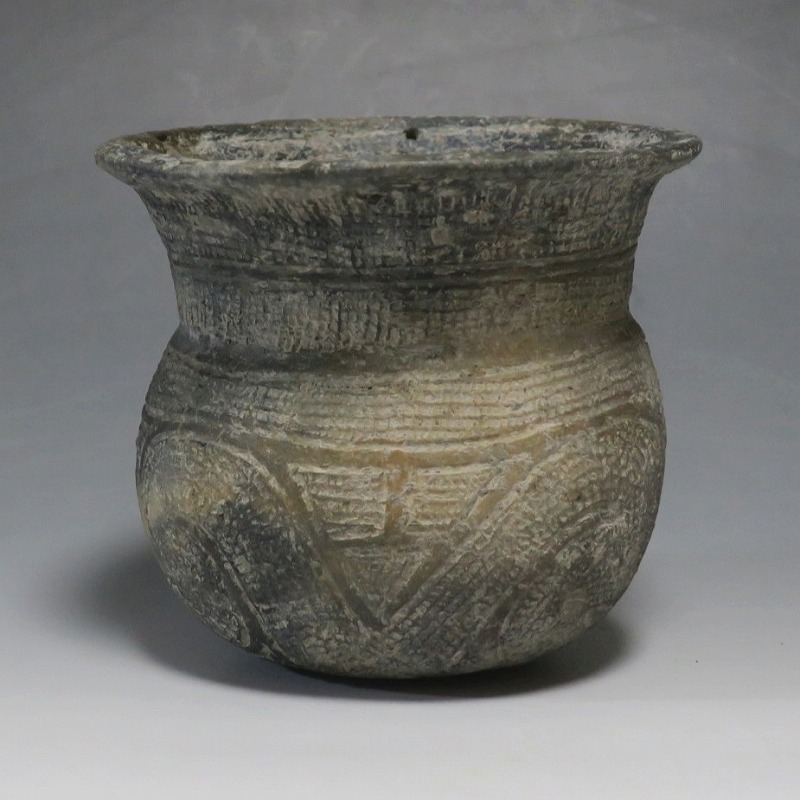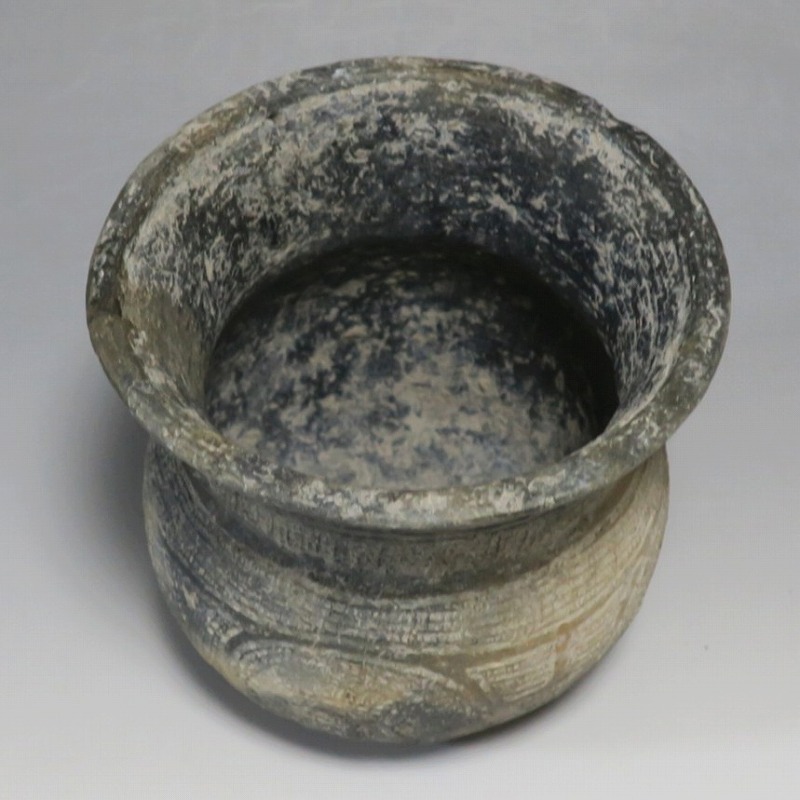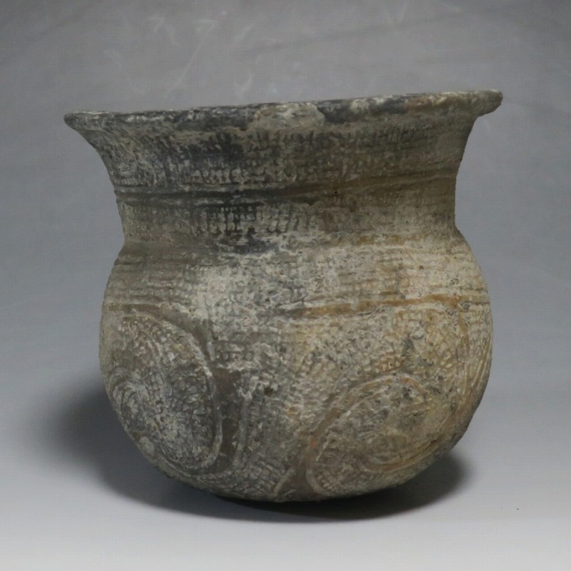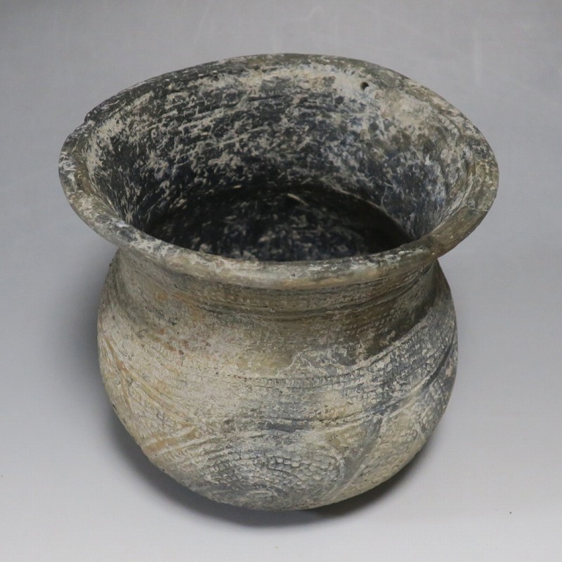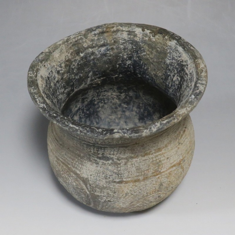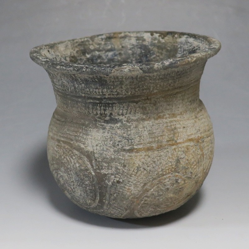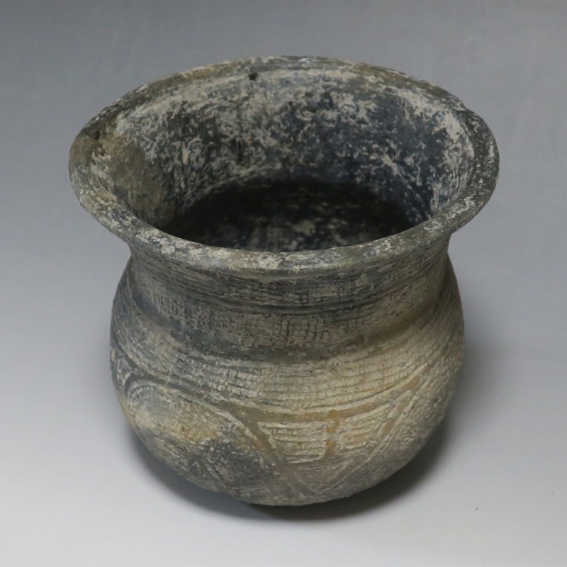 (タイ 紀元前500年) 商品番号 4069 高さ 約12.5cm/胴径 約11.8cm/口径 約13.5cm 発掘品のため全体的に土の付着があり、口辺に約2cmの欠けがあります。状態は写真でご確認ください。 バンチェン遺跡は、タイ・ウドーンターニー県・ノーンハーン郡にあるユネスコの世界遺産に登録されている古代遺跡です。紀元前数千年に発生したタイの有史以前の土器で、現在、この文明について研究が行われています。本品は紀元前500年前後に作られた線刻文土器。プリミティブな幾何学文が線刻された作品です。日本の弥生土器に似たシンプルな形をしています。造形を見ると、この土器を製作した民族が稲作民だったことが想像できます。古代を感じさせてくれるシンプルで美しい壺。インテリアや落としを使用して花器としてお楽しみください。 | ||