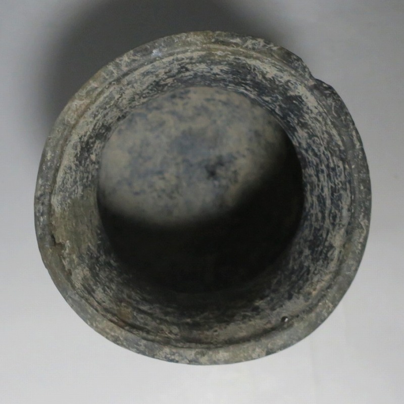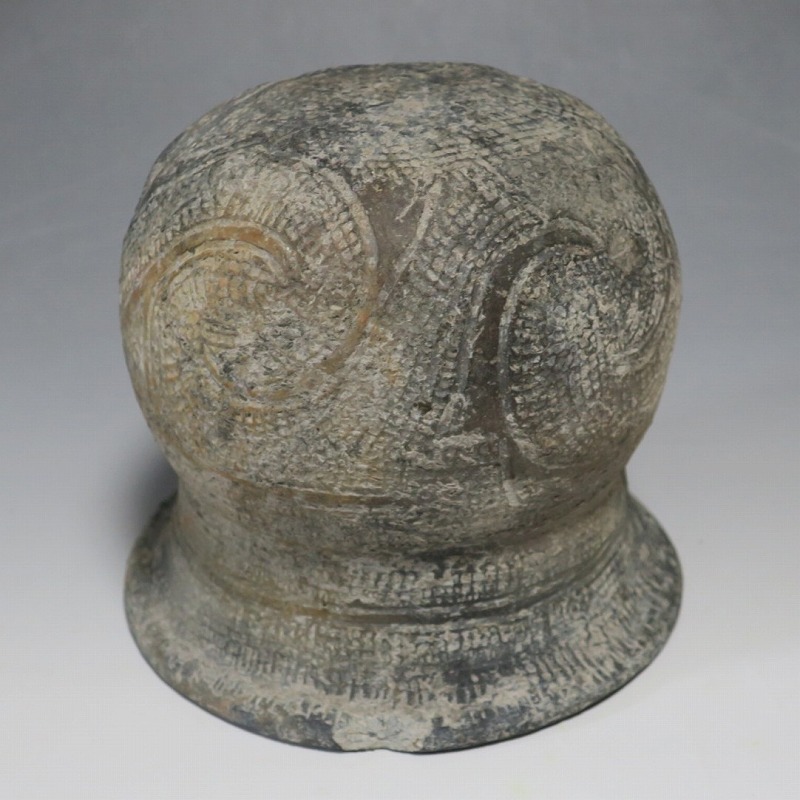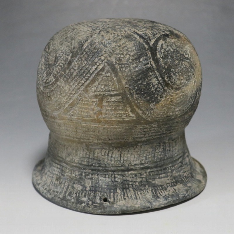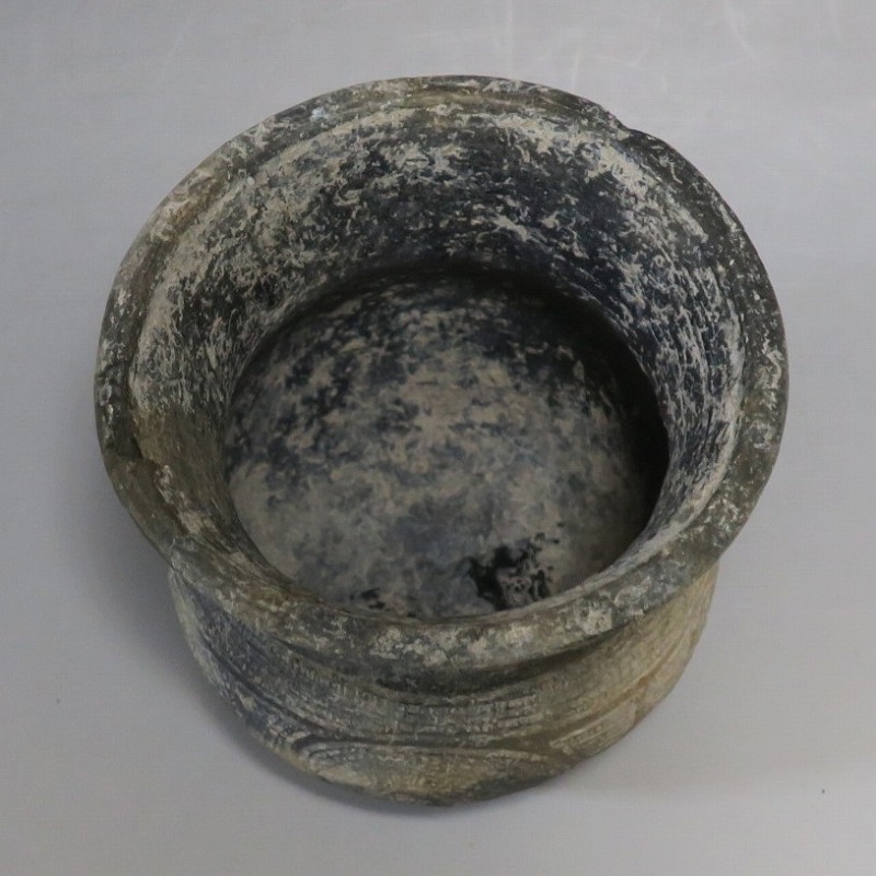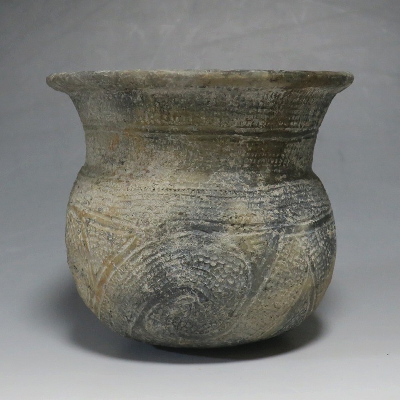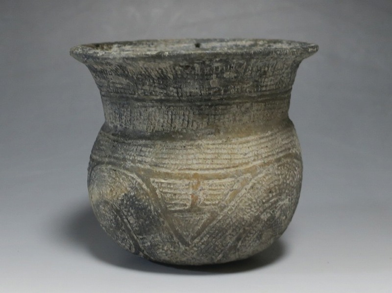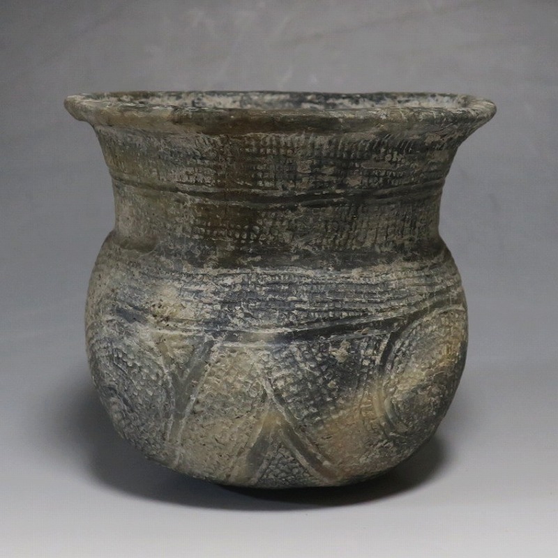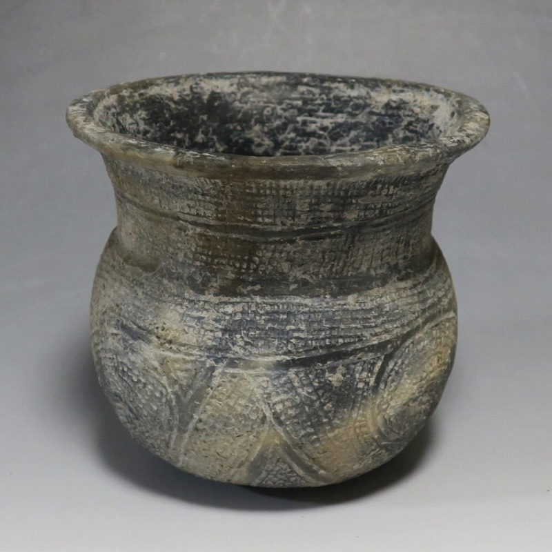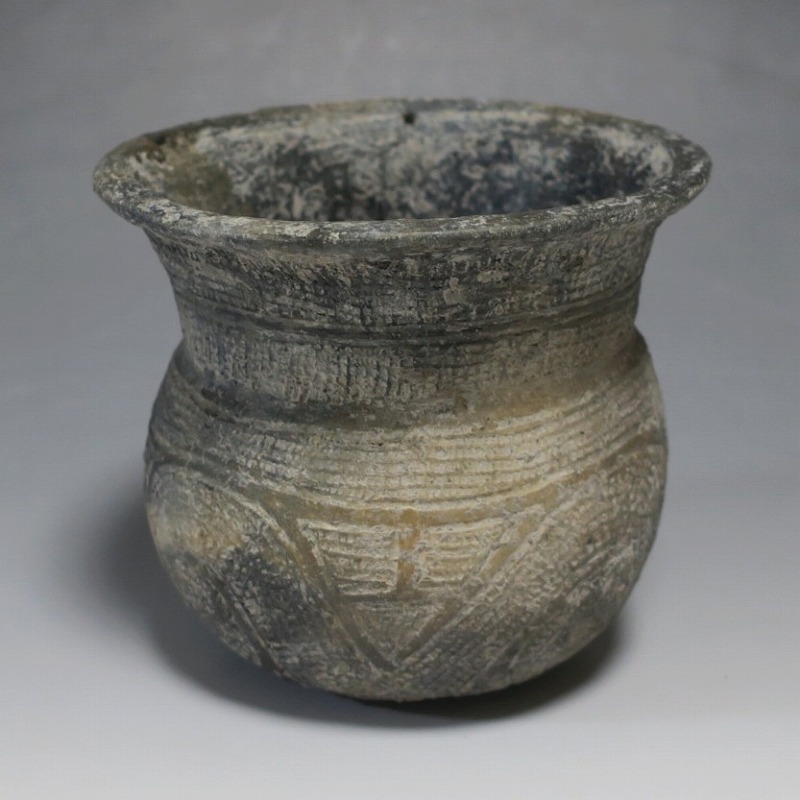 (タイ 紀元前500年) 商品番号 4069 高さ 約12.5cm/胴径 約11.8cm/口径 約13.5cm 発掘品のため全体的に土の付着があり、口辺に約2cmの欠けがあります。状態は写真でご確認ください。 バンチェン遺跡は、タイ・ウドーンターニー県・ノーンハーン郡にあるユネスコの世界遺産に登録されている古代遺跡です。紀元前数千年に発生したタイの有史以前の土器で、現在、この文明について研究が行われています。本品は紀元前500年前後に作られた線刻文土器。プリミティブな幾何学文が線刻された作品です。日本の弥生土器に似たシンプルな形をしています。造形を見ると、この土器を製作した民族が稲作民だったことが想像できます。古代を感じさせてくれるシンプルで美しい壺。インテリアや落としを使用して花器としてお楽しみください。 | ||