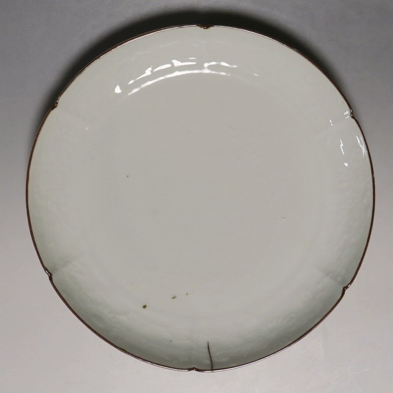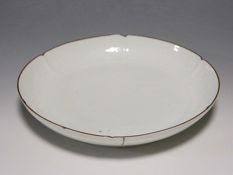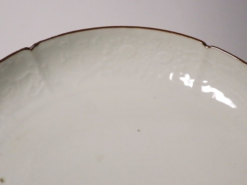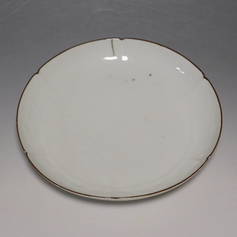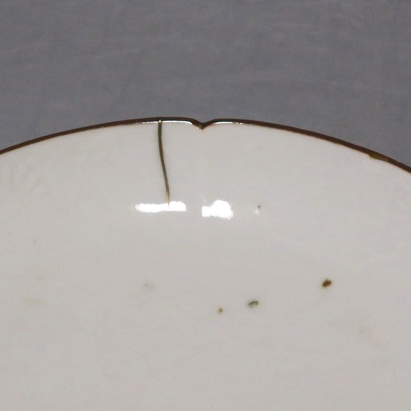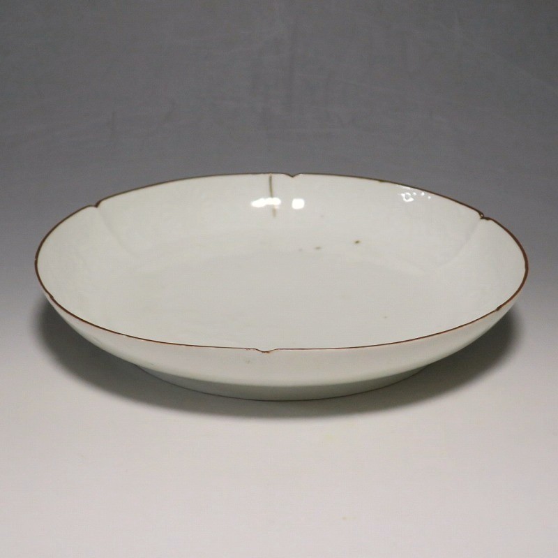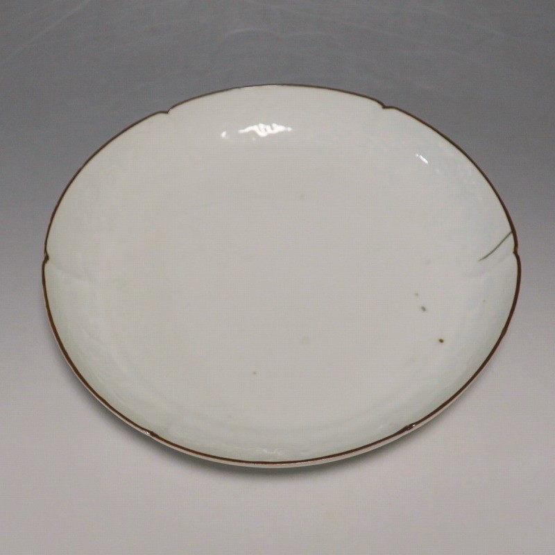 (江戸時代前期 延宝 17世紀後半) 商品番号 4074 口径 約18cm/高さ 約3cm/高台径 約12.5cm 口辺から約2cmの質の高い金直し、約5mmの共直し、極小のノミホツが複数あります。状態は写真でご確認ください。 17世紀後半、延宝時代(1673年〜1681年)になると伊万里焼の技術は最高潮に達します。この時代に作られた藍柿右衛門、白磁の皿は完成度を極め、その美しさは他の時代の伊万里焼の作品を凌駕しています。本品は延宝時代前後に作られた白磁陽刻輪花菊文の六寸皿。生地に型打で可愛らしい菊文が施されています。キズの部分を本金で直しているので上品さを失っていません。色彩のある料理を盛ると映えるでしょう。 | ||