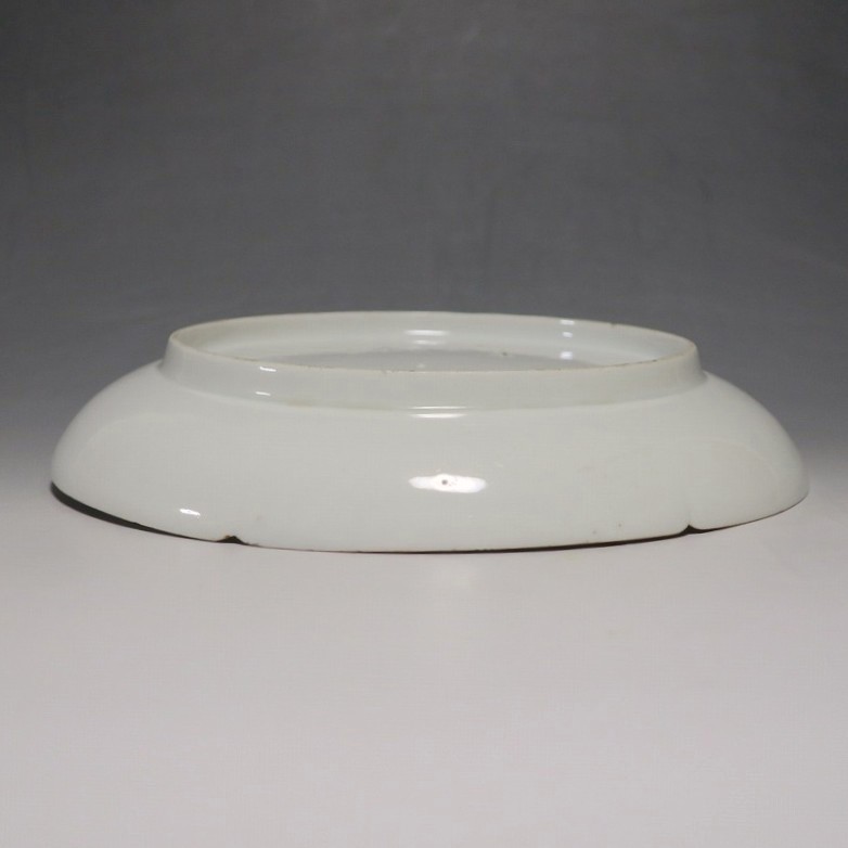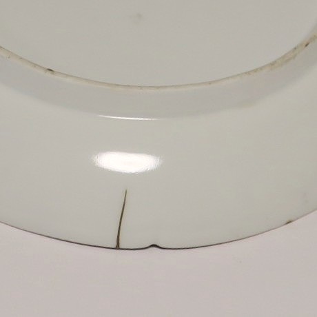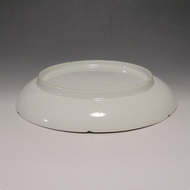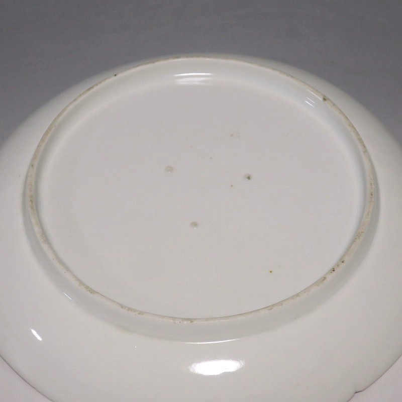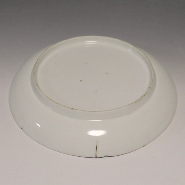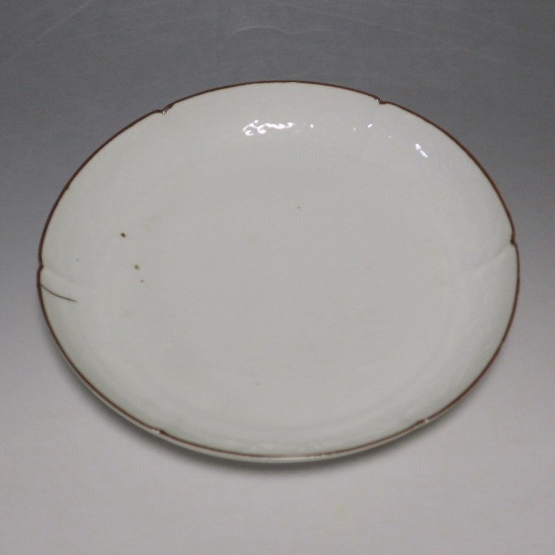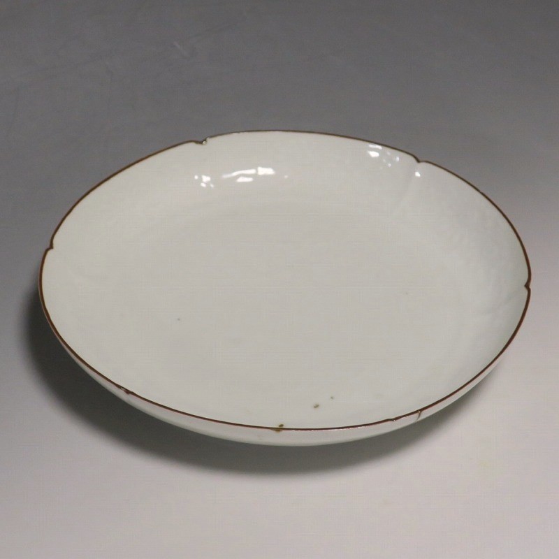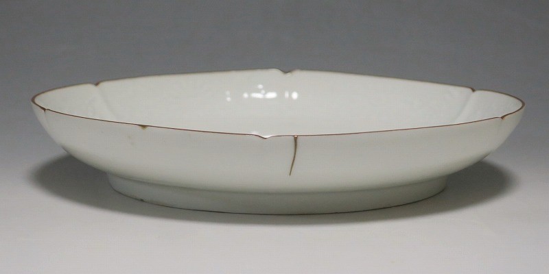(江戸時代前期 延宝 17世紀後半) 商品番号 4074 口径 約18cm/高さ 約3cm/高台径 約12.5cm 口辺から約2cmの質の高い金直し、約5mmの共直し、極小のノミホツが複数あります。状態は写真でご確認ください。 17世紀後半、延宝時代(1673年〜1681年)になると伊万里焼の技術は最高潮に達します。この時代に作られた藍柿右衛門、白磁の皿は完成度を極め、その美しさは他の時代の伊万里焼の作品を凌駕しています。本品は延宝時代前後に作られた白磁陽刻輪花菊文の六寸皿。生地に型打で可愛らしい菊文が施されています。キズの部分を本金で直しているので上品さを失っていません。色彩のある料理を盛ると映えるでしょう。 | ||