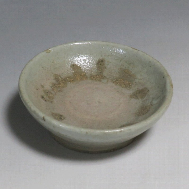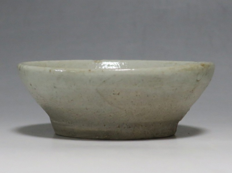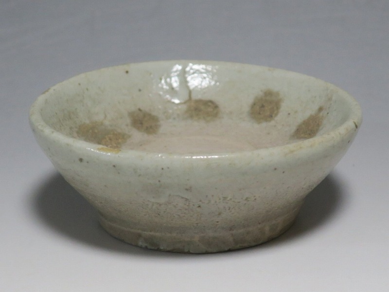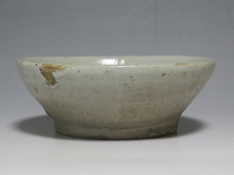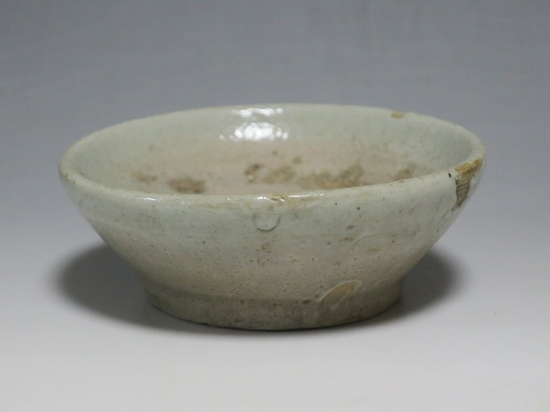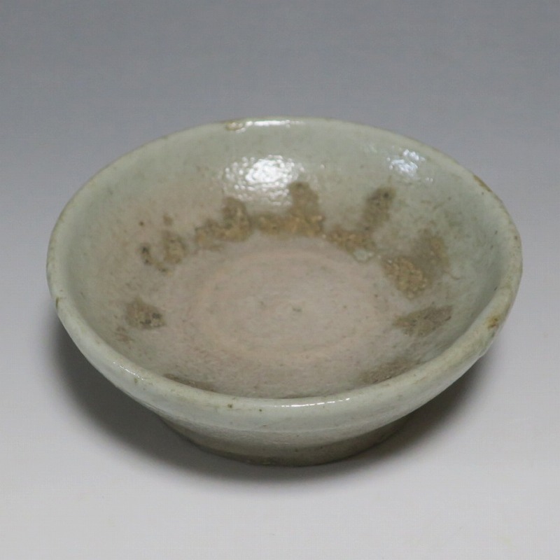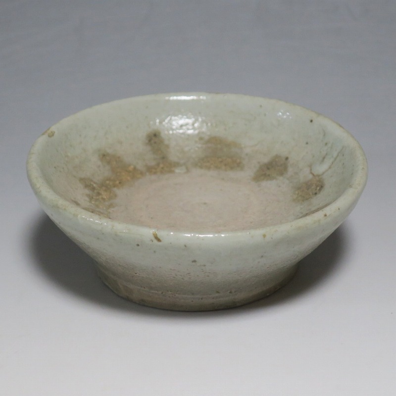 (李朝時代後期 19世紀前半) 商品番号 4084 口径 約9.7cm/高さ 約3.5cm/高台径 約6cm 窯傷はありますが完品です。状態は写真でご確認ください。 李朝には日本の唐津焼、萩焼などのルーツとなる陶器作品があります。それらの作品は暖色をしているので温かさを感じさせてくれます。本品は李朝時代後期に作られた灰釉の小皿。萩焼のような肌合いをした作品です。見込みの目跡が景色となっています。市場で見かけないタイプの珍しい作品。日本酒を飲む時の酒の当てを盛ると雰囲気が出るでしょう。 | ||