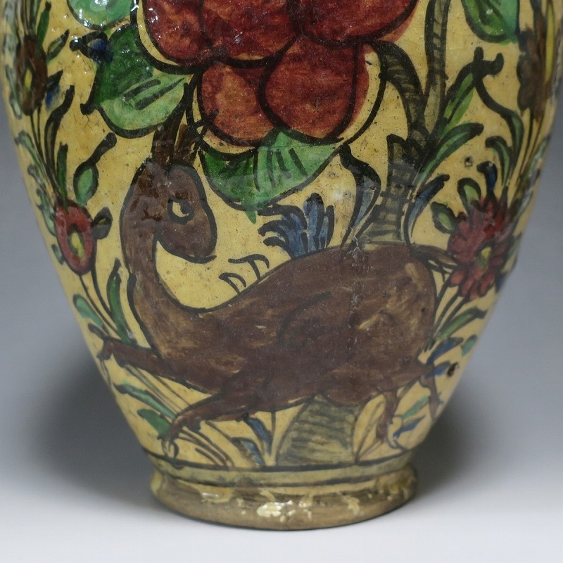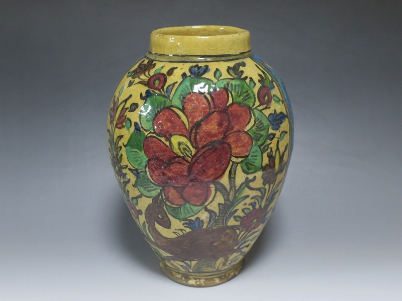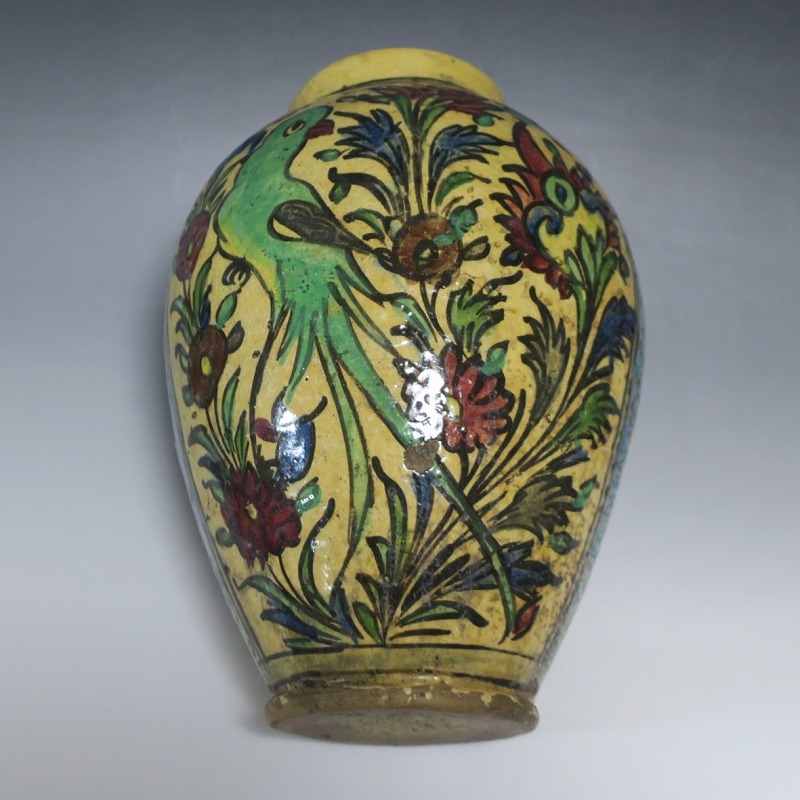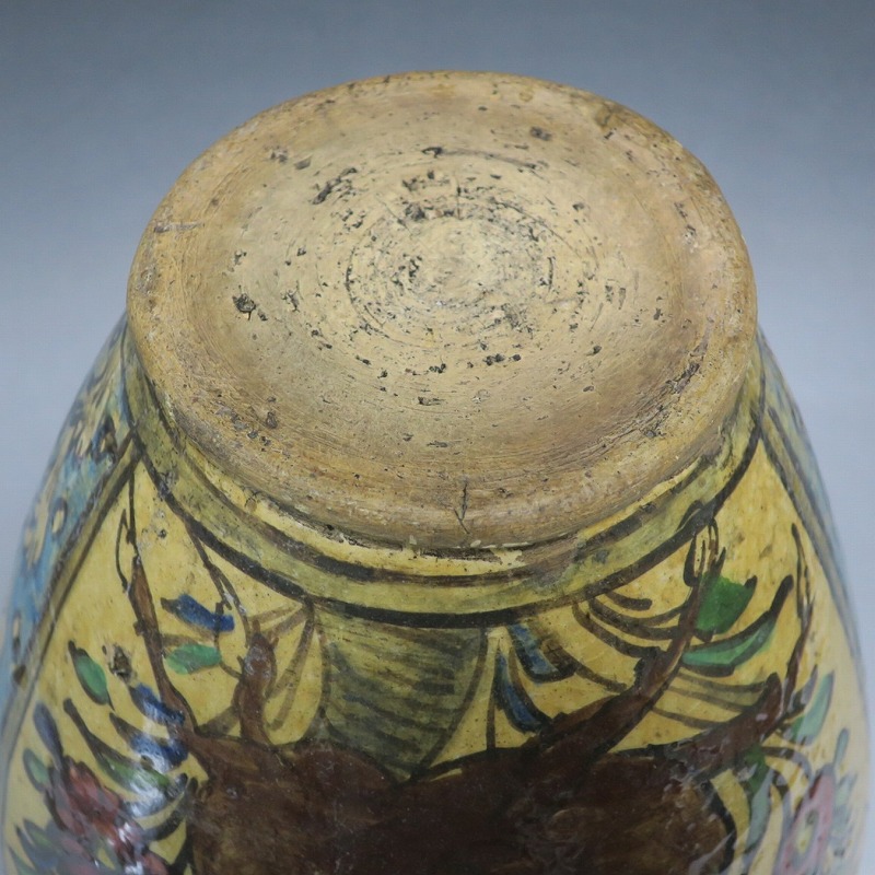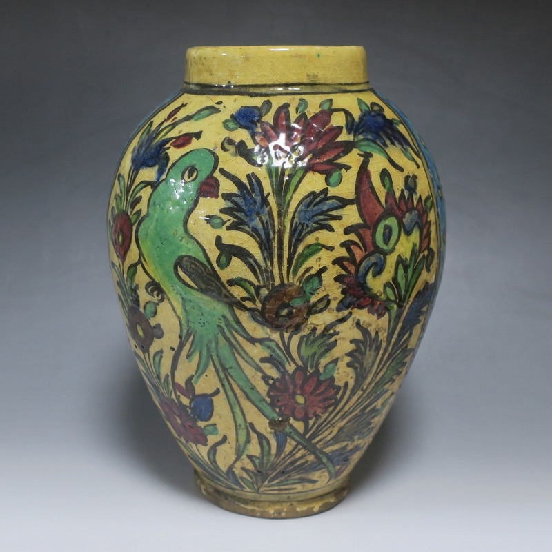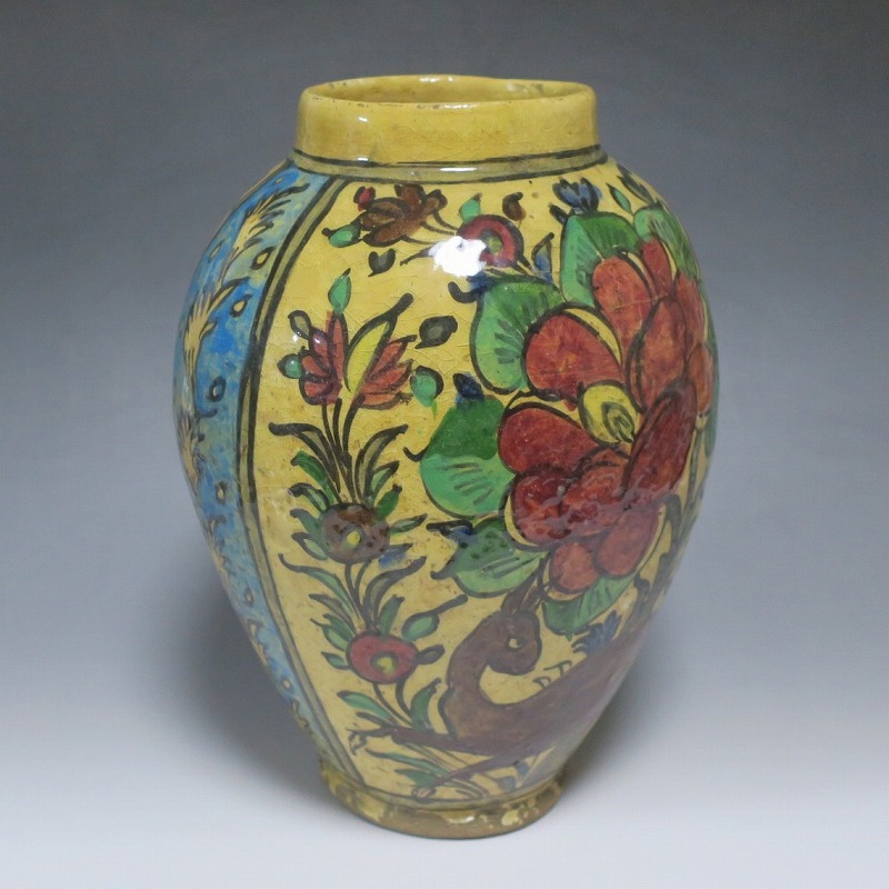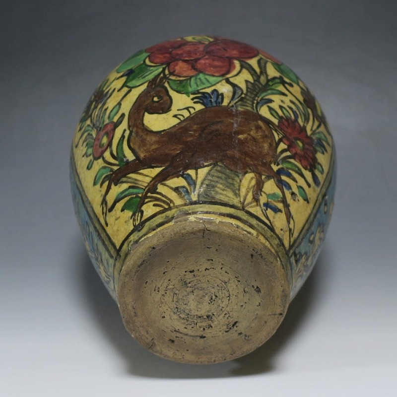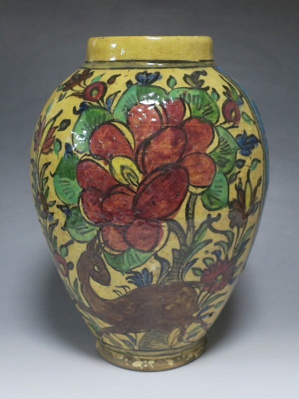 高さ 約31cm/胴径 約22cm 窯傷や経年の汚れがありますが、総じて良い状態です。柔らかい陶器質ですので、花を生ける際は落としをご使用ください。状態は写真でご確認ください。 マジョリカ焼はルネッサンス期にイタリアで発明された錫釉陶器です。16世紀には世界各地に広がり、日常雑器としても使用されるようになりました。本品は20世紀前半、イランのガージャール朝後期に製作された色絵の花鳥鹿文壺。李朝民画のような素朴な絵が描かれた作品です。マティスが描くデザインのような模様やユーモラスな表情の鳥や鹿が描かれています。西域の民芸を感じさせてくれる素朴な壺。インテリアとしてお楽しみください。 | ||