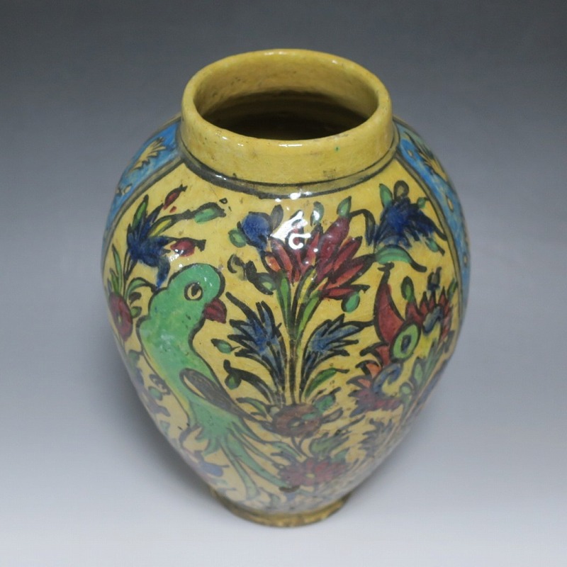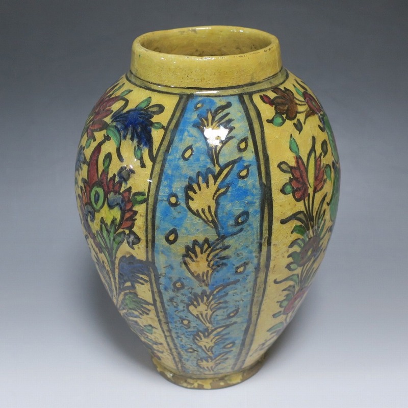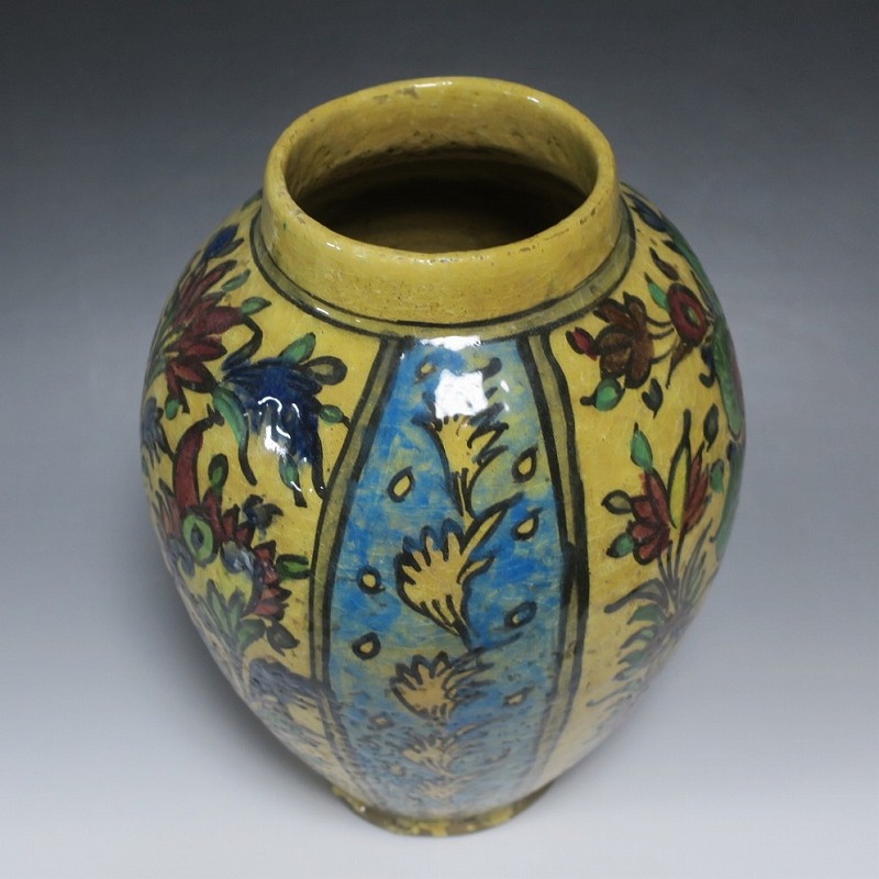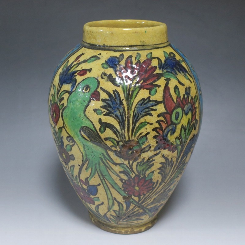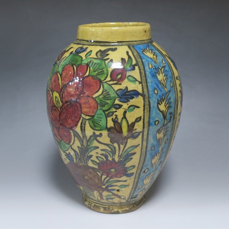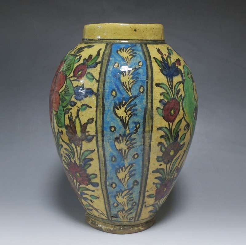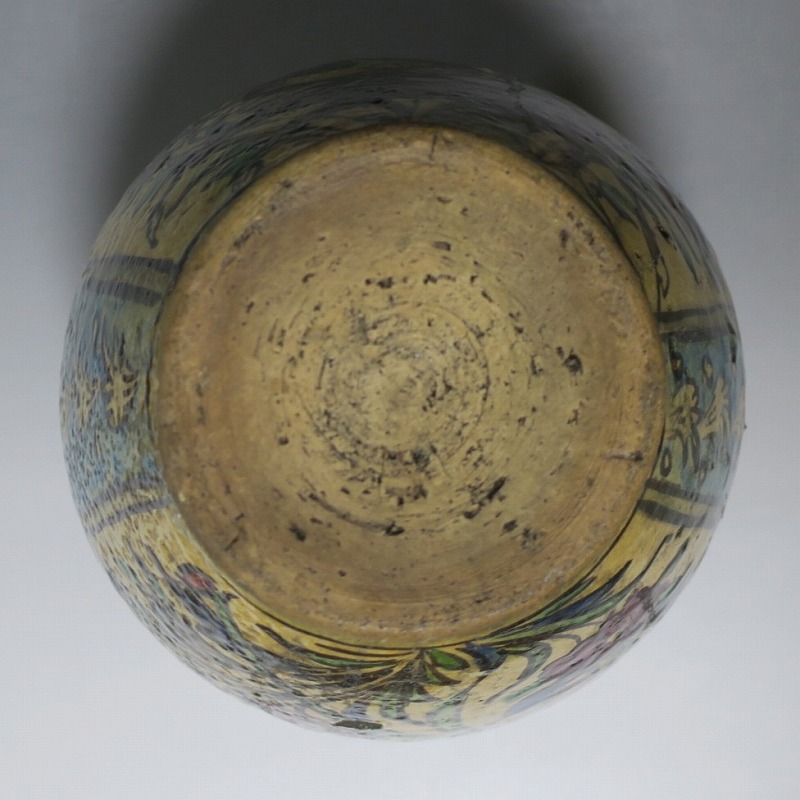 高さ 約31cm/胴径 約22cm 窯傷や経年の汚れがありますが、総じて良い状態です。柔らかい陶器質ですので、花を生ける際は落としをご使用ください。状態は写真でご確認ください。 マジョリカ焼はルネッサンス期にイタリアで発明された錫釉陶器です。16世紀には世界各地に広がり、日常雑器としても使用されるようになりました。本品は20世紀前半、イランのガージャール朝後期に製作された色絵の花鳥鹿文壺。李朝民画のような素朴な絵が描かれた作品です。マティスが描くデザインのような模様やユーモラスな表情の鳥や鹿が描かれています。西域の民芸を感じさせてくれる素朴な壺。インテリアとしてお楽しみください。 | ||