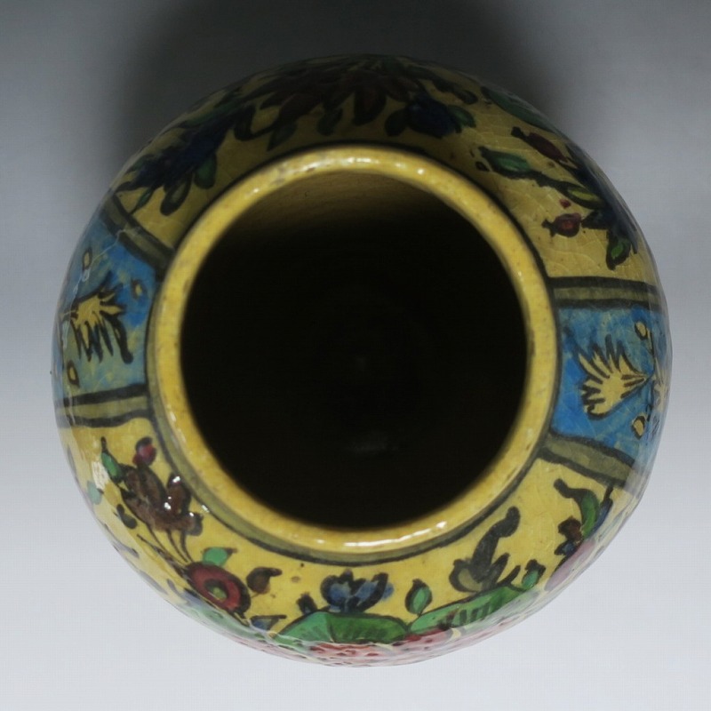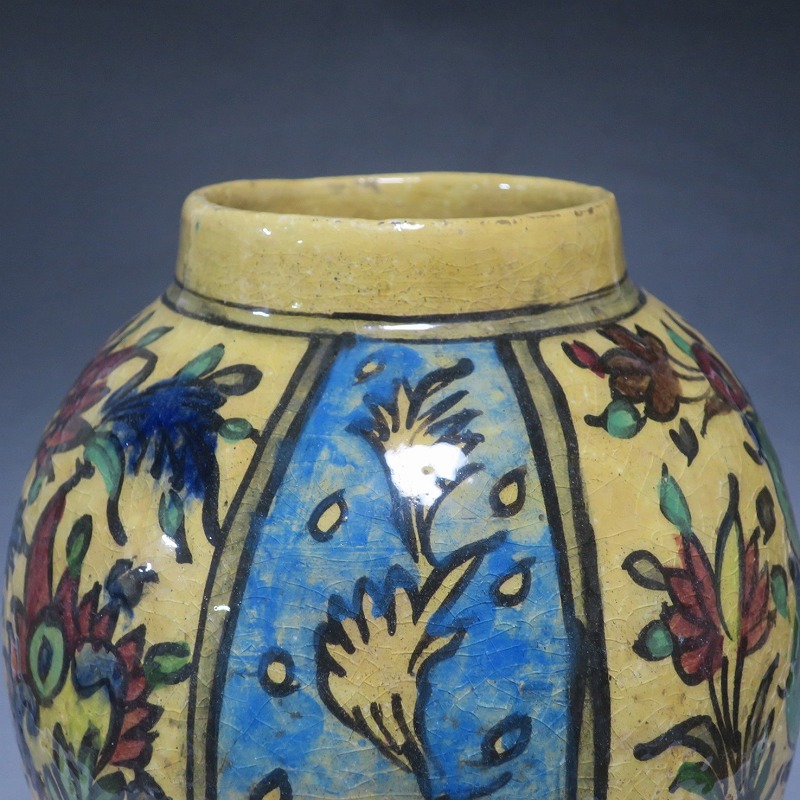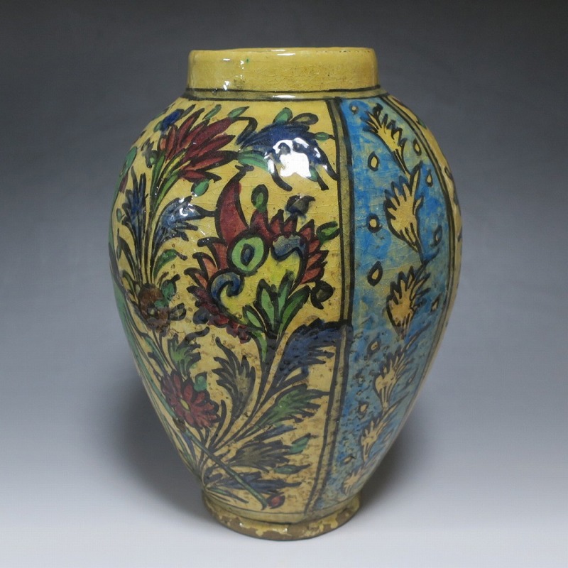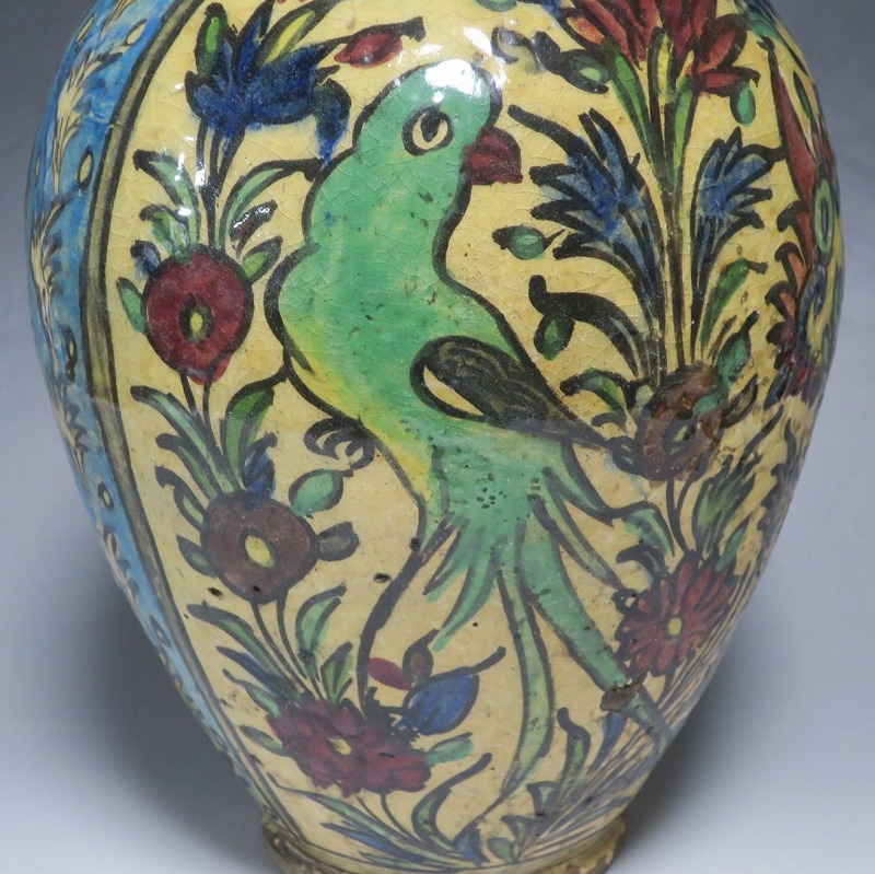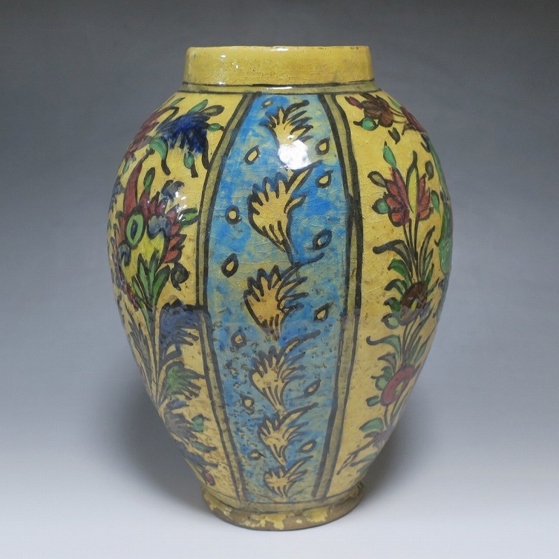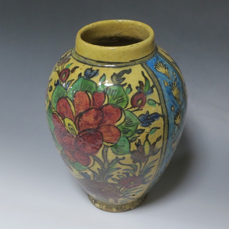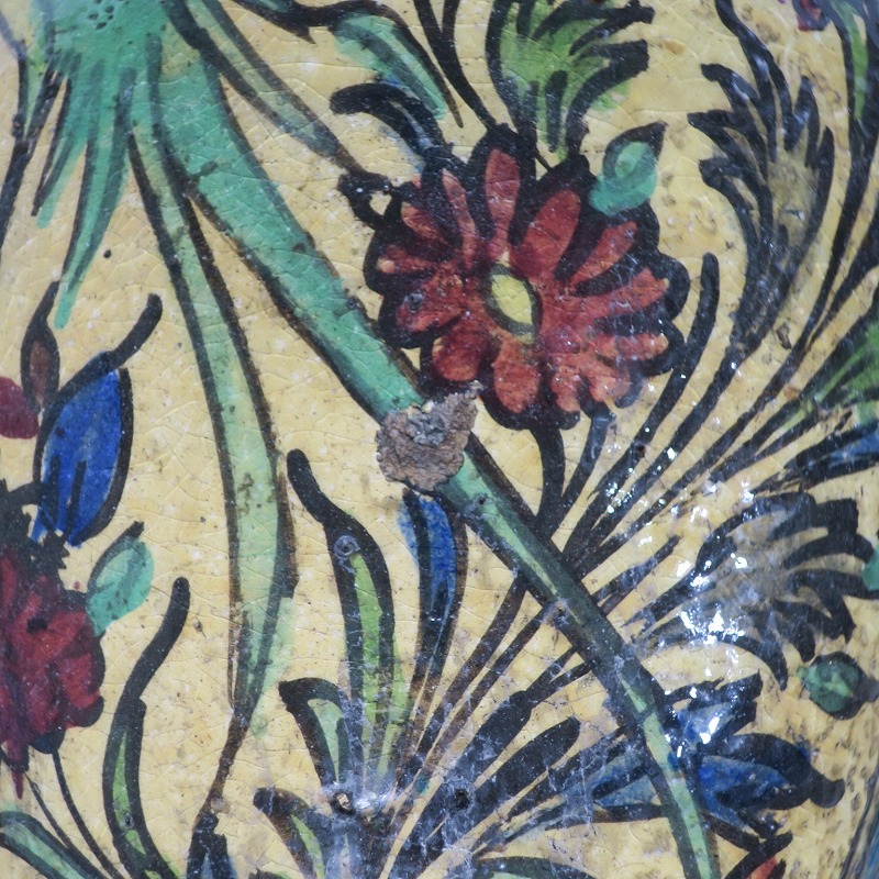 高さ 約31cm/胴径 約22cm 窯傷や経年の汚れがありますが、総じて良い状態です。柔らかい陶器質ですので、花を生ける際は落としをご使用ください。状態は写真でご確認ください。 マジョリカ焼はルネッサンス期にイタリアで発明された錫釉陶器です。16世紀には世界各地に広がり、日常雑器としても使用されるようになりました。本品は20世紀前半、イランのガージャール朝後期に製作された色絵の花鳥鹿文壺。李朝民画のような素朴な絵が描かれた作品です。マティスが描くデザインのような模様やユーモラスな表情の鳥や鹿が描かれています。西域の民芸を感じさせてくれる素朴な壺。インテリアとしてお楽しみください。 | ||