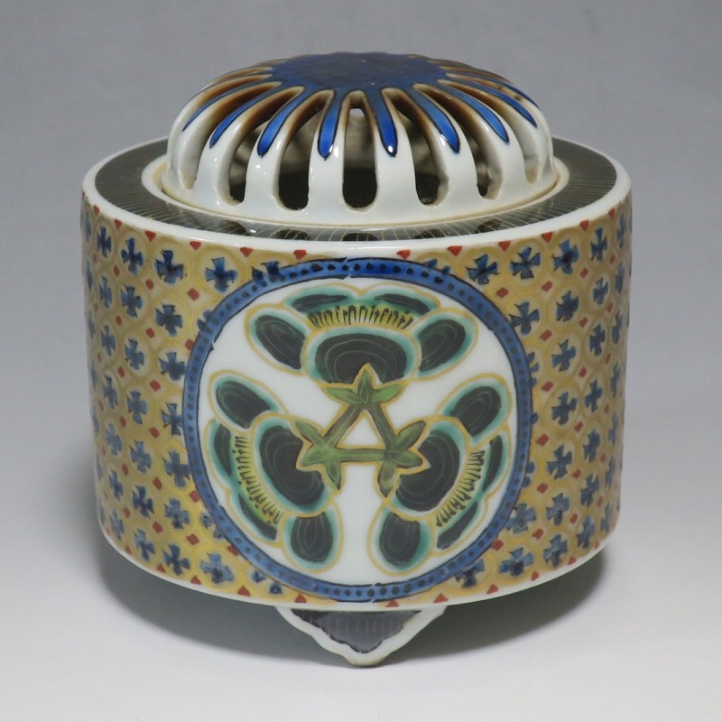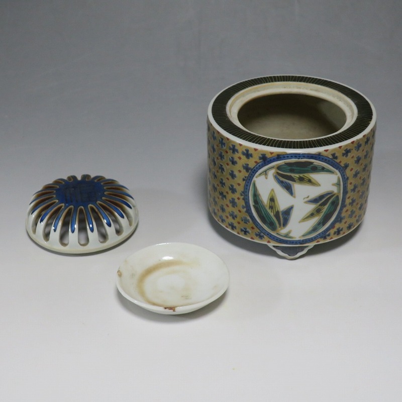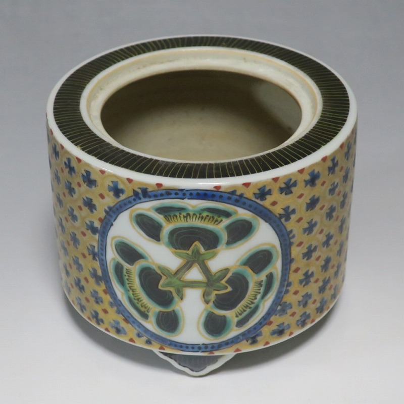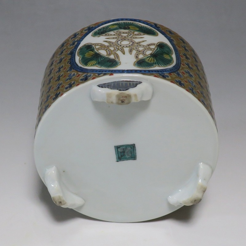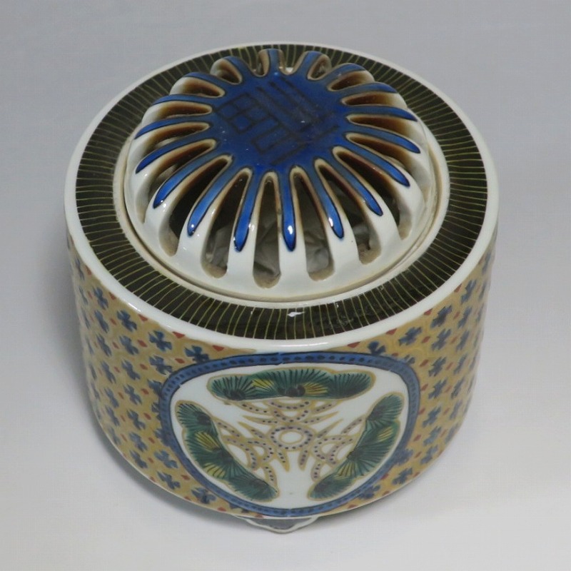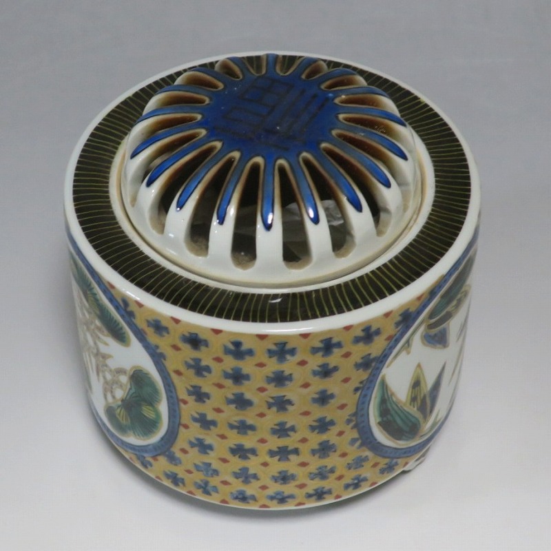 高さ 約9cm/横幅 約10.2cm 経年の使用による汚れがありますが、完品です。状態は写真でご確認ください。 九谷焼は石川県で生産される代表的な陶磁器です。江戸時代前期から現在まで九谷焼は長きにわたって、多様性のある作品を作り続けています。本品は昭和時代に作られた色絵松竹梅文の香炉。松竹梅と幾何学の文様をデザインした洒落た作品です。前所有者が実際に本品を使っていたようで、香の臭いが残っています。作家の詳細は不明ですが、丁寧に絵付けされた香炉。本品を使って好きな香を炊くとリラックスできると思います。 | ||