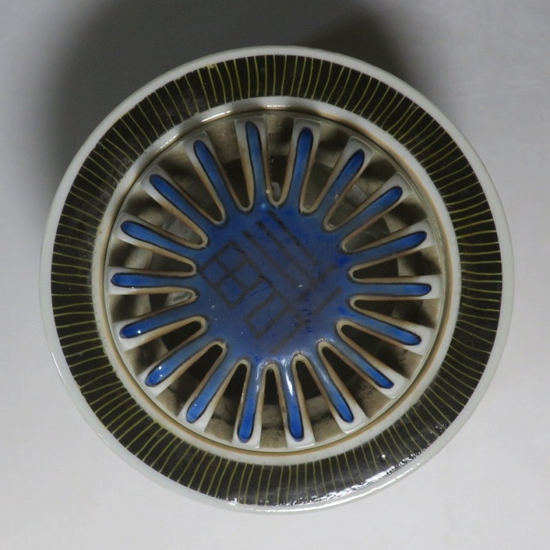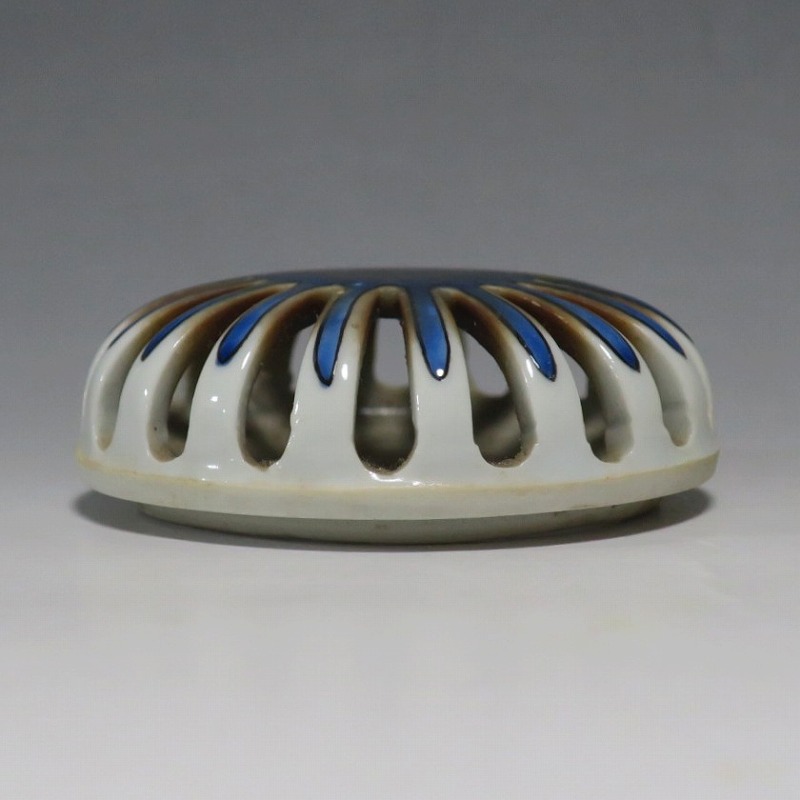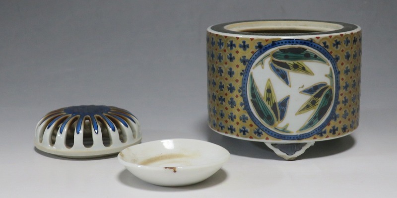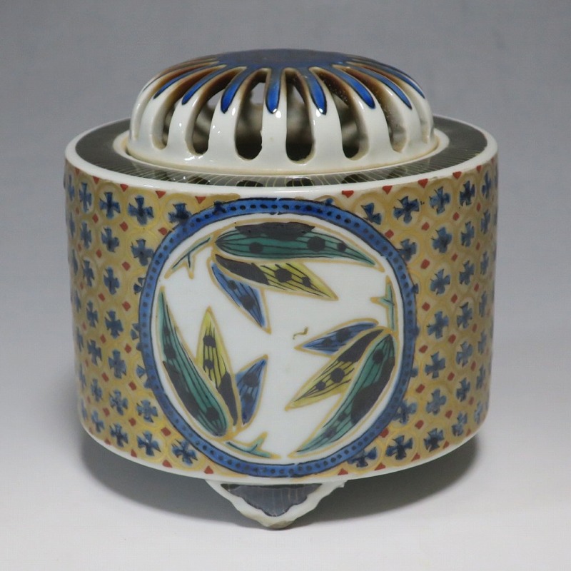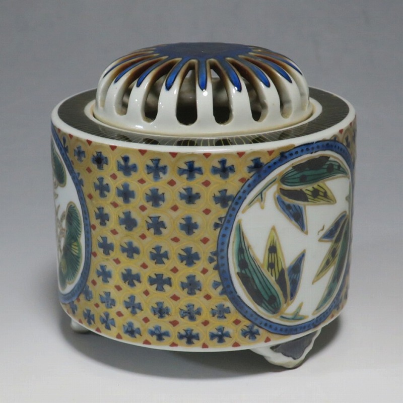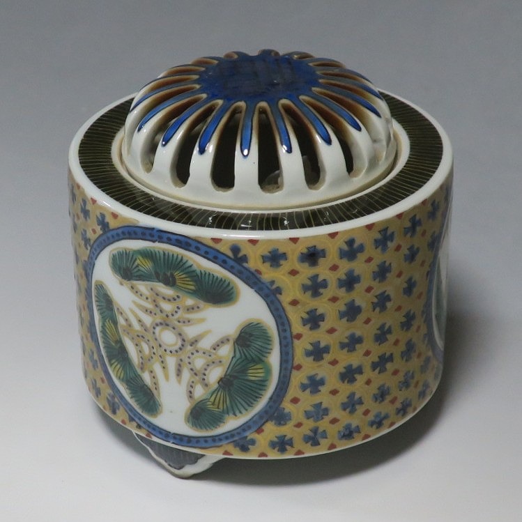 高さ 約9cm/横幅 約10.2cm 経年の使用による汚れがありますが、完品です。状態は写真でご確認ください。 九谷焼は石川県で生産される代表的な陶磁器です。江戸時代前期から現在まで九谷焼は長きにわたって、多様性のある作品を作り続けています。本品は昭和時代に作られた色絵松竹梅文の香炉。松竹梅と幾何学の文様をデザインした洒落た作品です。前所有者が実際に本品を使っていたようで、香の臭いが残っています。作家の詳細は不明ですが、丁寧に絵付けされた香炉。本品を使って好きな香を炊くとリラックスできると思います。 | ||