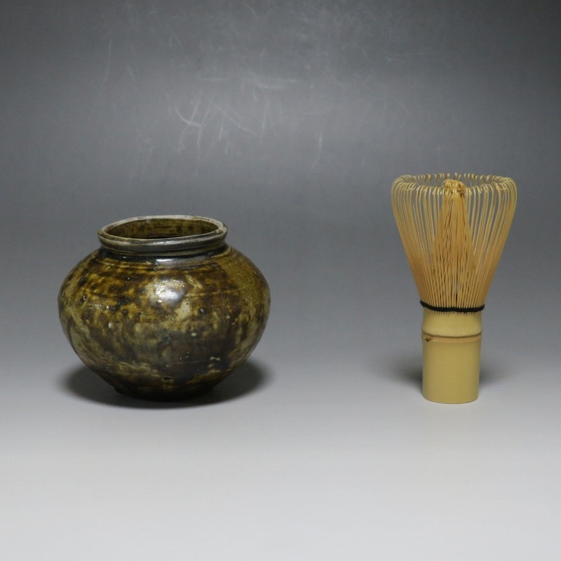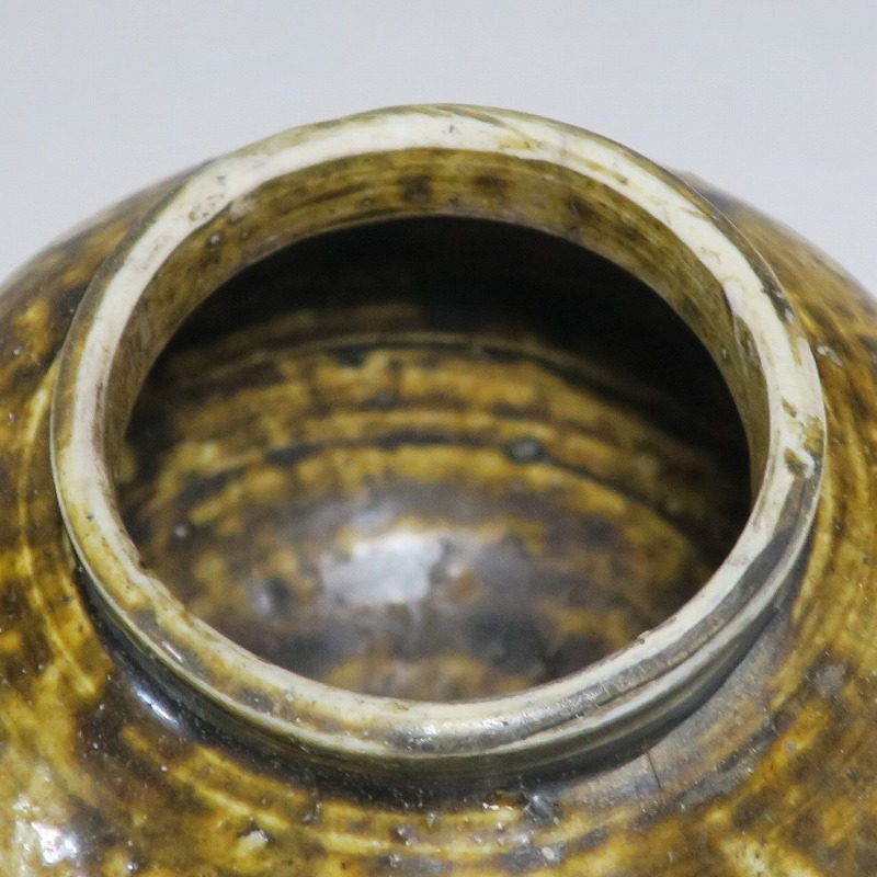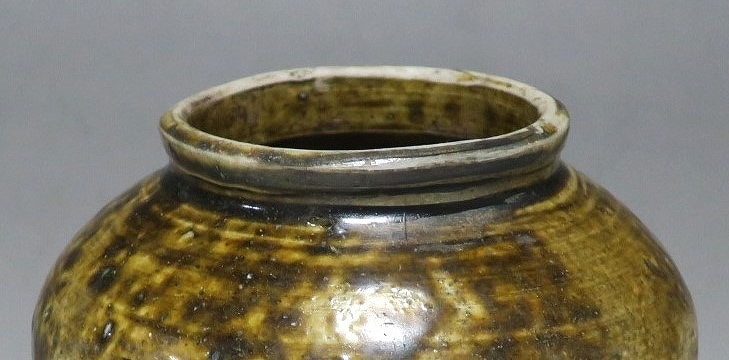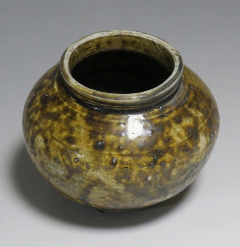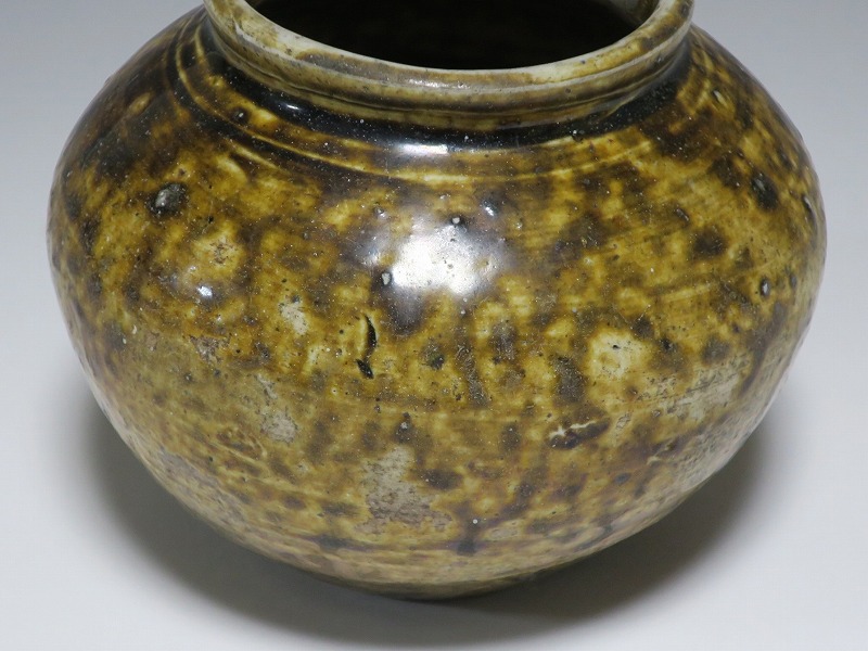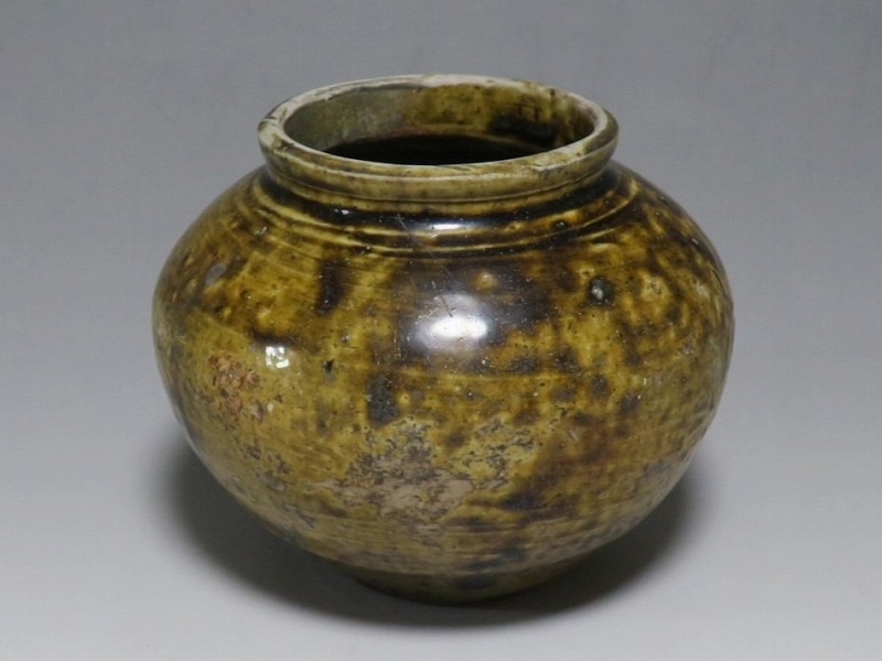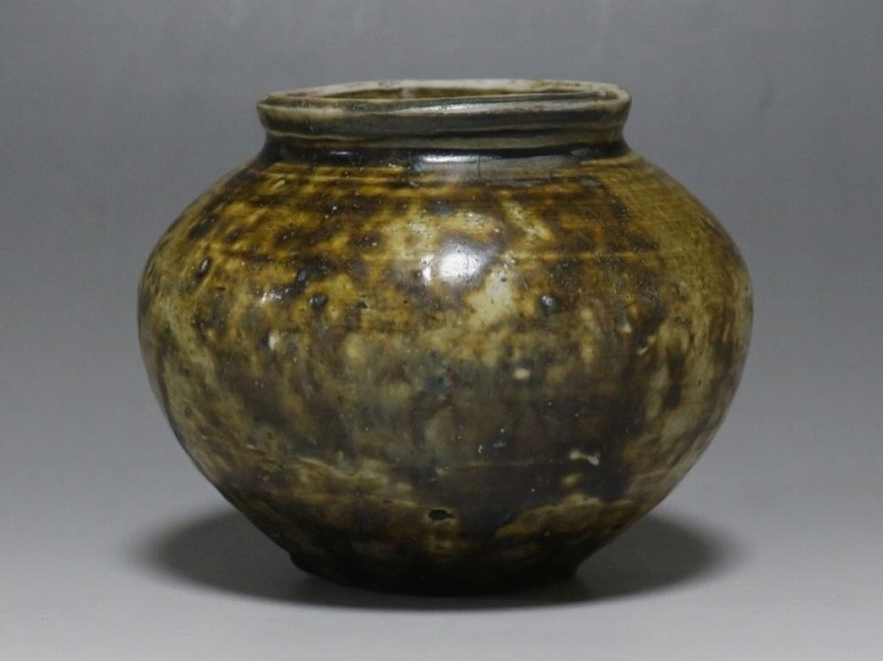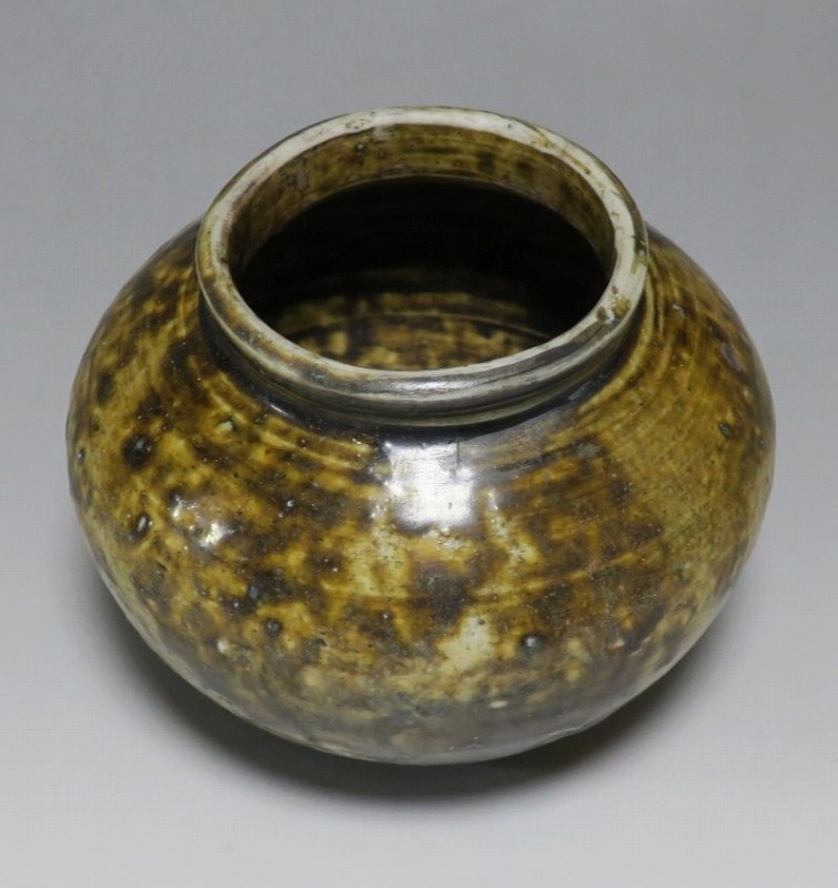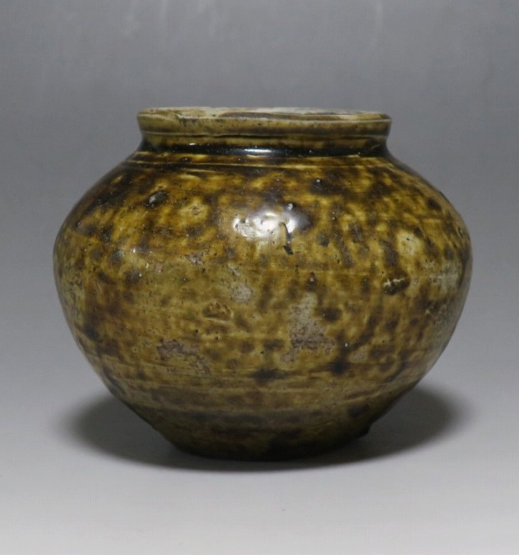 高さ 約8.6cm/胴径 約10.7cm 口辺に約4cmの直しと約2.5cmのニュウがあります。状態は写真でご確認ください。 李朝後時代後期、陶工たちは生活用具として鉄釉の雑器を多数製作しました。陶工たちは気分に合わせて製作したようで、作品はそれぞれ微妙に異なった造形をしています。本品は全体に鉄釉が掛かった小壺。調味料や薬味を保存するために作られた作品です。一般的にこのような造形の壺は白磁や染付で作られていることが多いですが、本品は鉄釉が掛かています。釉薬の変化が景色になっている小ぶりな作品。インテリア、花器としてお楽しみください。 | ||