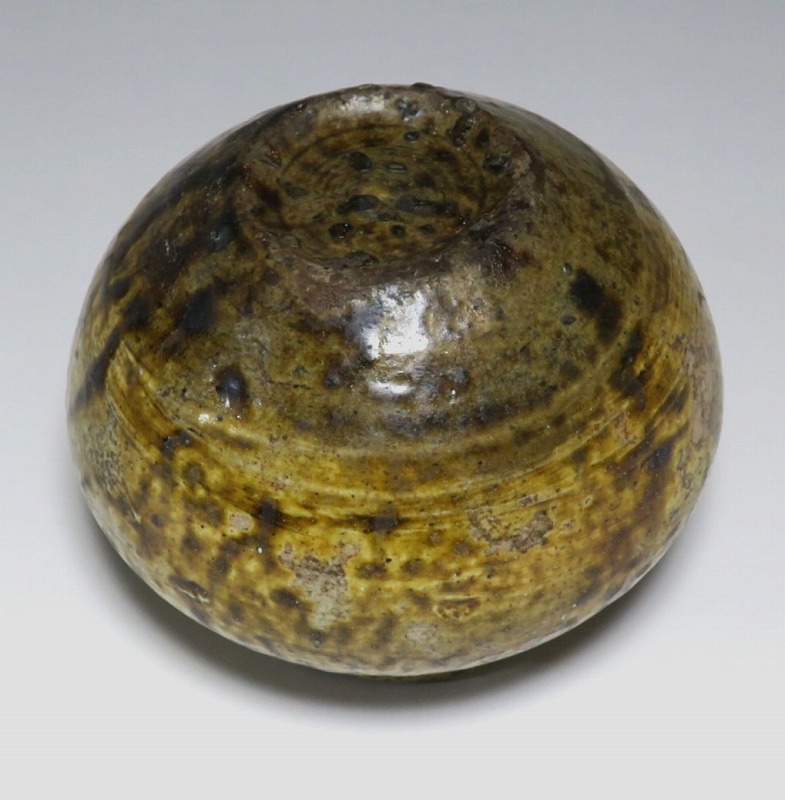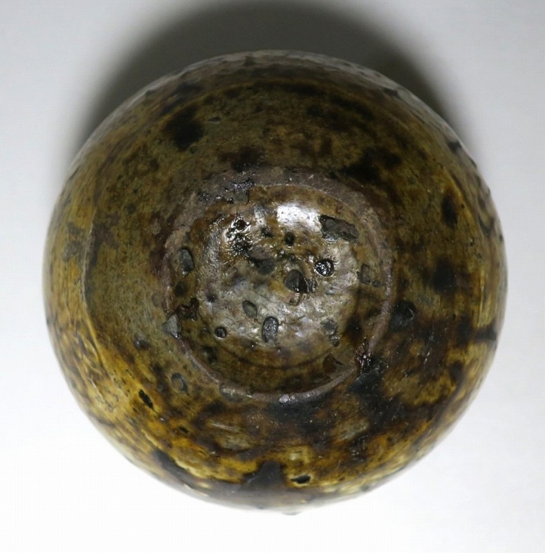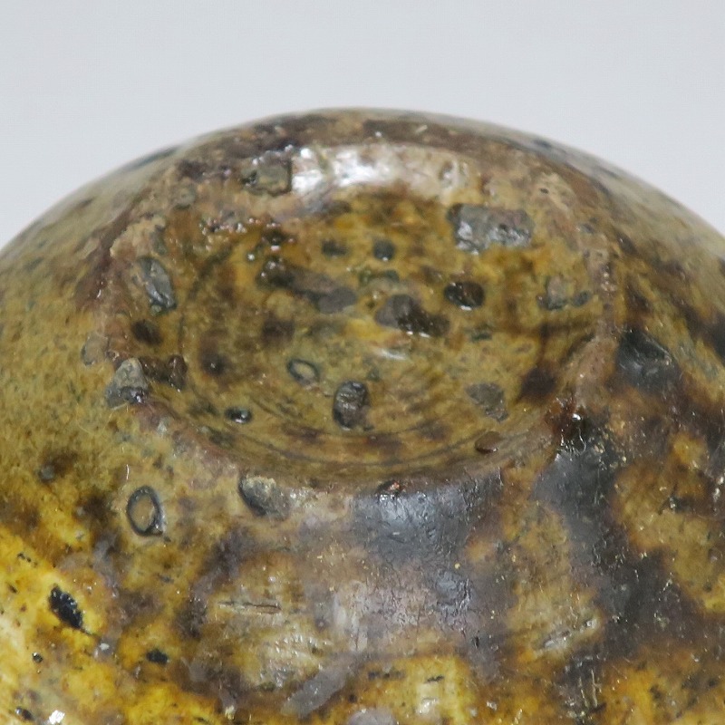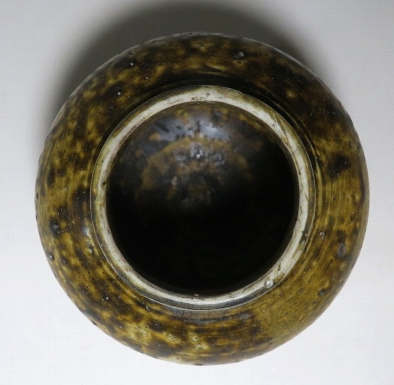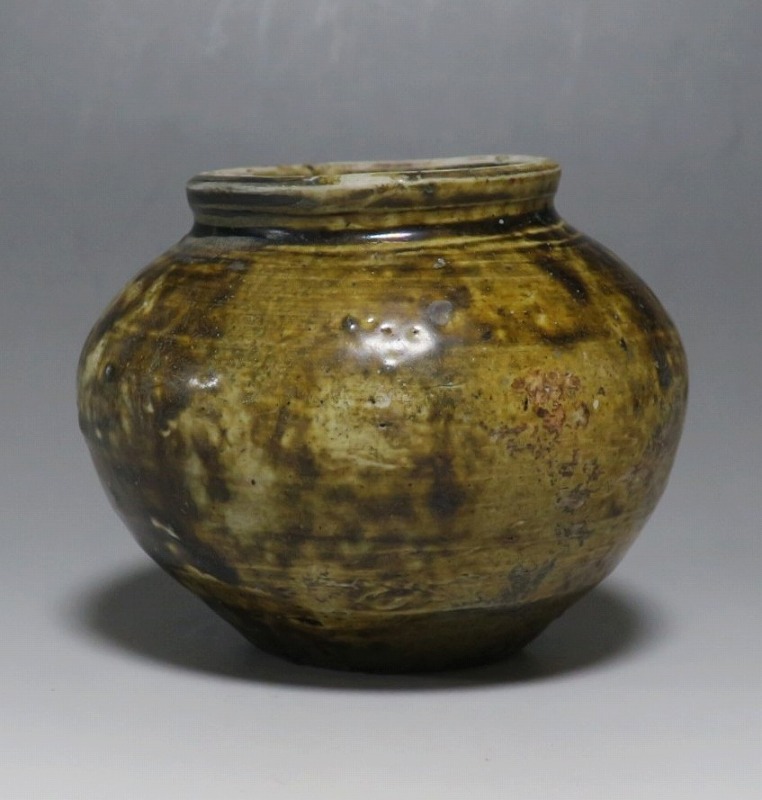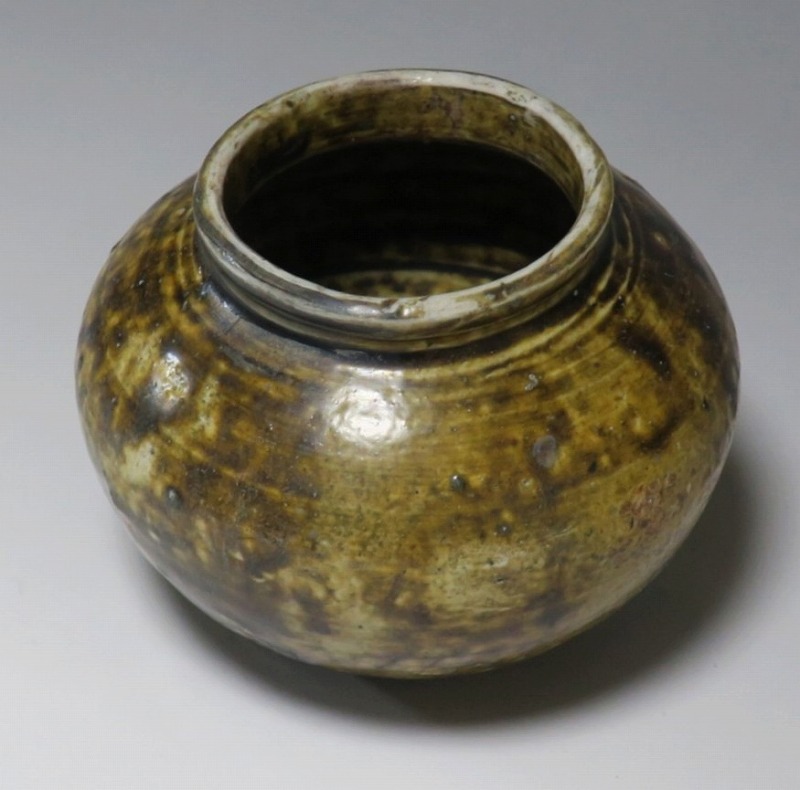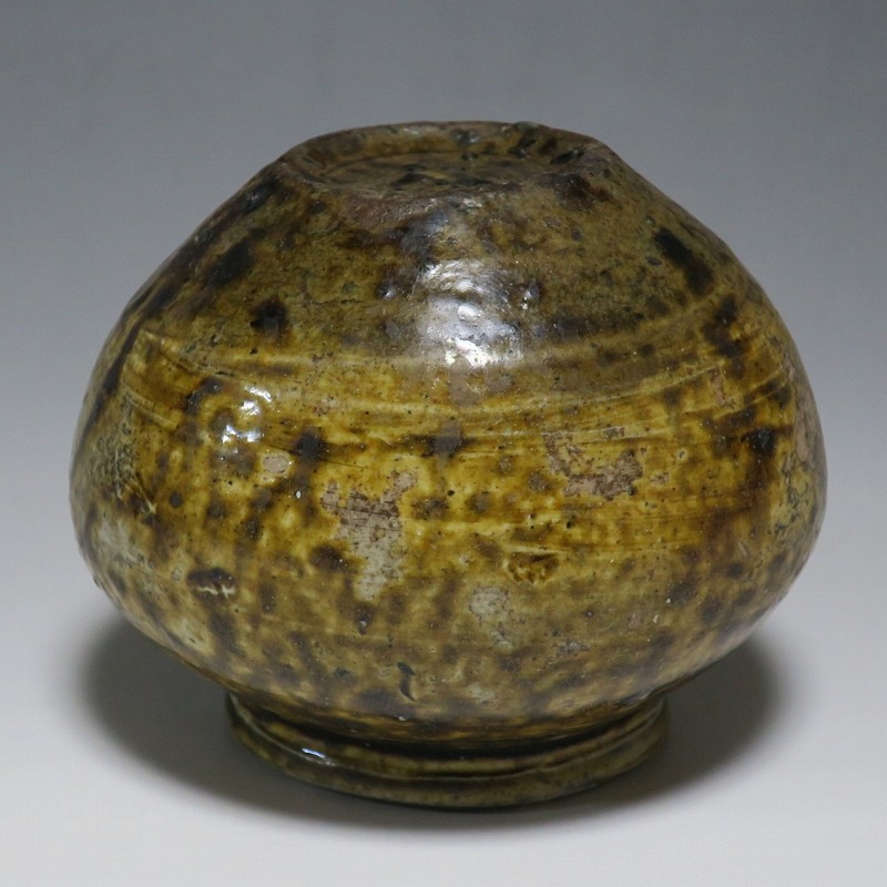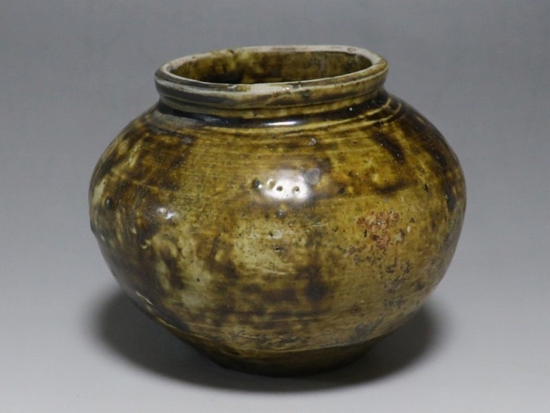 高さ 約8.6cm/胴径 約10.7cm 口辺に約4cmの直しと約2.5cmのニュウがあります。状態は写真でご確認ください。 李朝後時代後期、陶工たちは生活用具として鉄釉の雑器を多数製作しました。陶工たちは気分に合わせて製作したようで、作品はそれぞれ微妙に異なった造形をしています。本品は全体に鉄釉が掛かった小壺。調味料や薬味を保存するために作られた作品です。一般的にこのような造形の壺は白磁や染付で作られていることが多いですが、本品は鉄釉が掛かています。釉薬の変化が景色になっている小ぶりな作品。インテリア、花器としてお楽しみください。 | ||