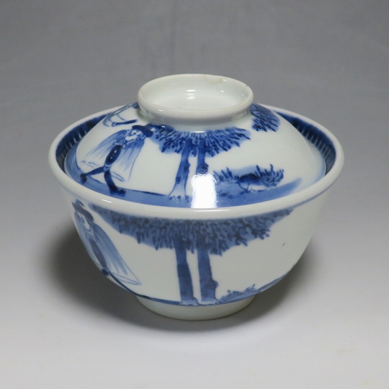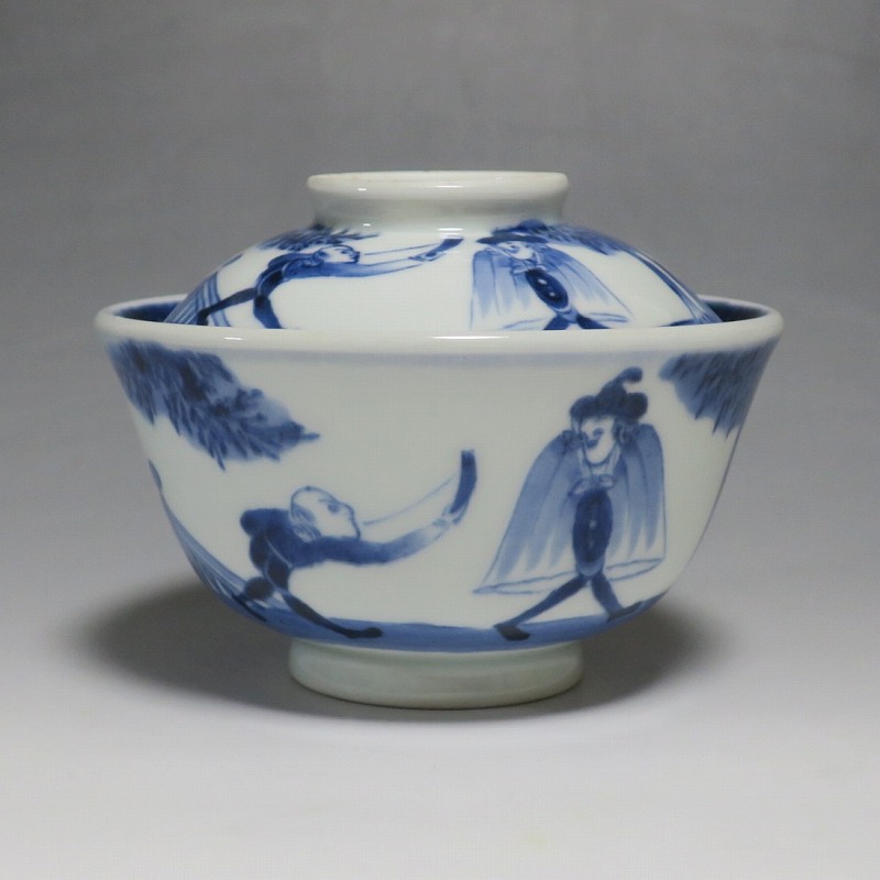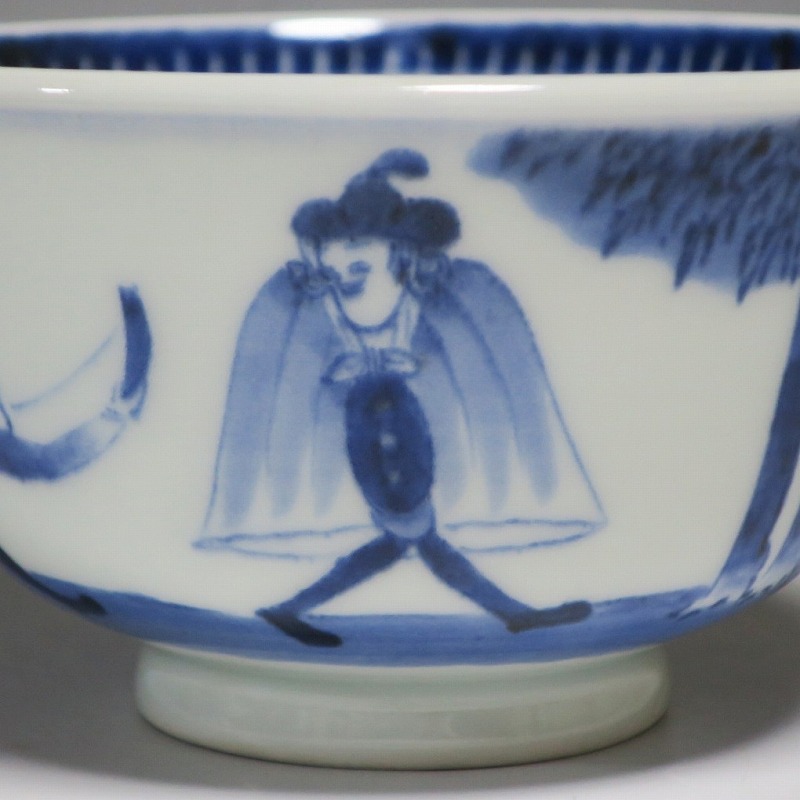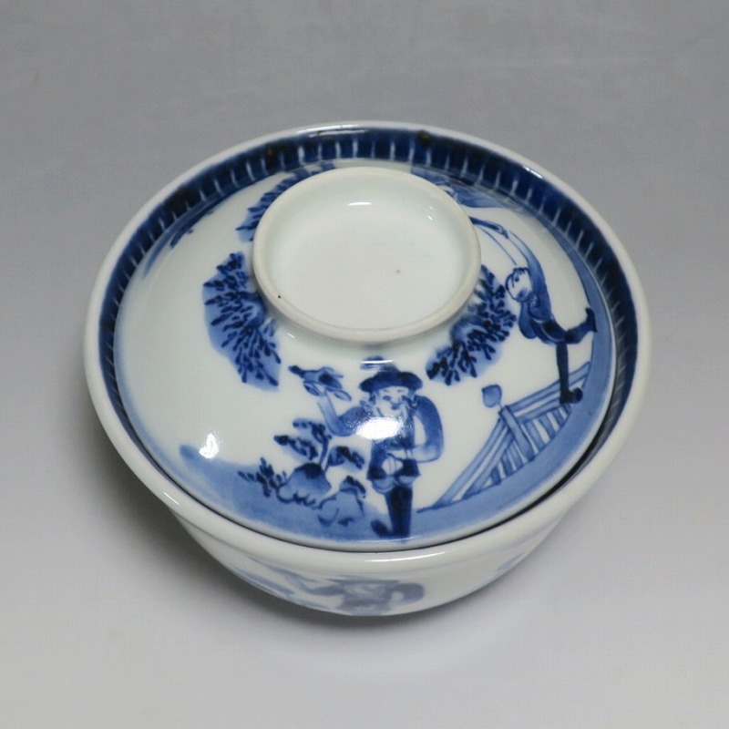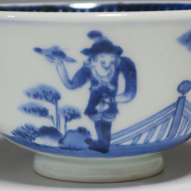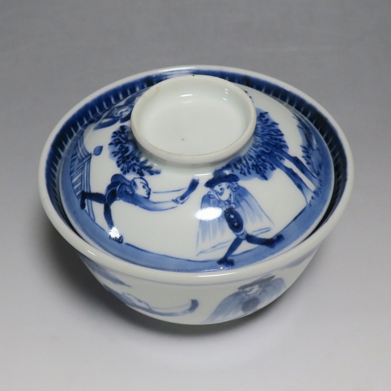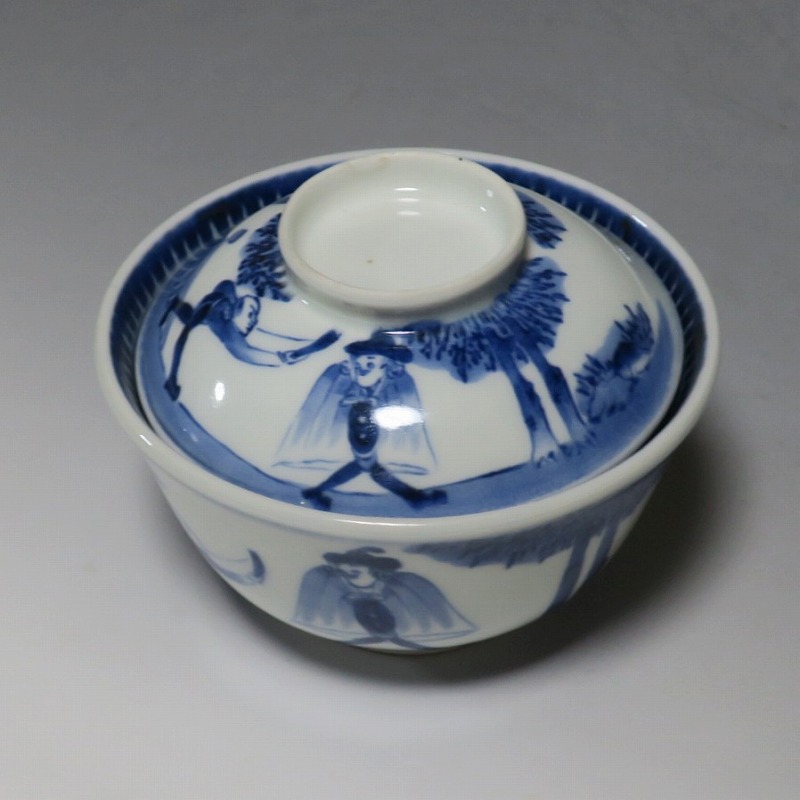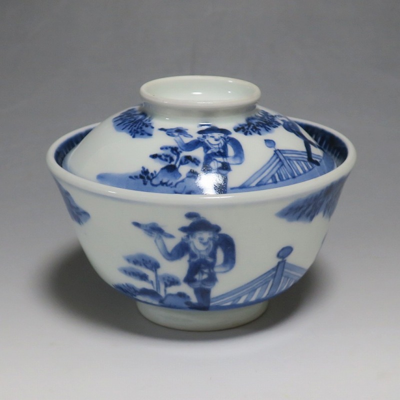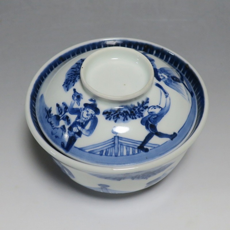 (江戸時代後期 18世紀後半) 商品番号 4102 口径 約12cm/高さ 約7cm 窯傷や蓋の持ち手部分に薄い当たり跡があります。状態は写真でご確認ください。 18世紀後半、長崎に伝播した蘭学や清学が流行します。その影響は磁器作品にも及び、有田では南蛮人を描いた作品が作られるようになりました。本品は経済政策を推進した田沼時代に作られた染付の南蛮人蓋茶碗。美しい呉須の発色、興味深い南蛮人の様子を描いた作品です。見ていると江戸時代の日蘭貿易の雰囲気が伝わってきます。観賞用、食器としてお楽しみください。 | ||