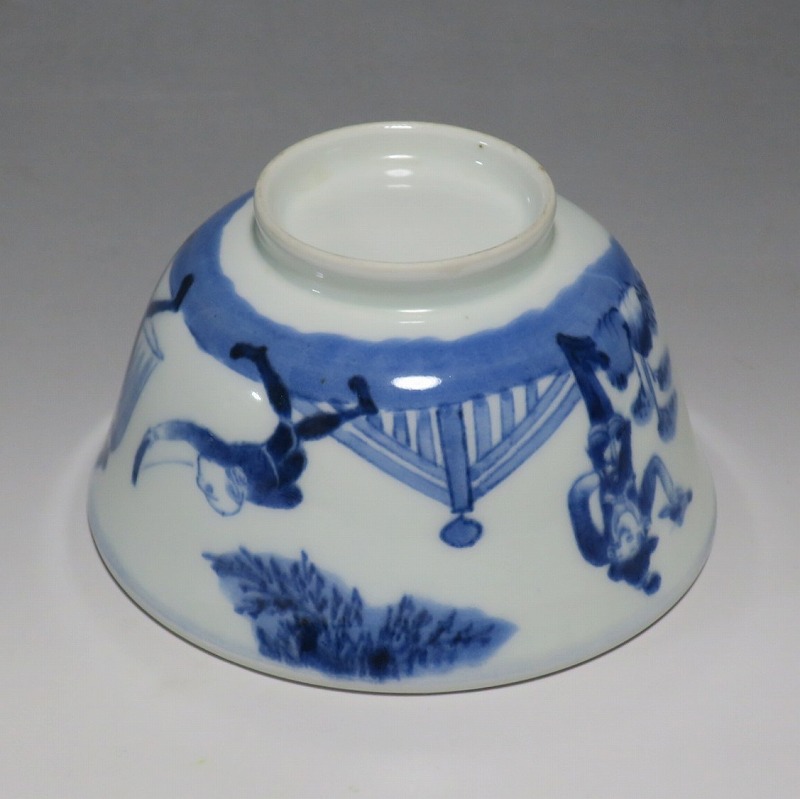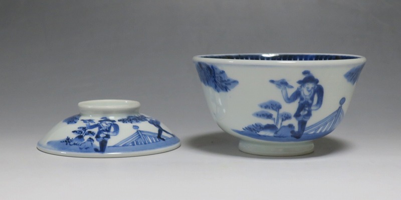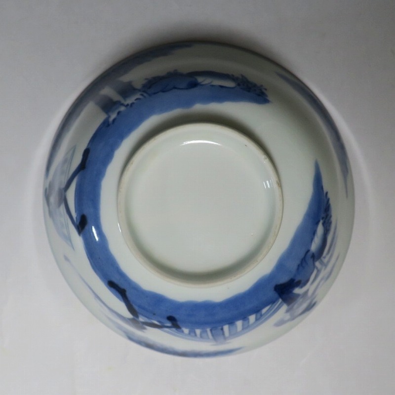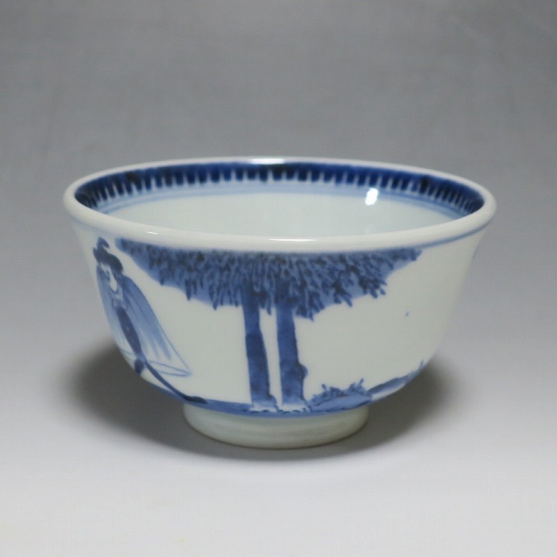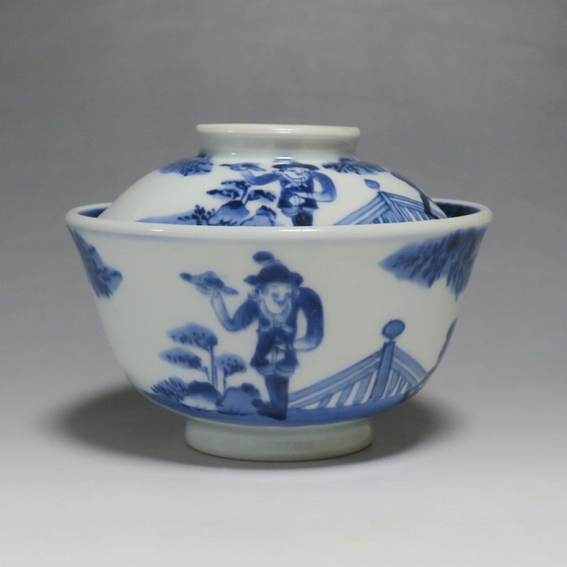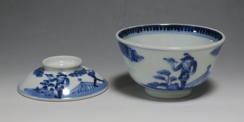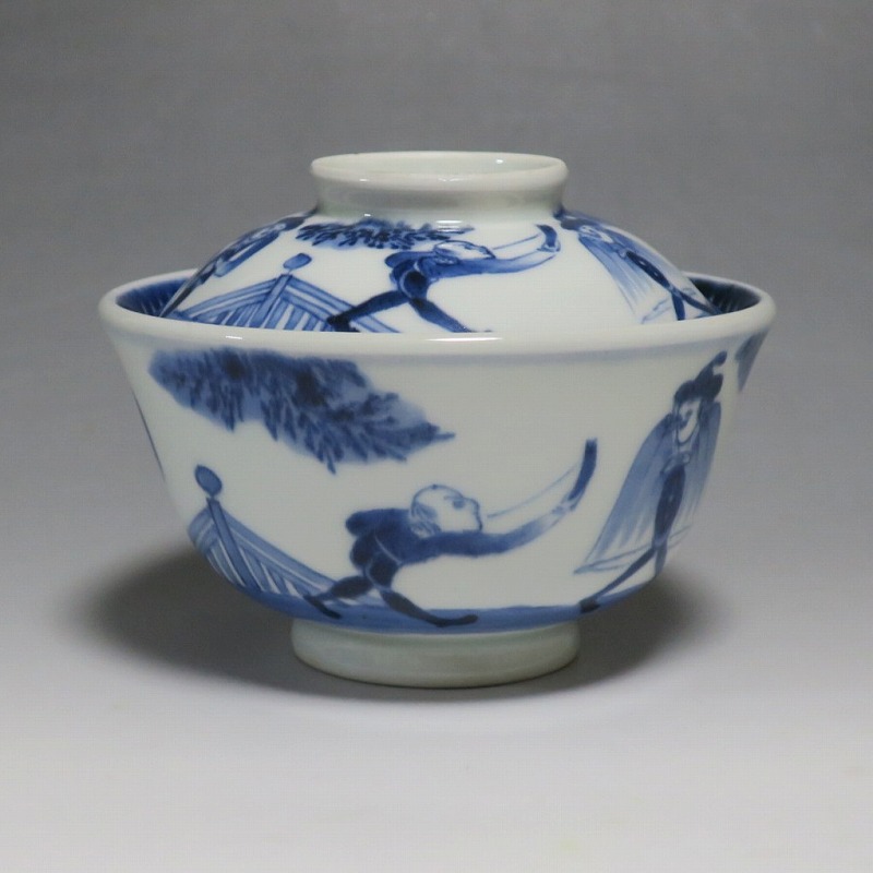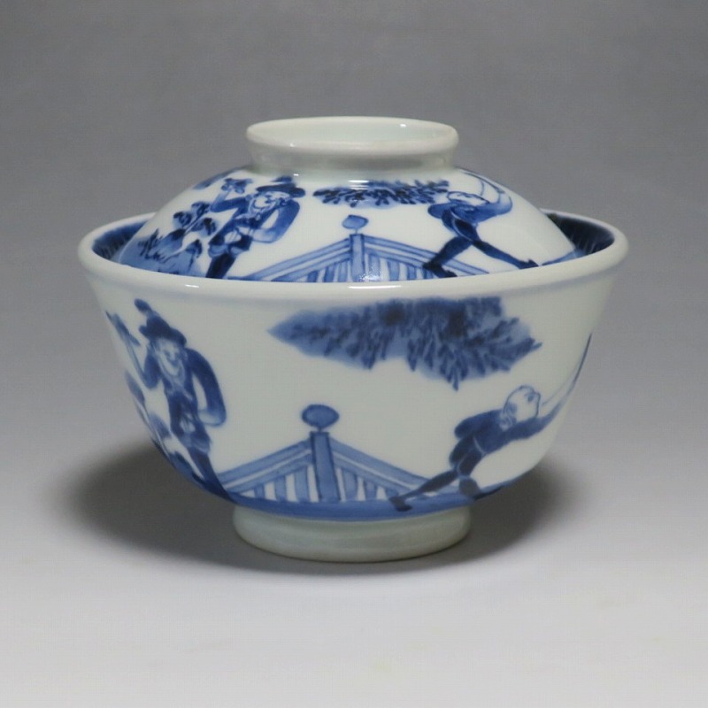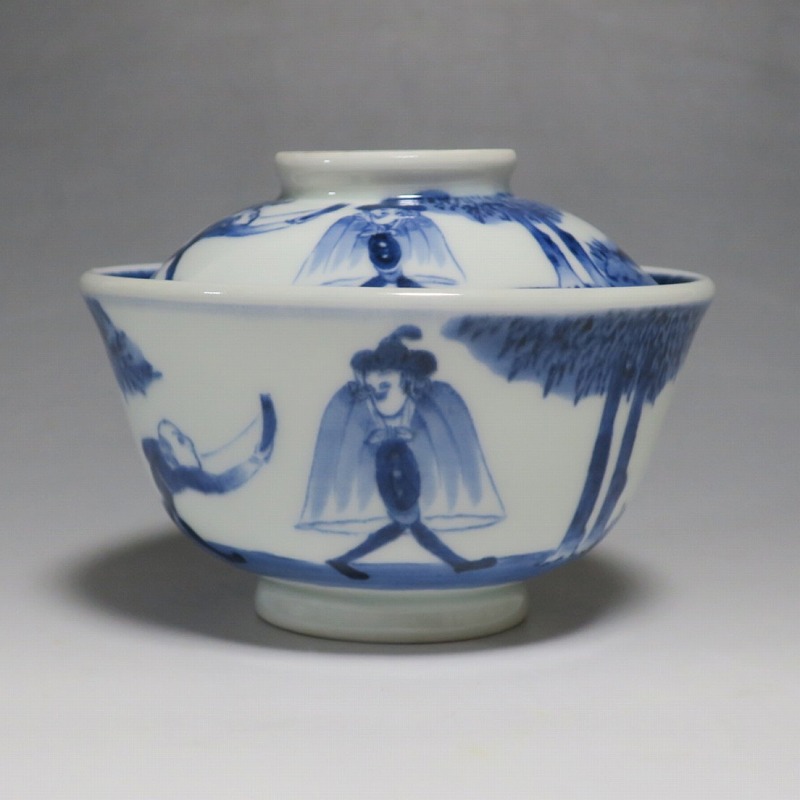 (江戸時代後期 18世紀後半) 商品番号 4102 口径 約12cm/高さ 約7cm 窯傷や蓋の持ち手部分に薄い当たり跡があります。状態は写真でご確認ください。 18世紀後半、長崎に伝播した蘭学や清学が流行します。その影響は磁器作品にも及び、有田では南蛮人を描いた作品が作られるようになりました。本品は経済政策を推進した田沼時代に作られた染付の南蛮人蓋茶碗。美しい呉須の発色、興味深い南蛮人の様子を描いた作品です。見ていると江戸時代の日蘭貿易の雰囲気が伝わってきます。観賞用、食器としてお楽しみください。 | ||