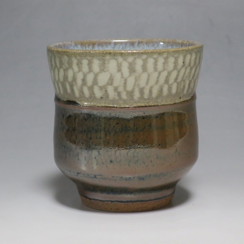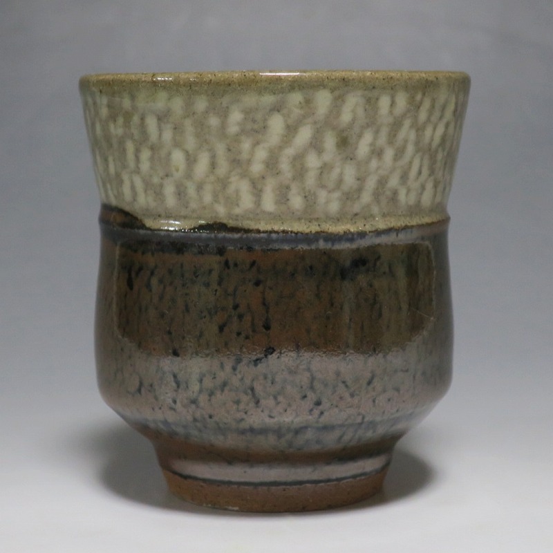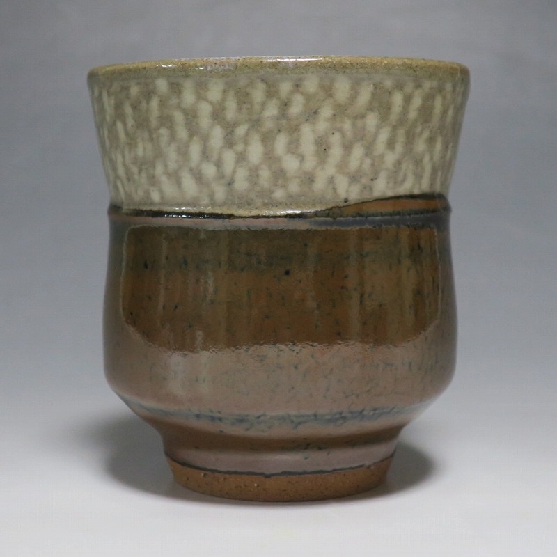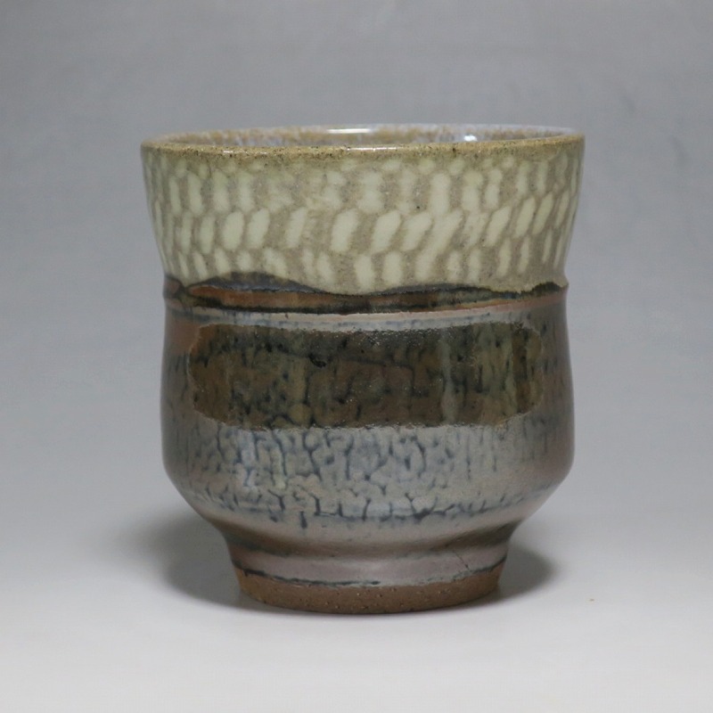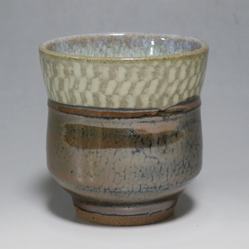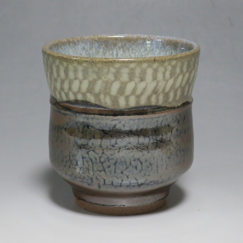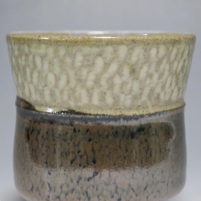 小 口径 約8cm/高さ 約7.7cm 総じて良い状態です。状態は写真でご確認ください。 島岡達三(1919年〜2007年、東京都生まれ)は昭和・平成時代に活躍した益子焼の陶芸家です。濱田庄司に師事し、「縄文象嵌技法」を考案、民芸陶器の重要無形文化財技術保持者(人間国宝)となりました。近年は外国人や若者の間で、民芸調の島岡作品は人気が集まっています。本品は島岡の代名詞ともいえる縄文象嵌の湯飲み。1980年前後に作られた作品です。島岡独特の上部に施された象嵌海鼠釉と下部の鉄釉の対比が美しい湯呑です。島岡が作った湯呑の中でもグットデザインの作品。本作でお茶を飲むと美味しいでしょう。 | ||