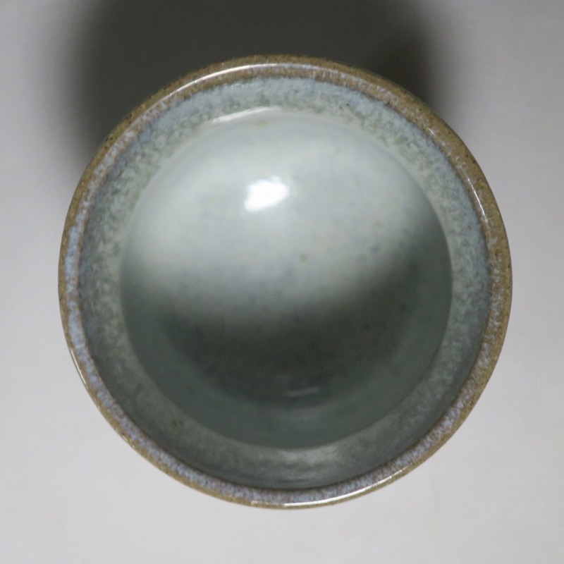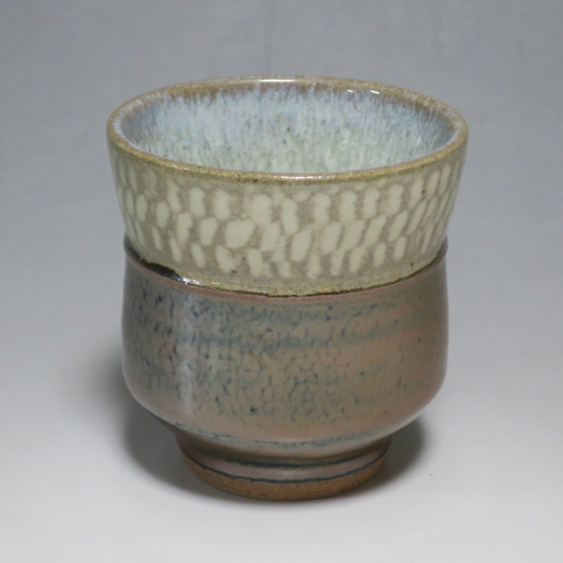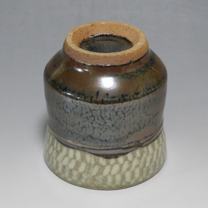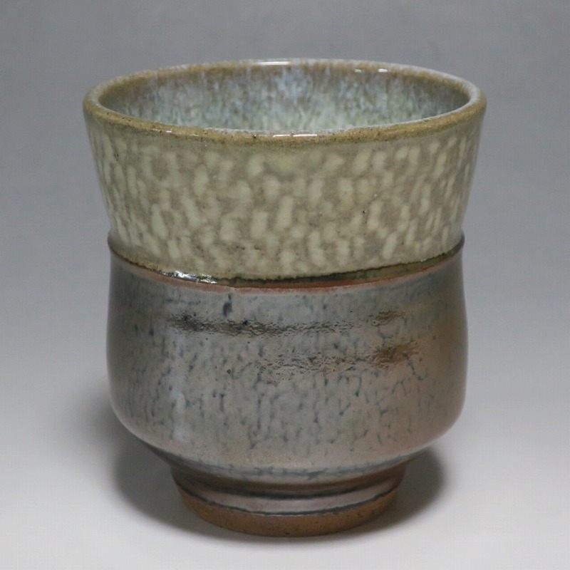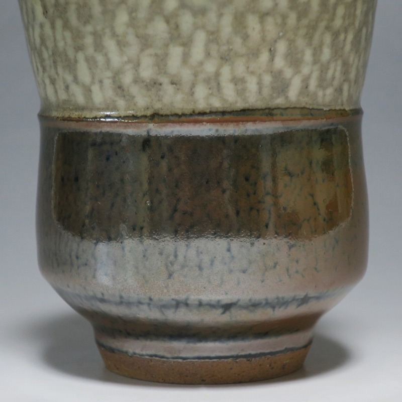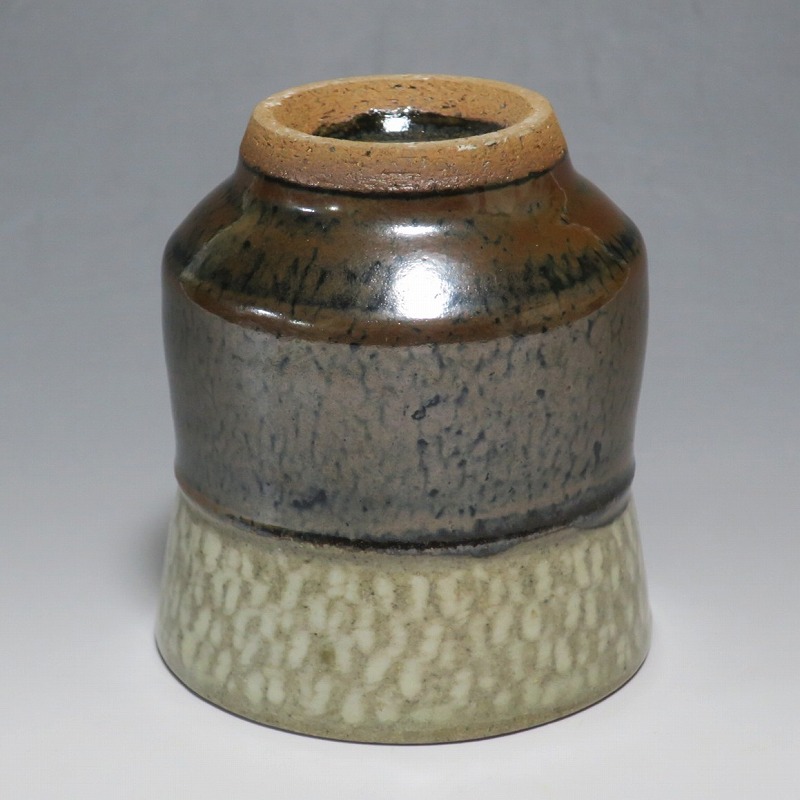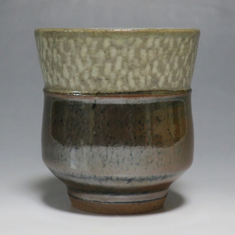 小 口径 約8cm/高さ 約7.7cm 総じて良い状態です。状態は写真でご確認ください。 島岡達三(1919年〜2007年、東京都生まれ)は昭和・平成時代に活躍した益子焼の陶芸家です。濱田庄司に師事し、「縄文象嵌技法」を考案、民芸陶器の重要無形文化財技術保持者(人間国宝)となりました。近年は外国人や若者の間で、民芸調の島岡作品は人気が集まっています。本品は島岡の代名詞ともいえる縄文象嵌の湯飲み。1980年前後に作られた作品です。島岡独特の上部に施された象嵌海鼠釉と下部の鉄釉の対比が美しい湯呑です。島岡が作った湯呑の中でもグットデザインの作品。本作でお茶を飲むと美味しいでしょう。 | ||