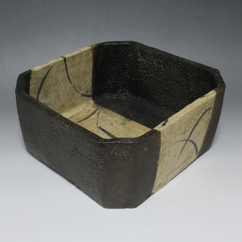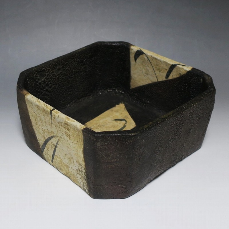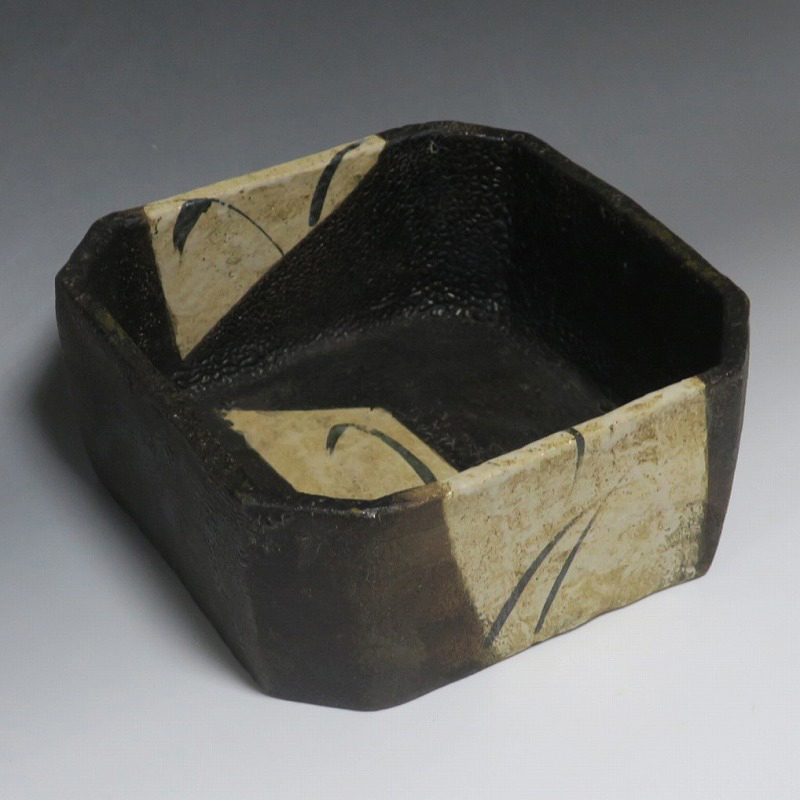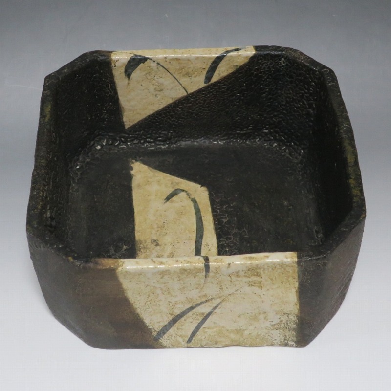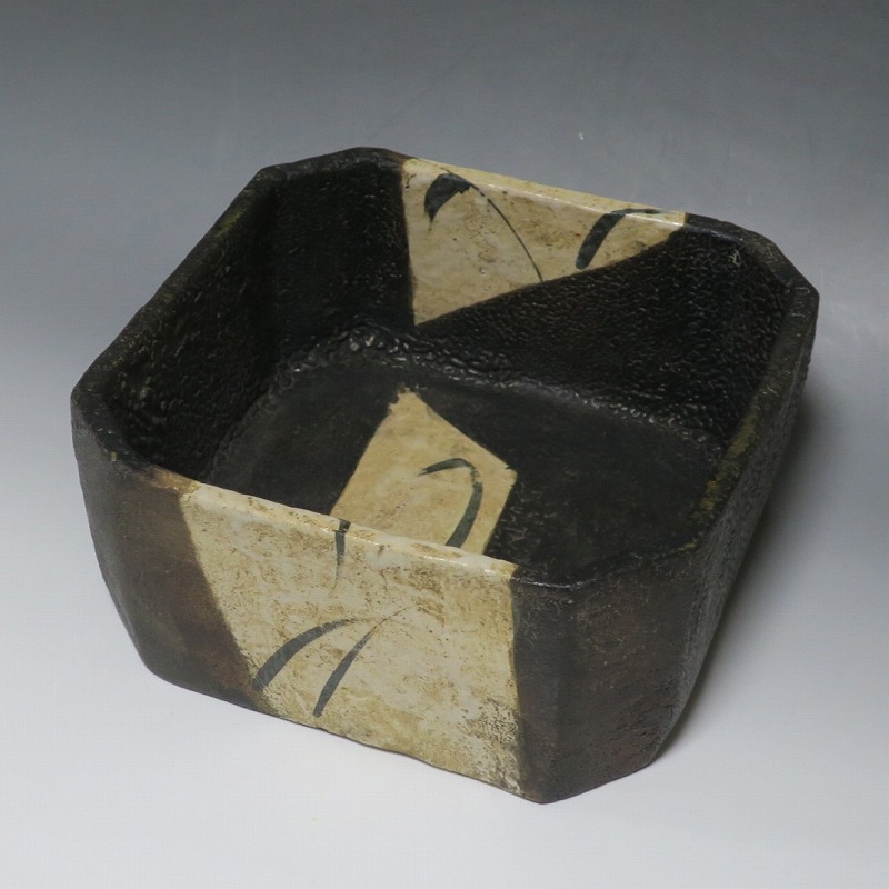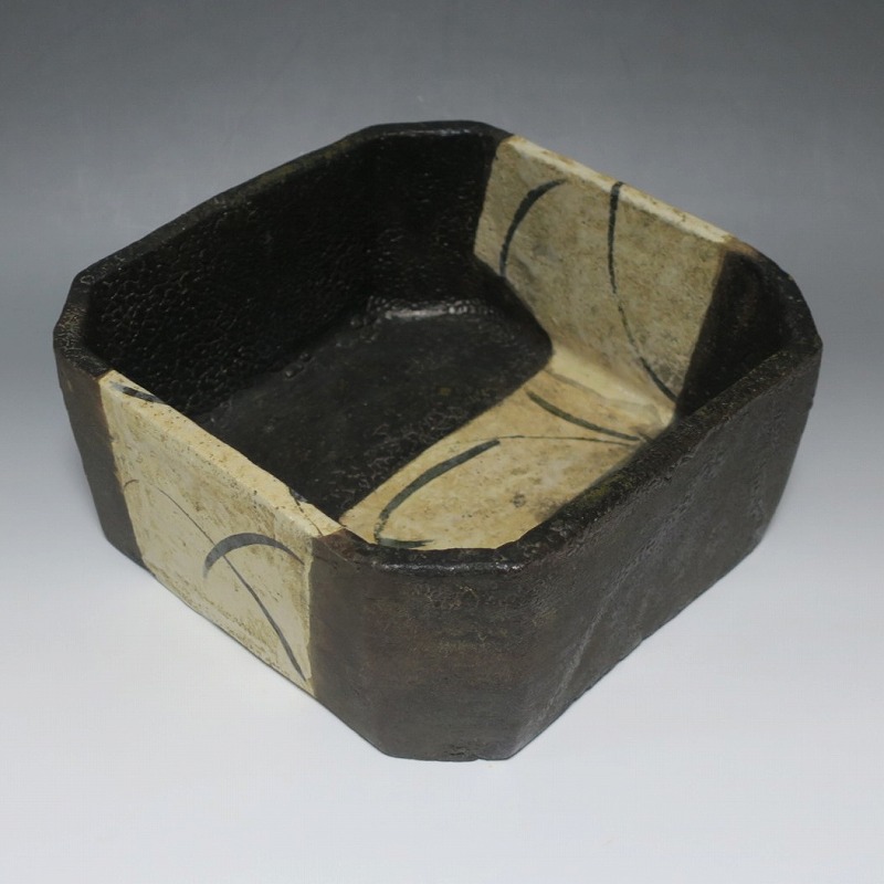 (江戸時代後期 19世紀前半) 商品番号 4115 口径 約22.9cm×23.5cm/高さ 約10.5cm 保存箱付き 窯傷はありますが、総じて良い状態です。状態は写真でご確認ください。 織部焼は桃山時代、武将の古田織部の好みによってデザインされた美濃産の焼物です。歪みや独特の絵付けの面白さで一世を風靡しました。織部焼は江戸時代前期に一時廃れますが、18世紀後半に再生産が始まると様々な作品が製作され人気を取り戻しました。本品は江戸時代後期に作られた黒織部の草文隅切り大鉢。直線的な黒の幾何学と曲線の草文を組み合わせたモダンな作品です。江戸時代の陶工のセンスの良さを感じさせてくれる一品。お茶の菓子器の他、料理を盛る食器として使用できます。 | ||