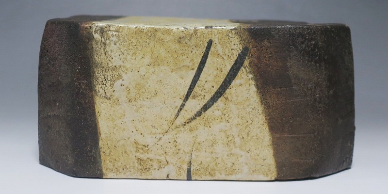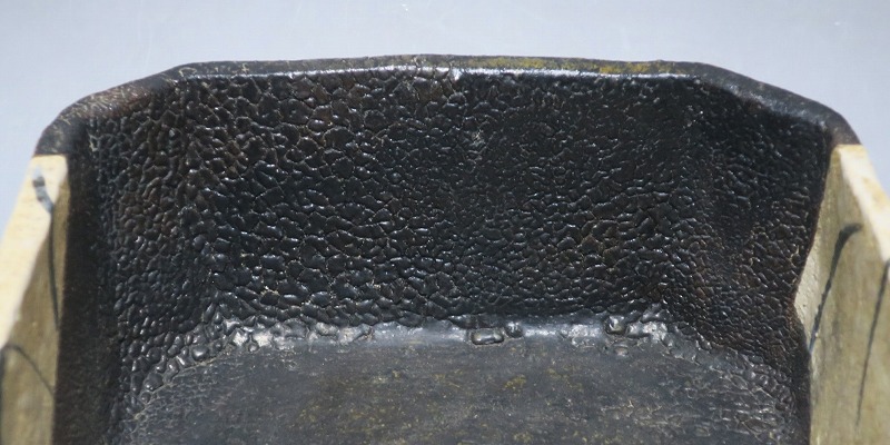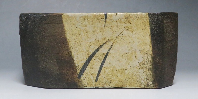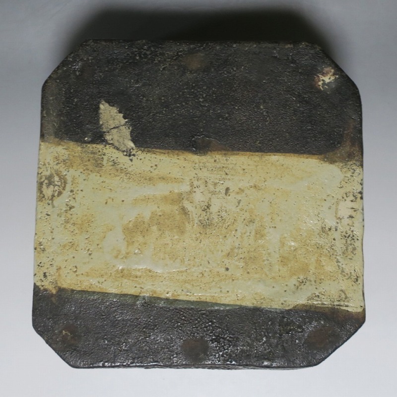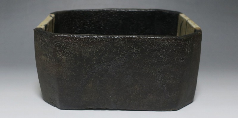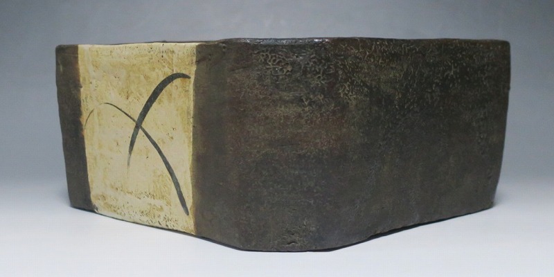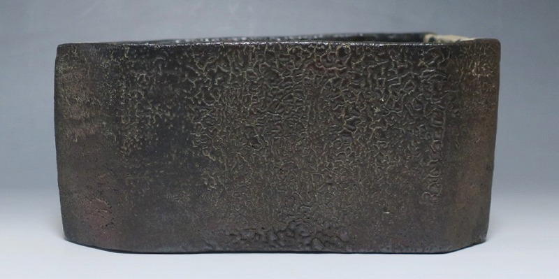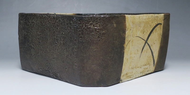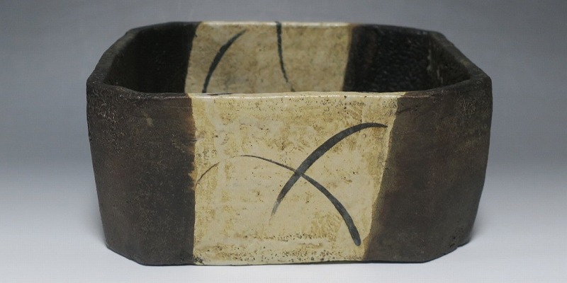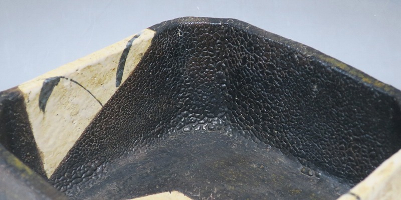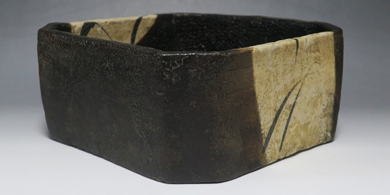(江戸時代後期 19世紀前半) 商品番号 4115 口径 約22.9cm×23.5cm/高さ 約10.5cm 保存箱付き 窯傷はありますが、総じて良い状態です。状態は写真でご確認ください。 織部焼は桃山時代、武将の古田織部の好みによってデザインされた美濃産の焼物です。歪みや独特の絵付けの面白さで一世を風靡しました。織部焼は江戸時代前期に一時廃れますが、18世紀後半に再生産が始まると様々な作品が製作され人気を取り戻しました。本品は江戸時代後期に作られた黒織部の草文隅切り大鉢。直線的な黒の幾何学と曲線の草文を組み合わせたモダンな作品です。江戸時代の陶工のセンスの良さを感じさせてくれる一品。お茶の菓子器の他、料理を盛る食器として使用できます。 | ||