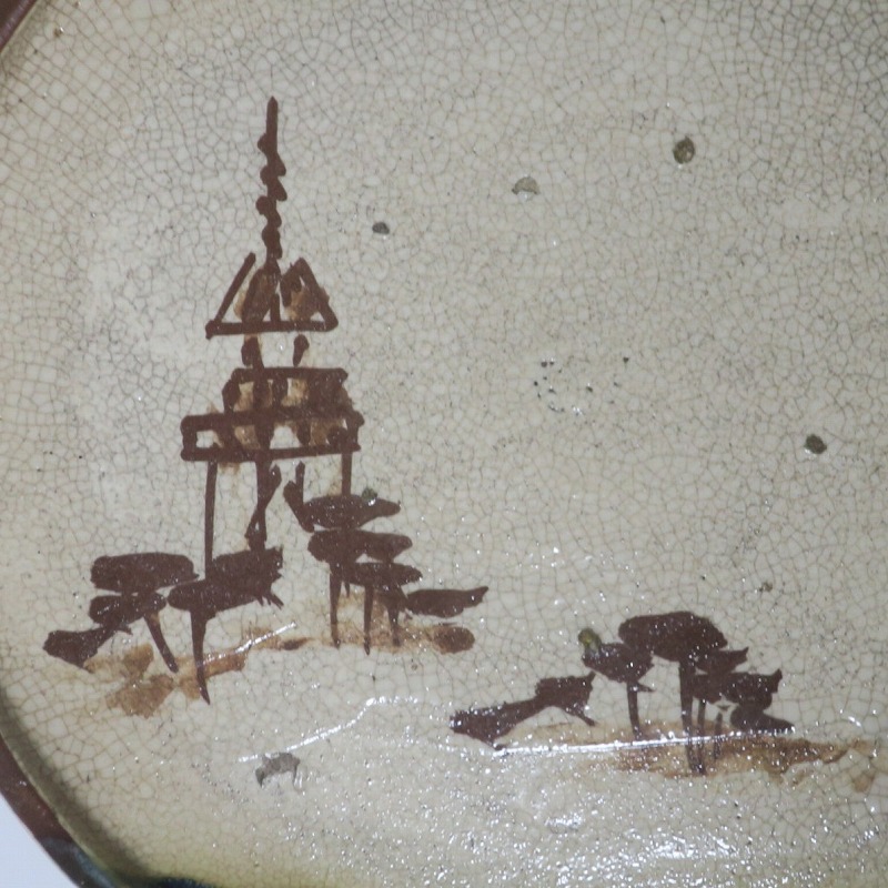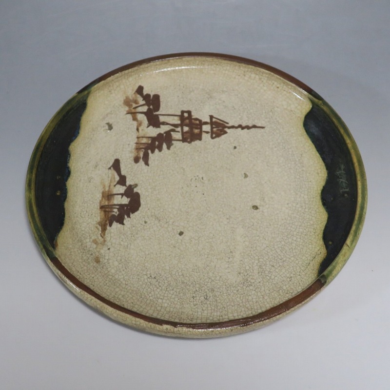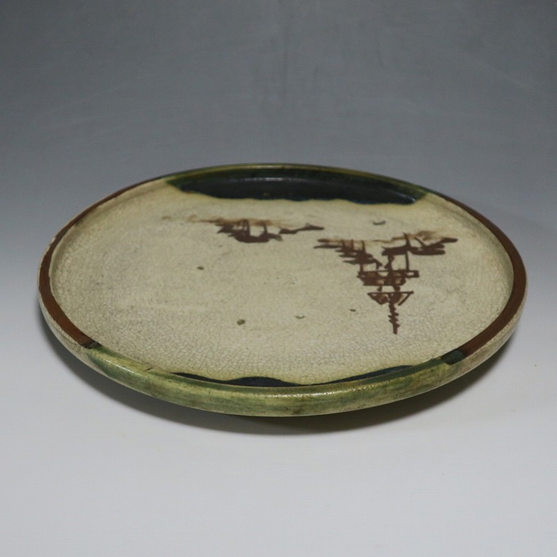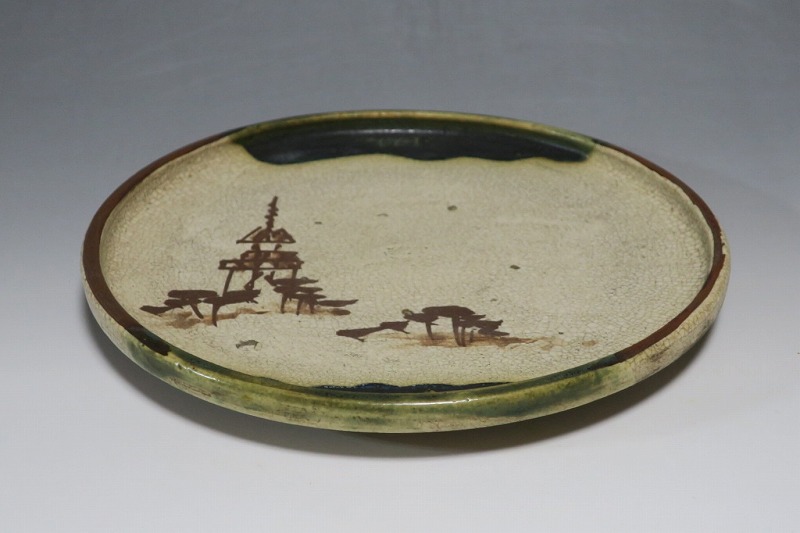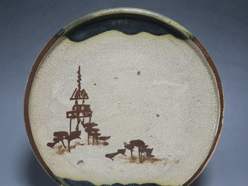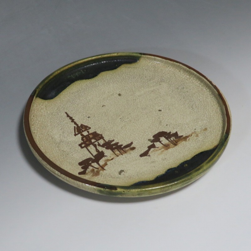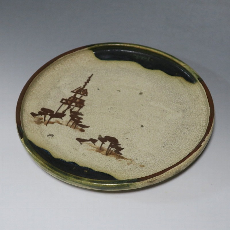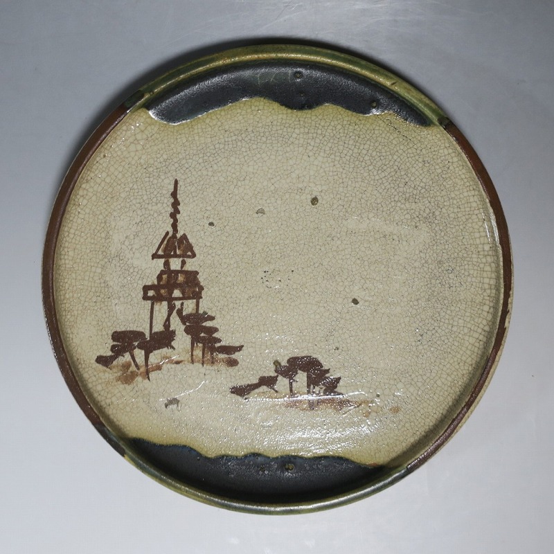 口径 約cm21.7/高さ 約2.7cm 窯傷はありますが、総じて良い状態です。状態は写真でご確認ください。 行燈皿は、灯火器から滴り落ちる油を受けるために行燈箱の上に置いて使用した受け皿です。瀬戸や美濃地方が主要な生産地で、鉄絵で絵を描いた絵瀬戸や緑釉を使った織部の行燈皿があります。本品は美濃焼で作られた織部の行燈皿。鉄絵で塔が描かれ、緑釉が空と野原のようなデザインになっています。状態の良い風情のある行燈皿です。飾り皿の他、和食器としても使用できます。 | ||