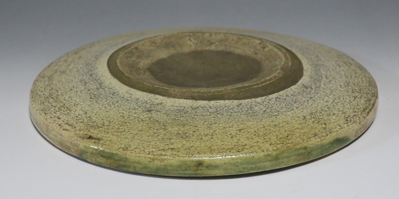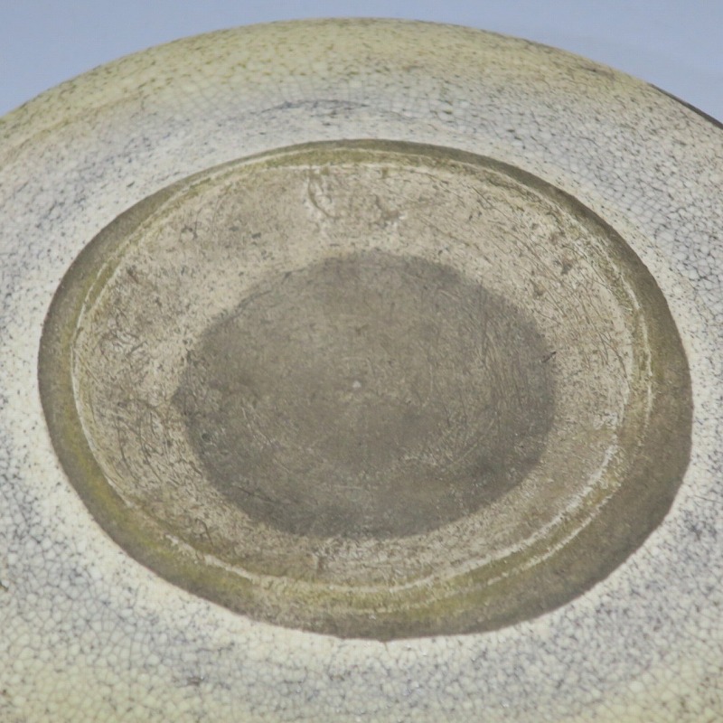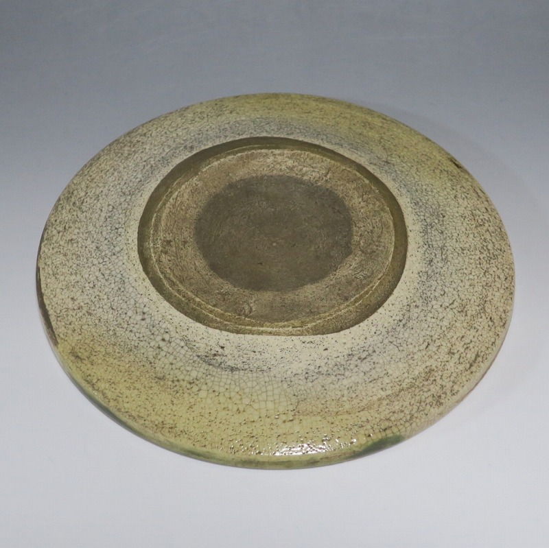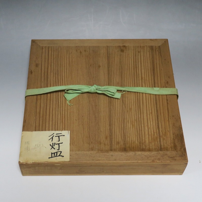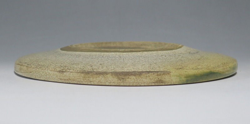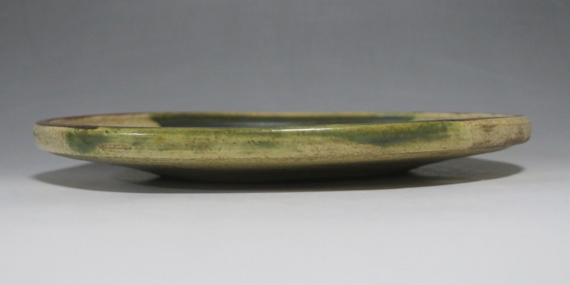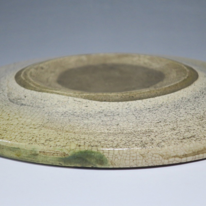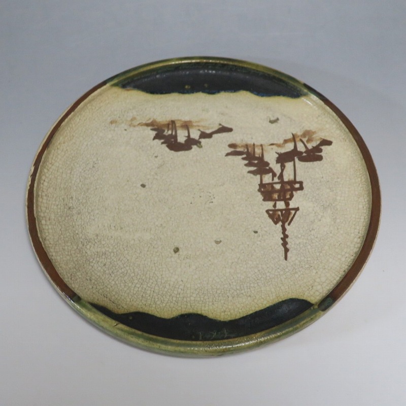 口径 約cm21.7/高さ 約2.7cm 窯傷はありますが、総じて良い状態です。状態は写真でご確認ください。 行燈皿は、灯火器から滴り落ちる油を受けるために行燈箱の上に置いて使用した受け皿です。瀬戸や美濃地方が主要な生産地で、鉄絵で絵を描いた絵瀬戸や緑釉を使った織部の行燈皿があります。本品は美濃焼で作られた織部の行燈皿。鉄絵で塔が描かれ、緑釉が空と野原のようなデザインになっています。状態の良い風情のある行燈皿です。飾り皿の他、和食器としても使用できます。 | ||
