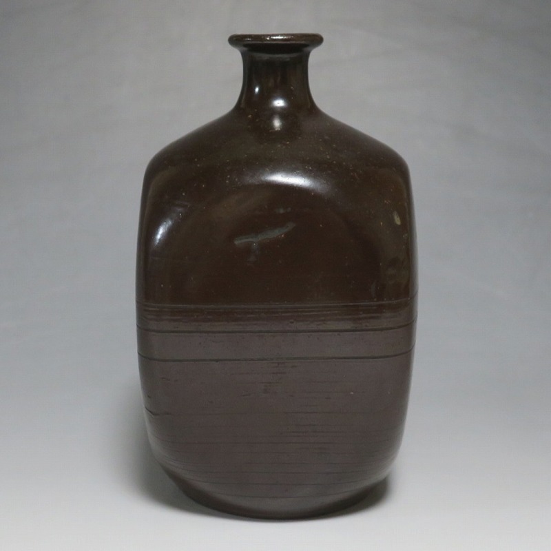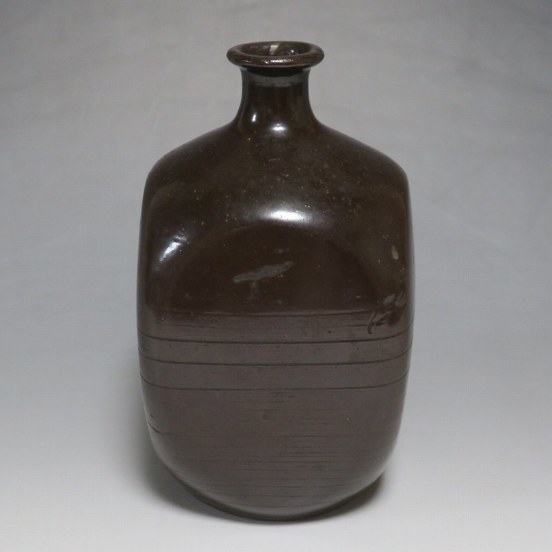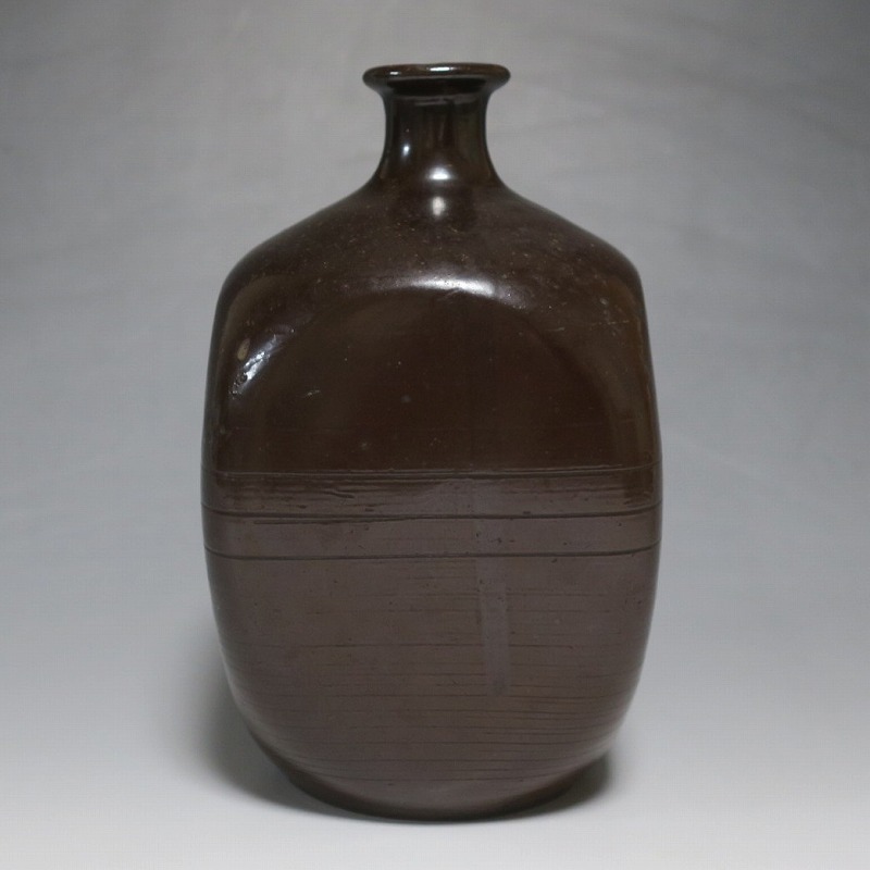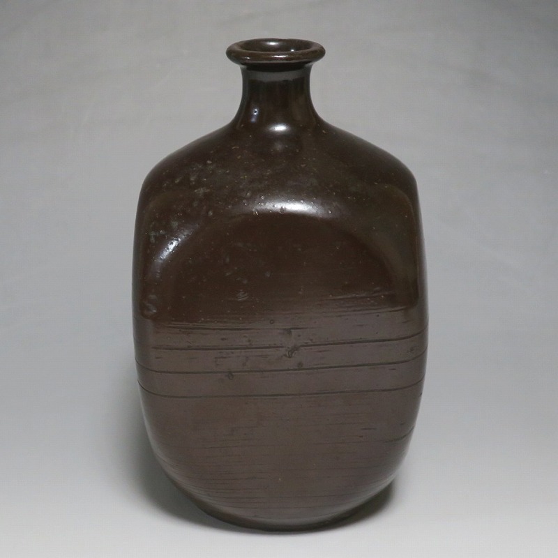 高さ 約17.3cm/胴径 約10.3cm 窯傷はありますが、完品です。状態は写真でご確認ください。 丹波焼は、兵庫県今田町周辺で生産される焼物です。中世六古窯の一つで、窯は鎌倉時代初期から現在まで続いています。江戸時代後期、窯が立杭に移ると丹波焼の陶技も多彩になり、様々な装飾が施された日常雑器を製作しました。本品は幕末期に作られた栗皮釉の掛かった角徳利。江戸ガラスの徳利を写した作品です。オランダから輸入されたジンボトルが本品のような徳利の起源となっています。他の窯では見かけることのない個性的な造形で、民芸の面白さを感じることができます。インテリア、酒器としてお楽しみください。 | ||