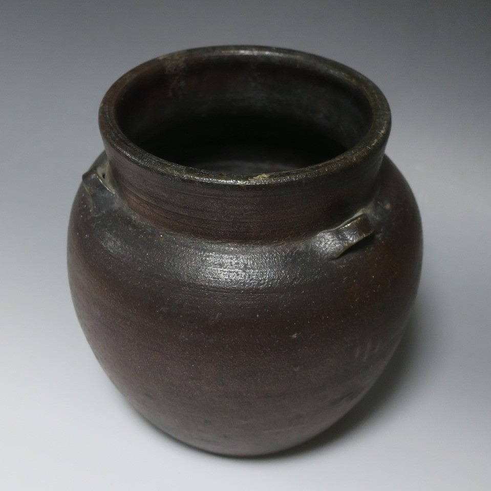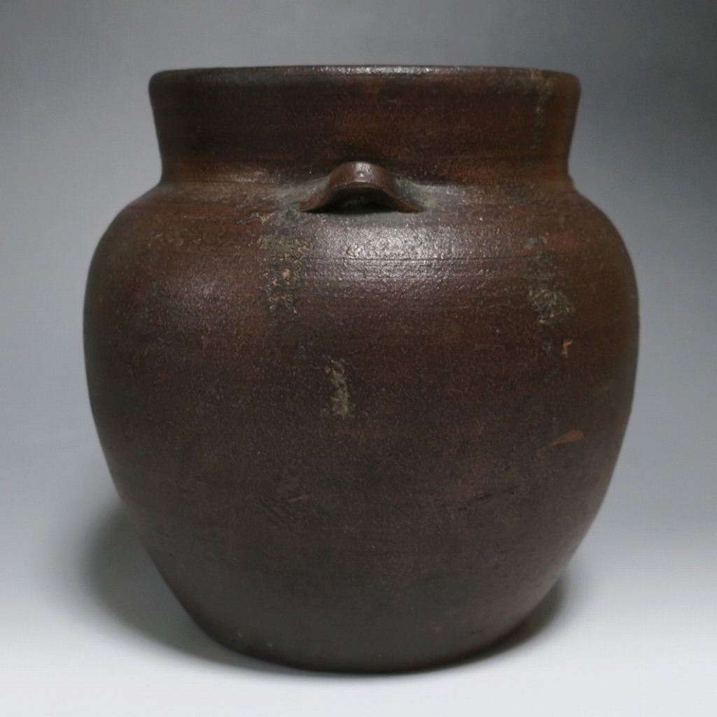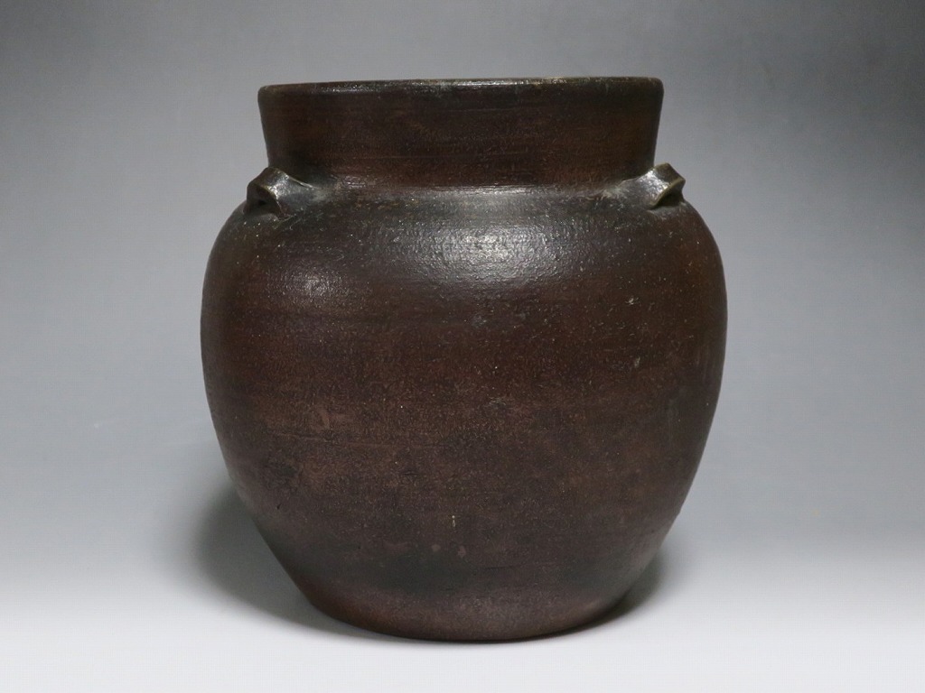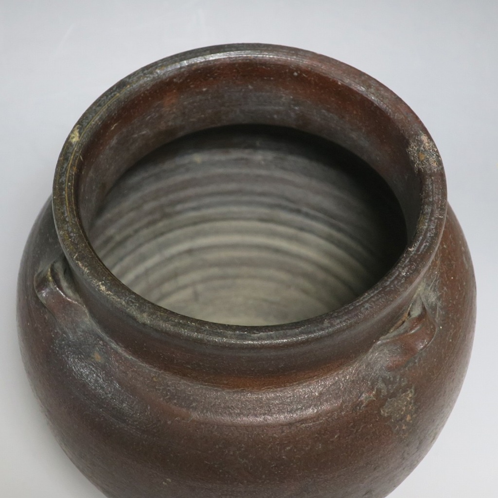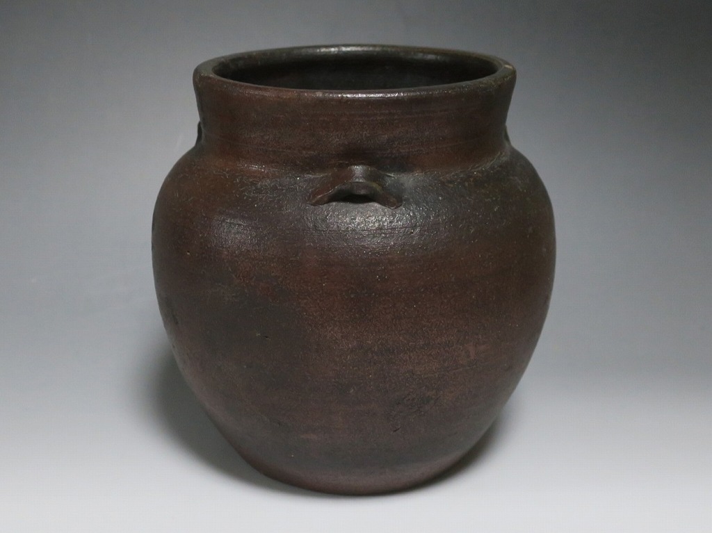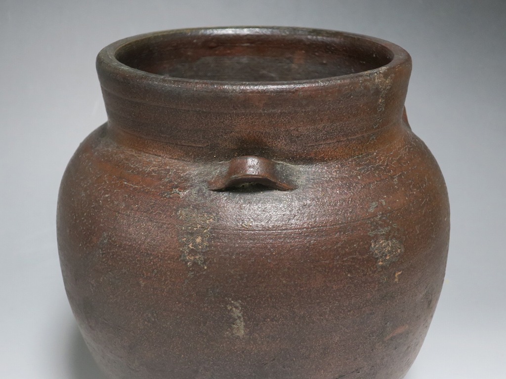 高さ 約19.5cm/胴径 約19cm 窯傷はありますが、総じて良い状態です。状態は写真でご確認ください。 備前焼は、古代から備前市周辺(岡山県)で製作される須恵器(b器)の流れを汲む焼物です。中世六古窯の一つで桃山時代は茶陶を作る窯として栄え、現在に至っています。本品は生活雑器として作られた三耳壺。種もみや銭などを保存する容器です。珍しい三耳が付いた胴部に丸みのある作品。備前焼独特の雰囲気があります。インテリア、花器としてお楽しみください。 | ||