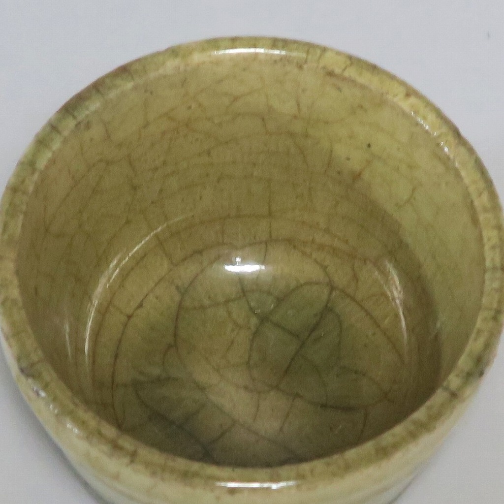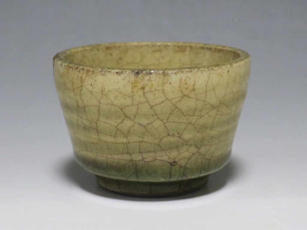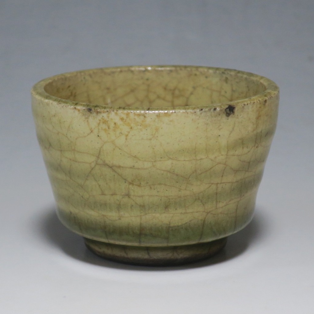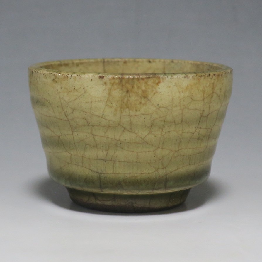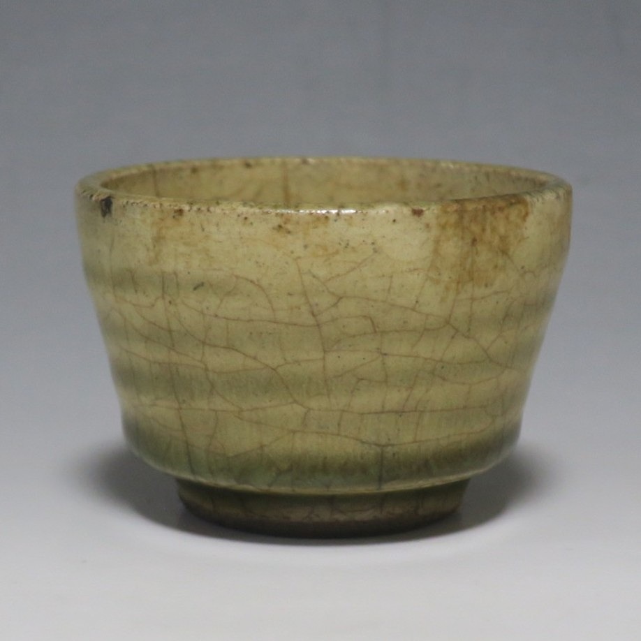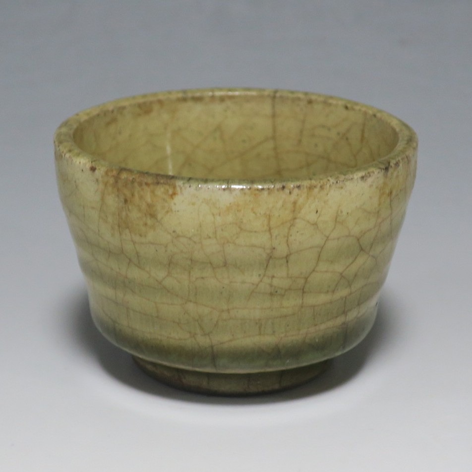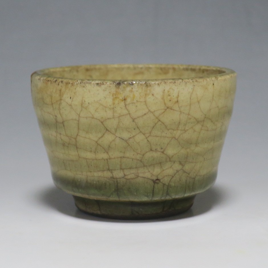 (明治時代 19世紀後半) 商品番号 4126 口径 約7cm/高さ 約5cm/高台径 約4cm 経年の汚れや窯傷はありますが、総じて良い状態です。状態は写真でご確認ください。 御深井焼は江戸時代前期、尾張藩の御用窯として開かれた名古屋城内に開かれた窯です。18世紀に入ると御深井焼の生産は停滞しますが、十代藩主・斉朝(1793年〜1850年)の時代になると窯が復興し、活発な生産活動を始めます。 本品は江戸時代後期に作られた御深井焼のぐい呑み。美しい灰釉の掛かった作品です。大きさから想像すると煎茶器として作られた作品だったと考えられます。すり切りで約90t入ります。日本酒用の酒器としてお楽しみください。 | ||