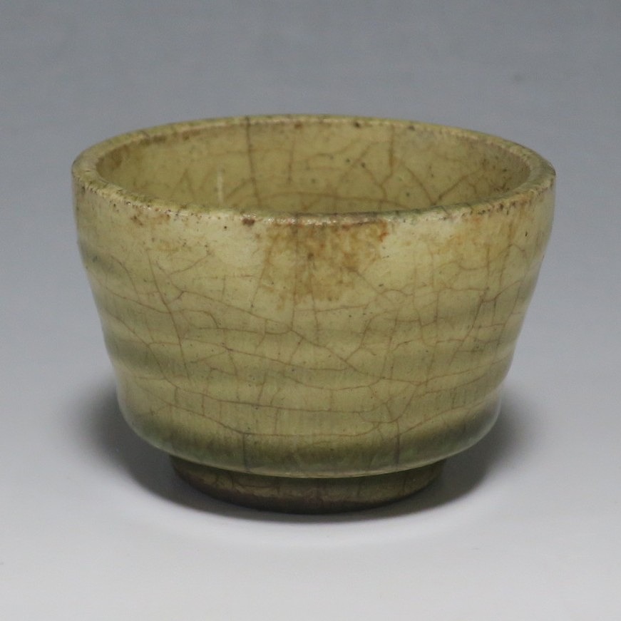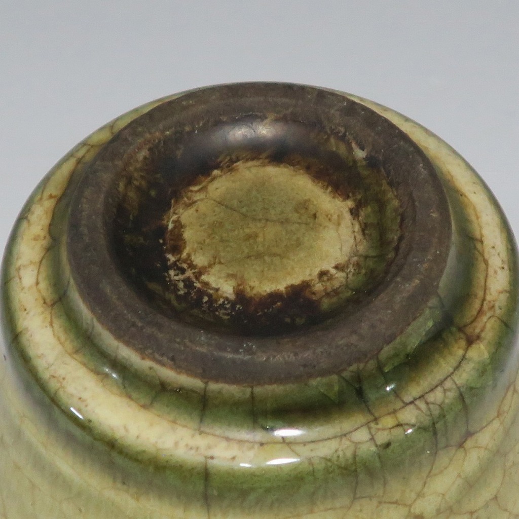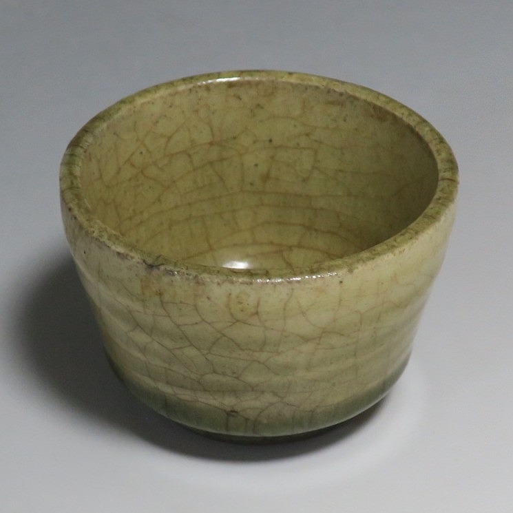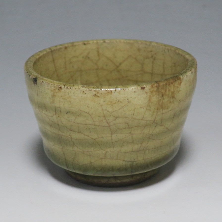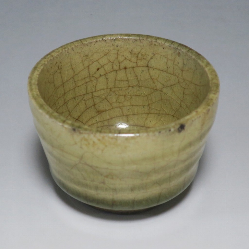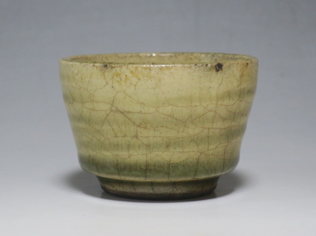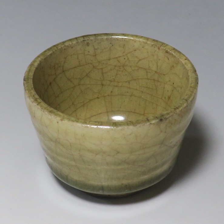 (明治時代 19世紀後半) 商品番号 4126 口径 約7cm/高さ 約5cm/高台径 約4cm 経年の汚れや窯傷はありますが、総じて良い状態です。状態は写真でご確認ください。 御深井焼は江戸時代前期、尾張藩の御用窯として開かれた名古屋城内に開かれた窯です。18世紀に入ると御深井焼の生産は停滞しますが、十代藩主・斉朝(1793年〜1850年)の時代になると窯が復興し、活発な生産活動を始めます。 本品は江戸時代後期に作られた御深井焼のぐい呑み。美しい灰釉の掛かった作品です。大きさから想像すると煎茶器として作られた作品だったと考えられます。すり切りで約90t入ります。日本酒用の酒器としてお楽しみください。 | ||