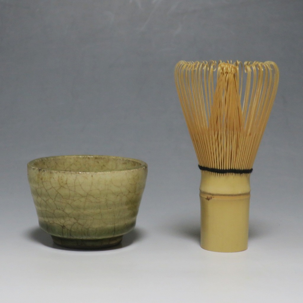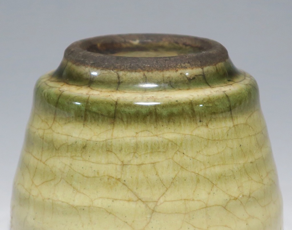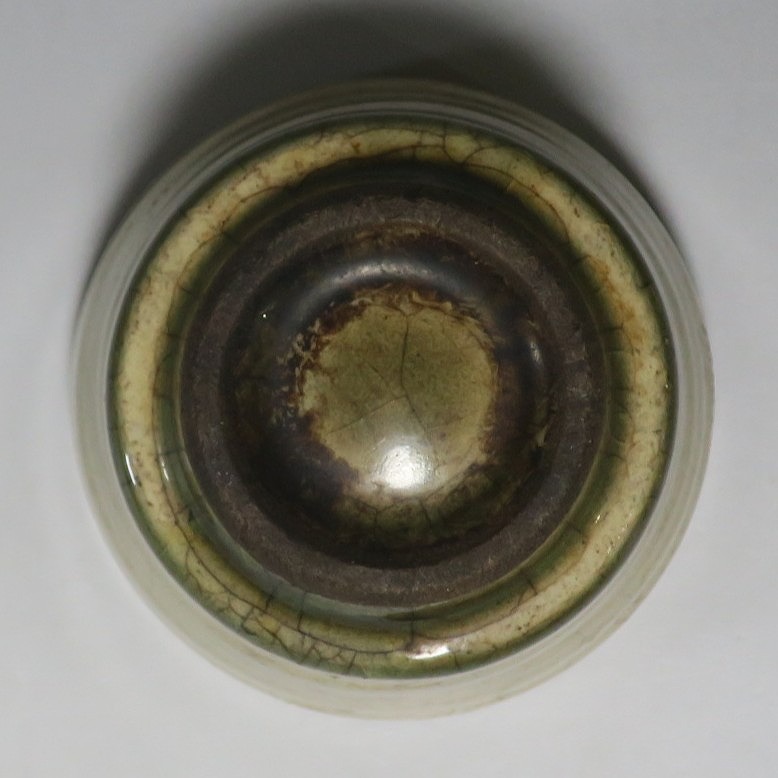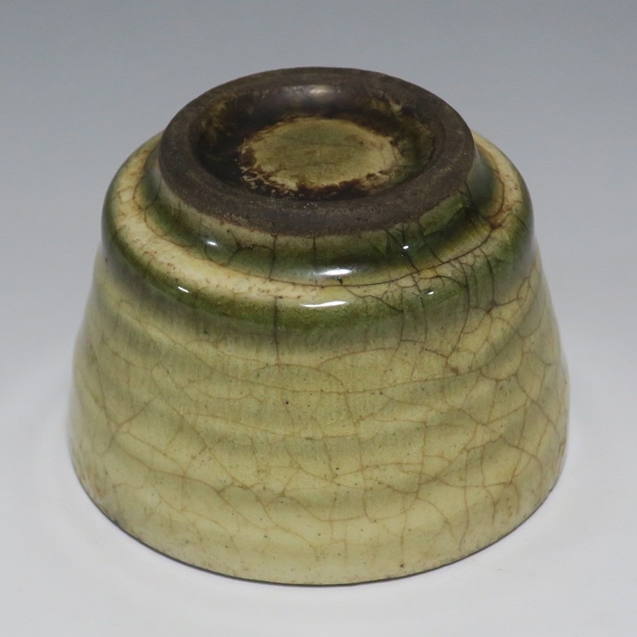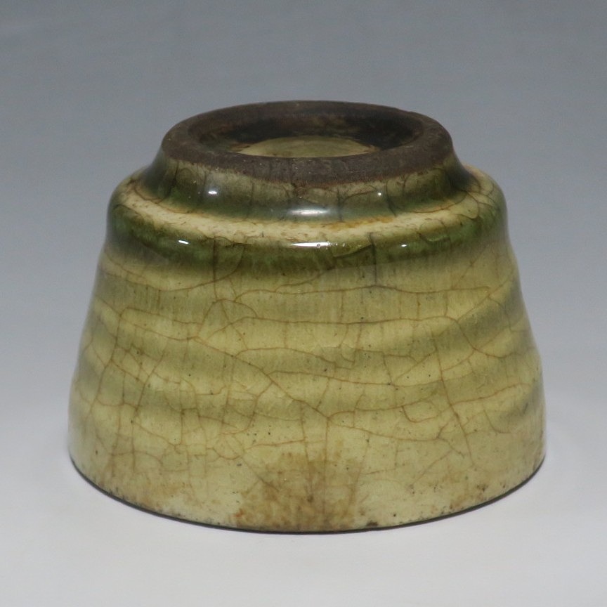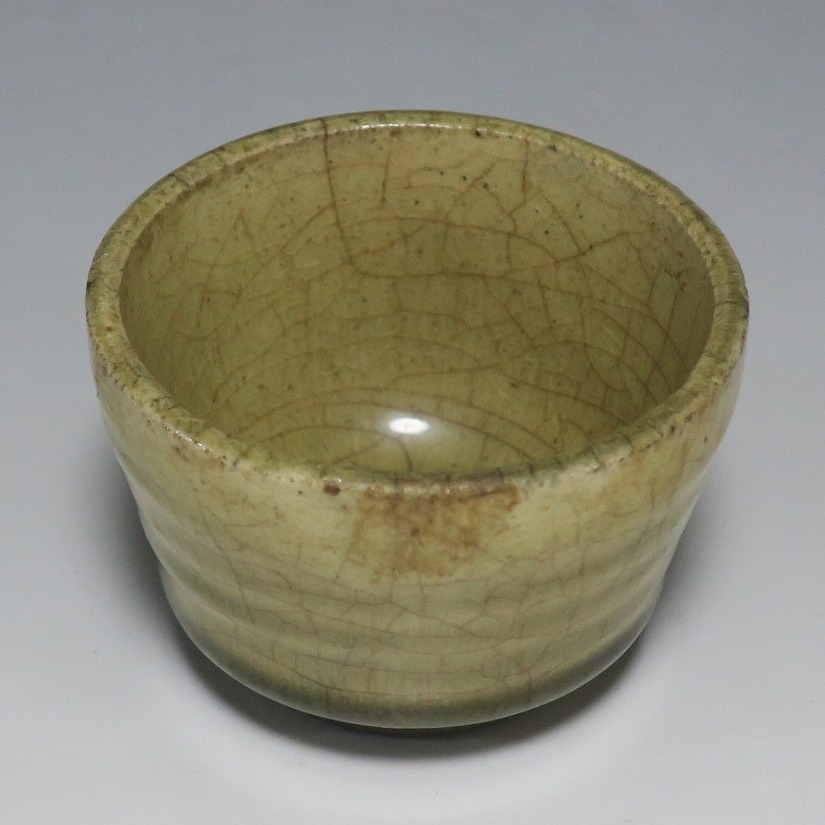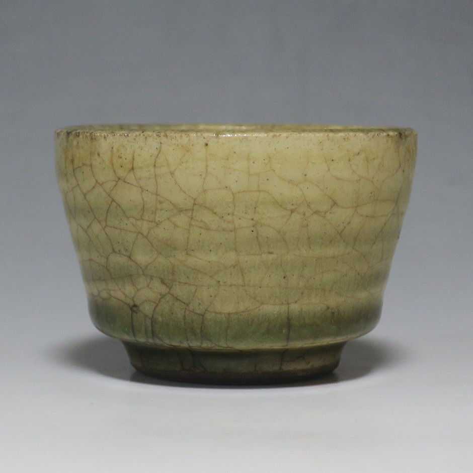 (明治時代 19世紀後半) 商品番号 4126 口径 約7cm/高さ 約5cm/高台径 約4cm 経年の汚れや窯傷はありますが、総じて良い状態です。状態は写真でご確認ください。 御深井焼は江戸時代前期、尾張藩の御用窯として開かれた名古屋城内に開かれた窯です。18世紀に入ると御深井焼の生産は停滞しますが、十代藩主・斉朝(1793年〜1850年)の時代になると窯が復興し、活発な生産活動を始めます。 本品は江戸時代後期に作られた御深井焼のぐい呑み。美しい灰釉の掛かった作品です。大きさから想像すると煎茶器として作られた作品だったと考えられます。すり切りで約90t入ります。日本酒用の酒器としてお楽しみください。 | ||