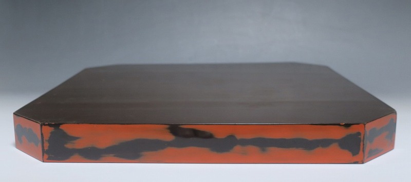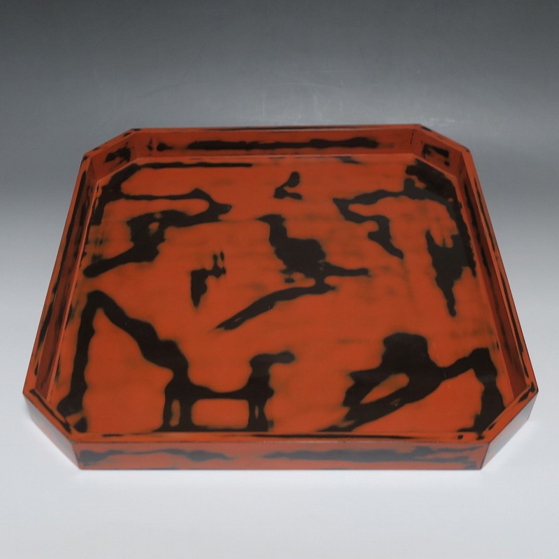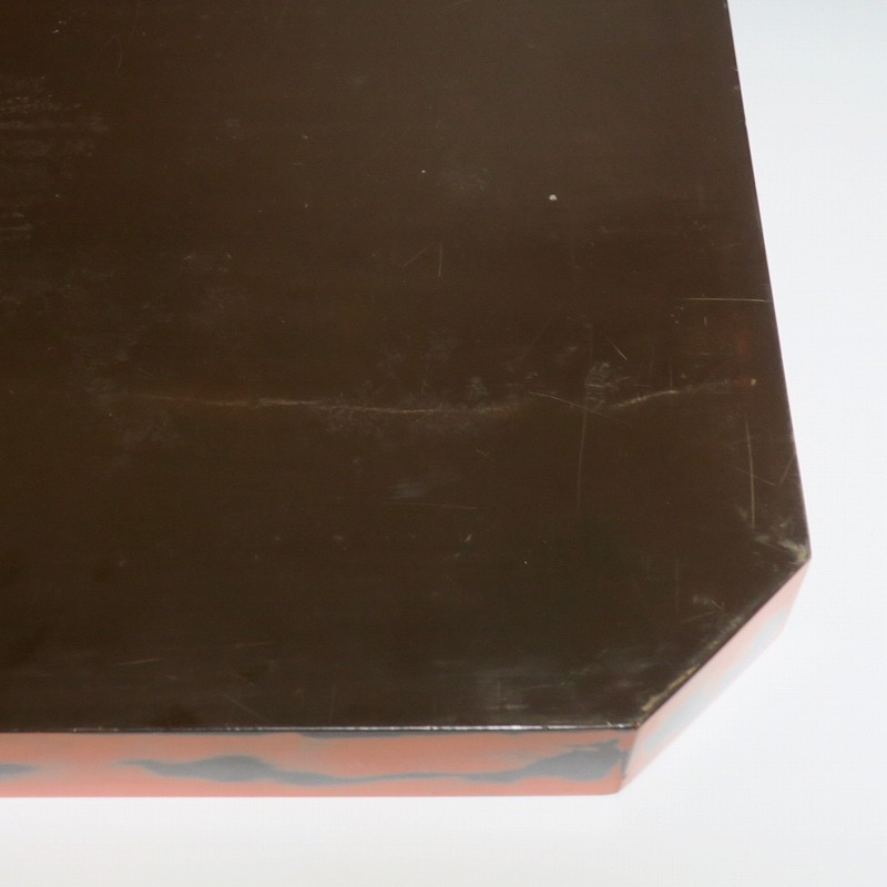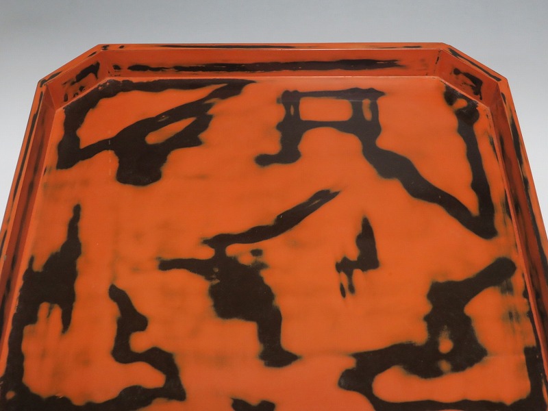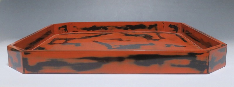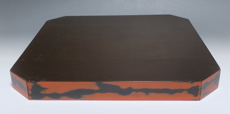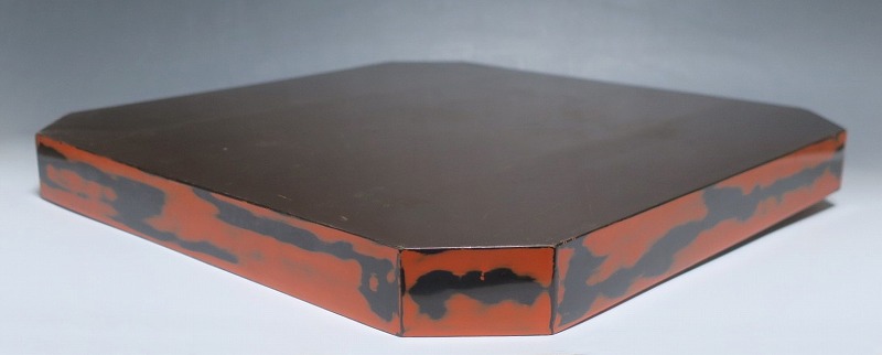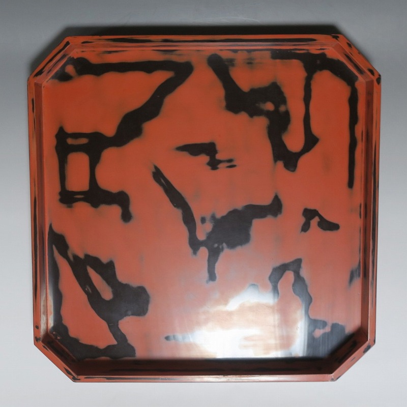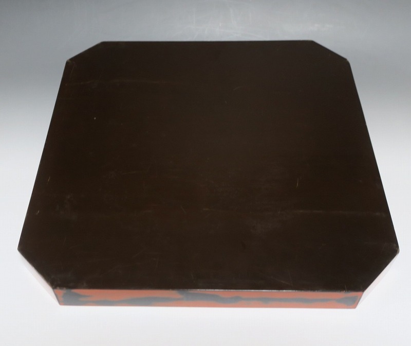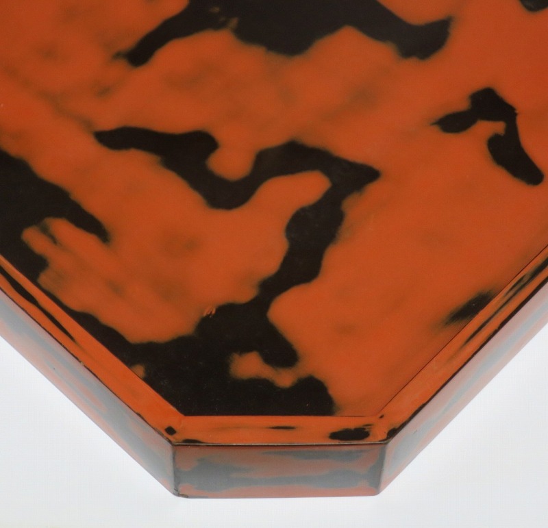 (明治時代 19世紀後半) 商品番号 4127 横幅 約36.7cm角/高さ 約3.7cm 一部に経年のスレがあります。状態は写真でご確認ください。 根来塗は鎌倉時代、紀伊・根来寺の真言僧が主導して始まった漆工芸です。堅牢にするため黒塗を塗った後、その上に朱漆を塗り重ねました。江戸時代中期まで漆は貴重品で金と同等の価値があったと言われています。本品は明治時代後期に作られた根来塗様式の朱漆隅切り盆。黒い部分を意図的にデザインした作品です。明治36年新調の書付のある箱に入っていました。朱と黒の柄が現代美術の抽象作品のように見えます。モダンな感じのする隅切り盆。食器、酒器、飾り台としてご使用ください。 | ||