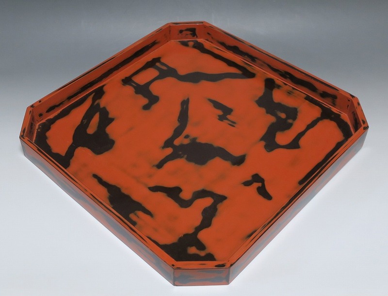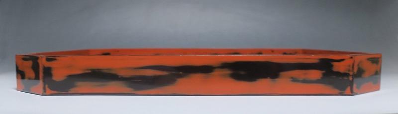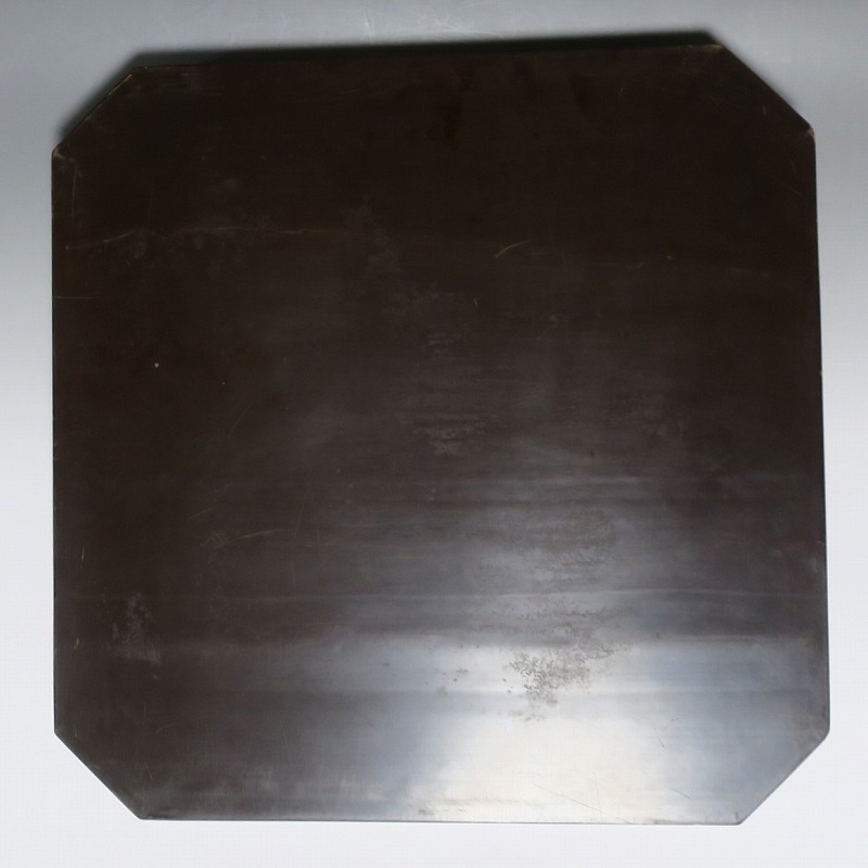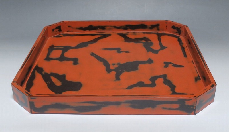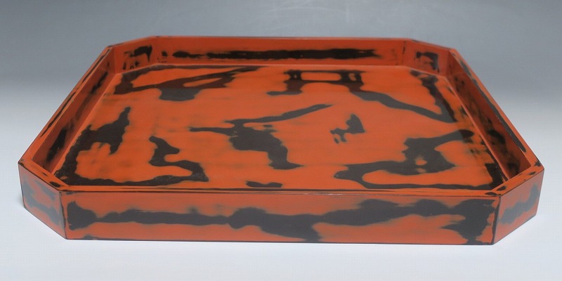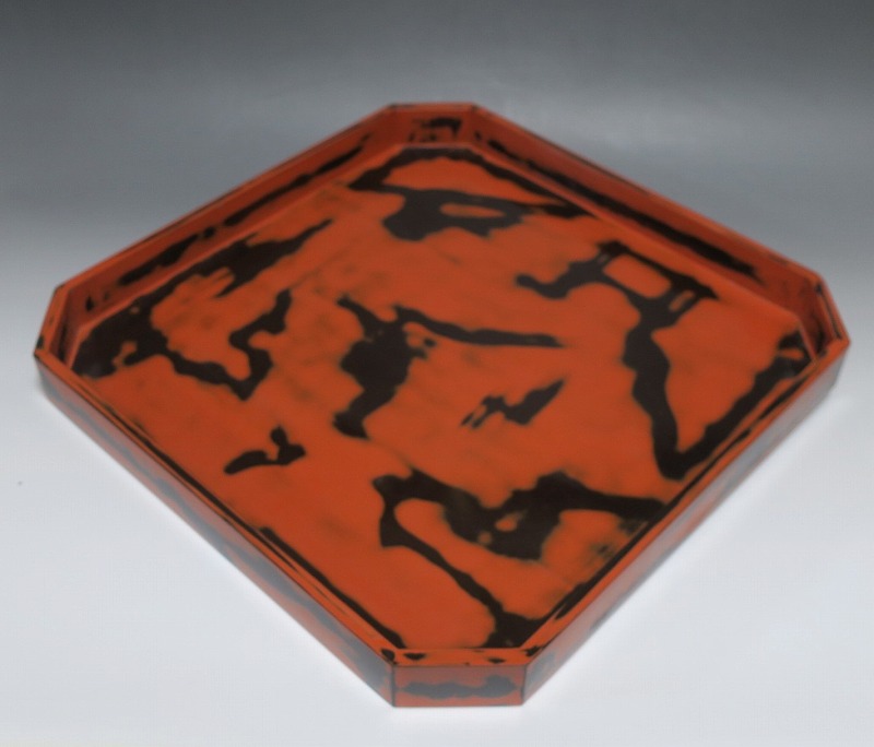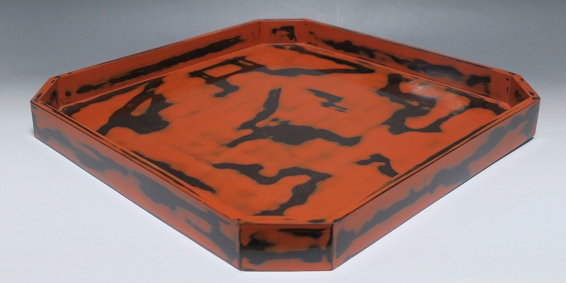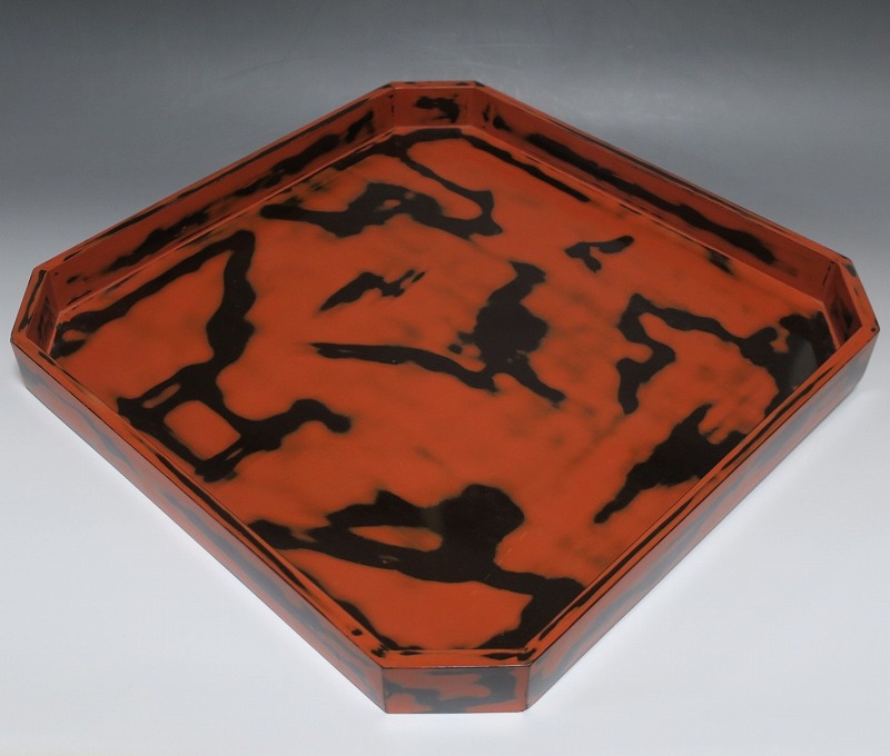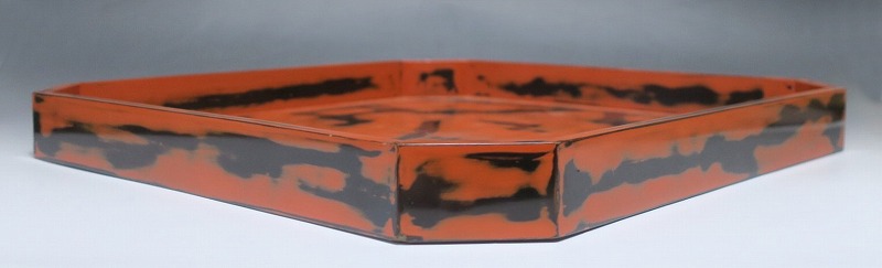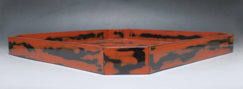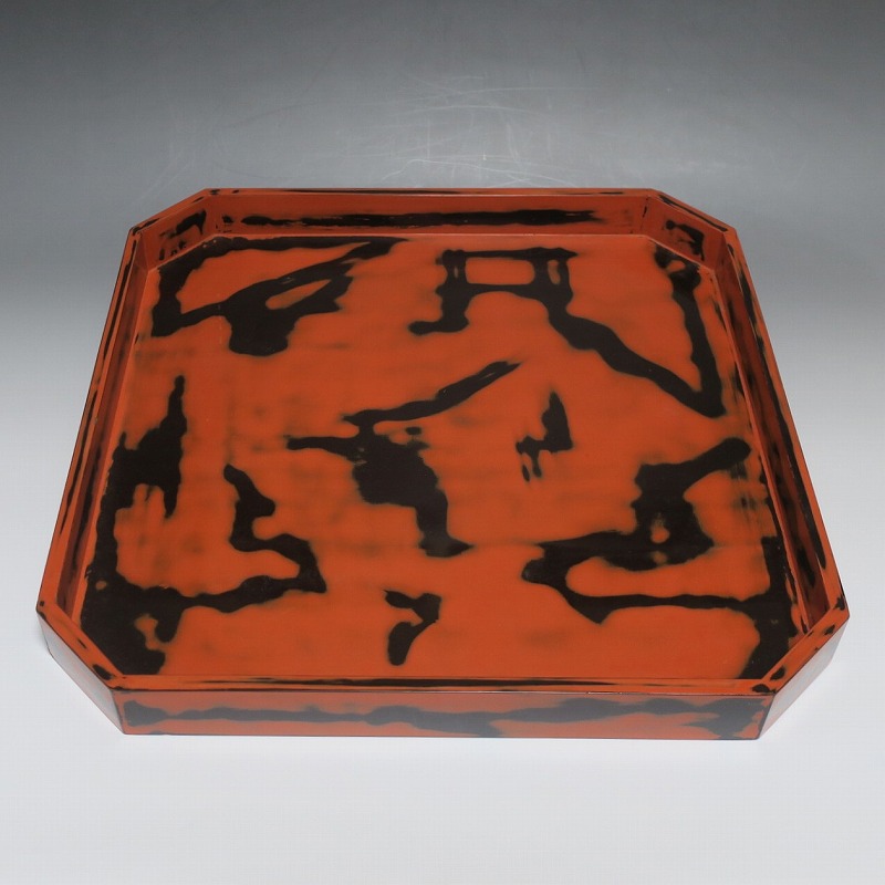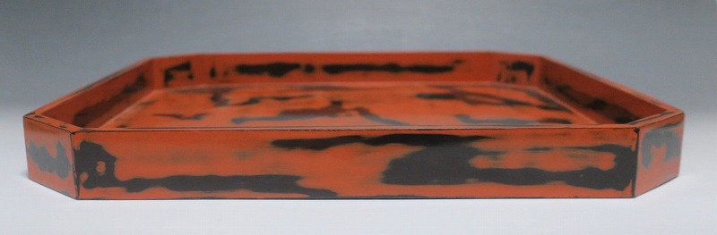 (明治時代 19世紀後半) 商品番号 4127 横幅 約36.7cm角/高さ 約3.7cm 一部に経年のスレがあります。状態は写真でご確認ください。 根来塗は鎌倉時代、紀伊・根来寺の真言僧が主導して始まった漆工芸です。堅牢にするため黒塗を塗った後、その上に朱漆を塗り重ねました。江戸時代中期まで漆は貴重品で金と同等の価値があったと言われています。本品は明治時代後期に作られた根来塗様式の朱漆隅切り盆。黒い部分を意図的にデザインした作品です。明治36年新調の書付のある箱に入っていました。朱と黒の柄が現代美術の抽象作品のように見えます。モダンな感じのする隅切り盆。食器、酒器、飾り台としてご使用ください。 | ||