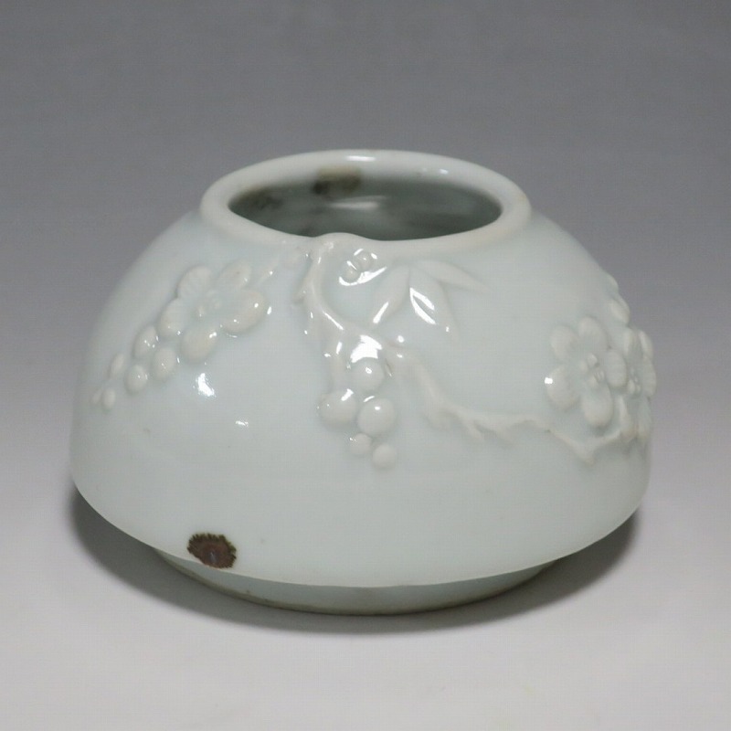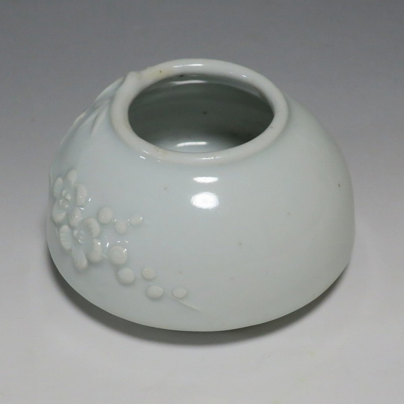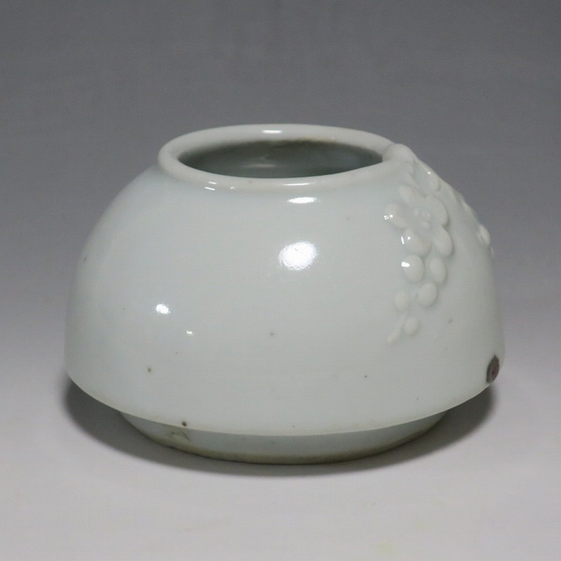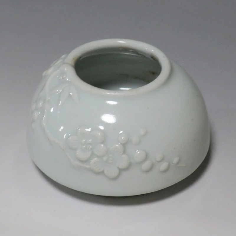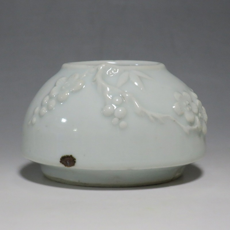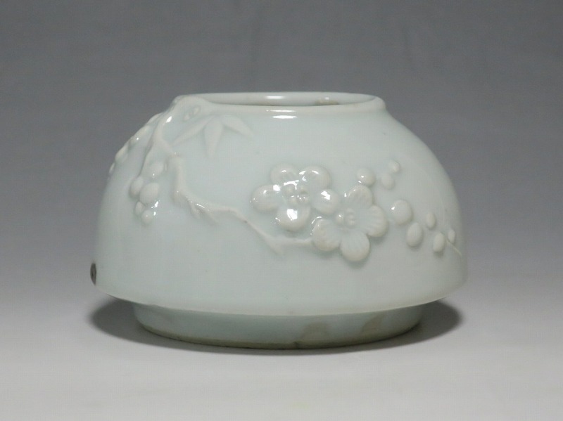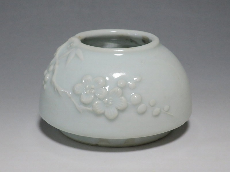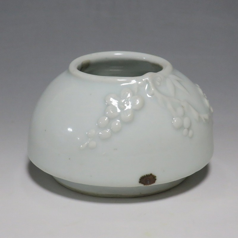 高さ 約5.5cm/胴径 約8.8cm 窯傷はありますが、完品です。状態は写真でご確認ください。 水盂は、書道具のひとつで水を入れる容器です。硯に水を移す際に使い、口が広く、匙で掬って水を汲みます。本品は清朝後期に作られた白磁の陽刻梅笹文水盂。梅文なので正月や春などハレの日に使用された書道具でしょう。小ぶりでかわいい模様が入っています。飾ると華やかさが出ます。他の書道具と一緒に飾るとインテリアとして楽しむことができるでしょう。座辺に置いてお楽しみください。 | ||