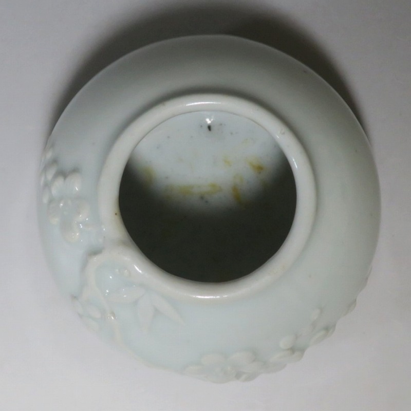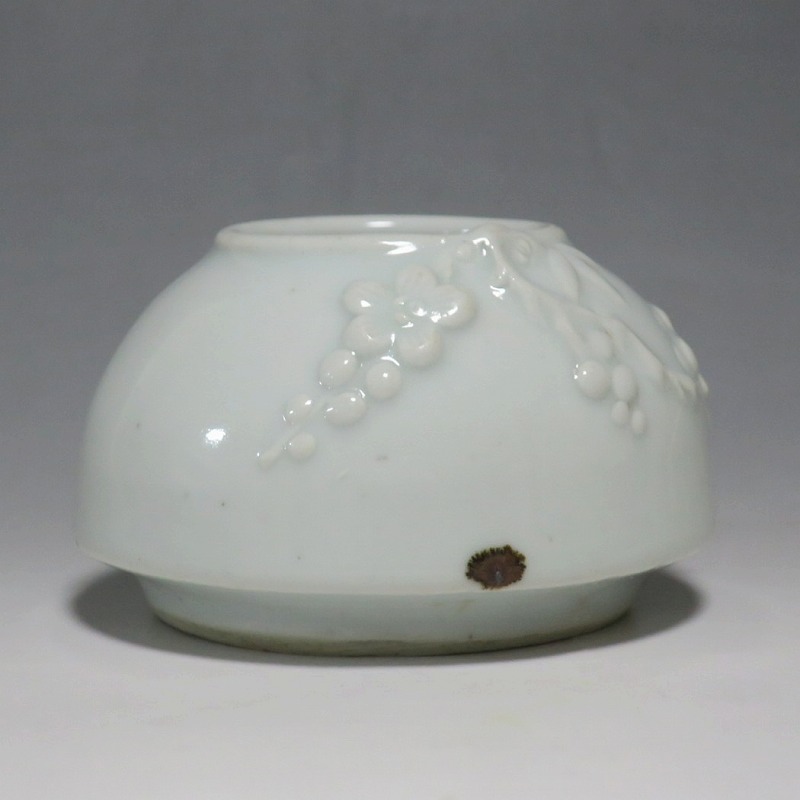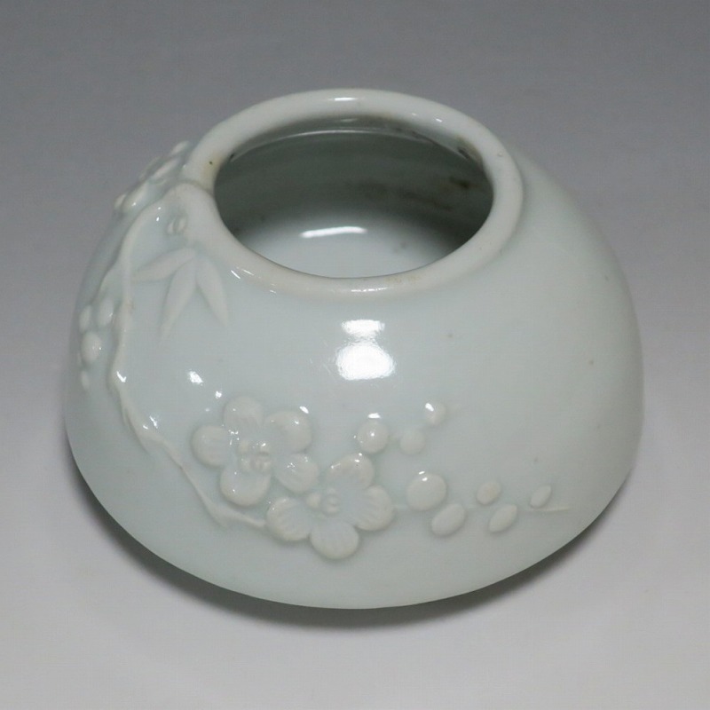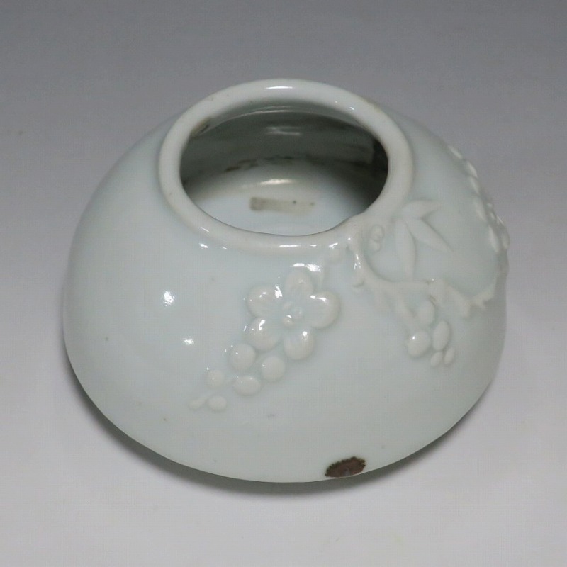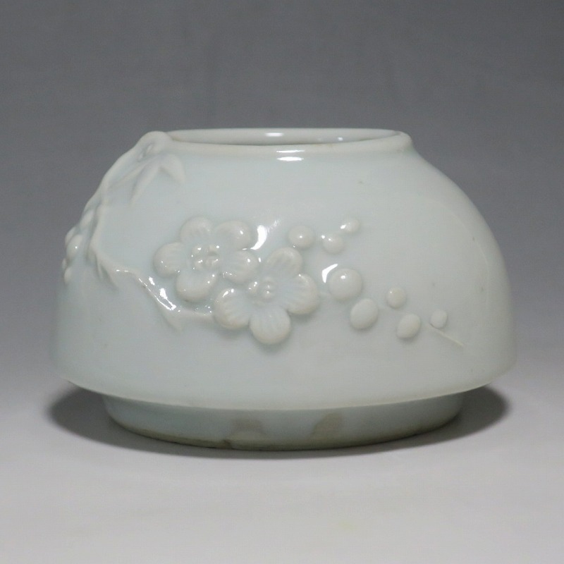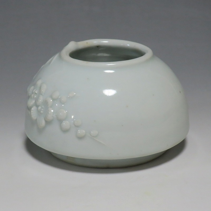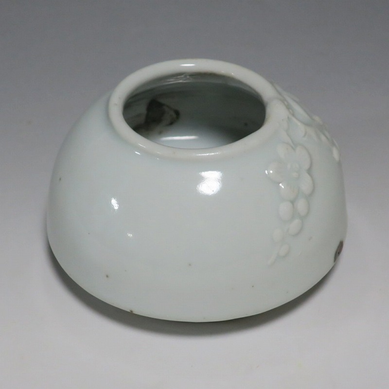 高さ 約5.5cm/胴径 約8.8cm 窯傷はありますが、完品です。状態は写真でご確認ください。 水盂は、書道具のひとつで水を入れる容器です。硯に水を移す際に使い、口が広く、匙で掬って水を汲みます。本品は清朝後期に作られた白磁の陽刻梅笹文水盂。梅文なので正月や春などハレの日に使用された書道具でしょう。小ぶりでかわいい模様が入っています。飾ると華やかさが出ます。他の書道具と一緒に飾るとインテリアとして楽しむことができるでしょう。座辺に置いてお楽しみください。 | ||